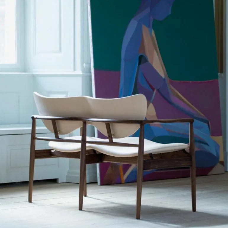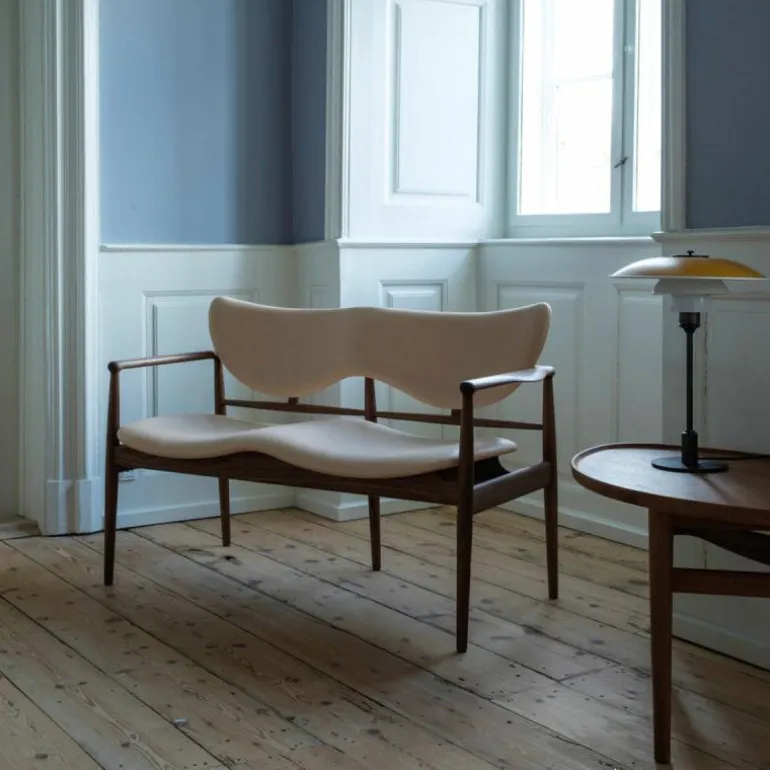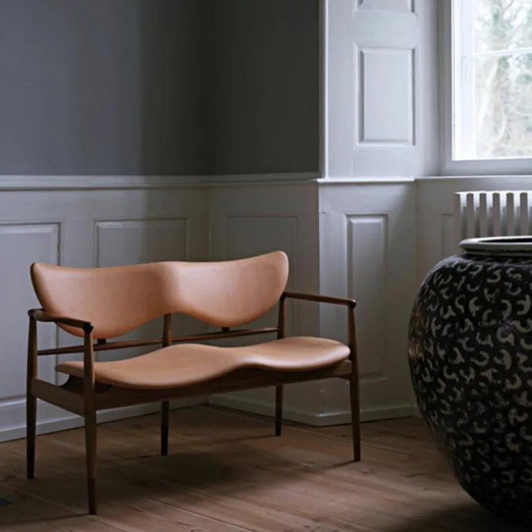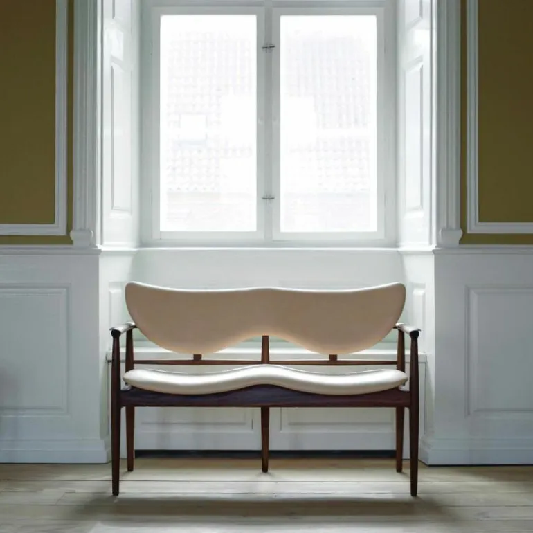 De sierlijke ronde vormen van de rugleuning en zitting geven een prettige zitervaring doordat ze de vormen van het lichaam volgen. De rugleuning en zitting zijn verhoogd op het frame geplaatst op een bijna demonstratieve wijze. Het zorgt voor een uniek ruimtelijk effect en een visueel zwevende zit. Het ontwerp lijkt te spelen met de wetten van de zwaartekracht. Een enkele blik op de 48 Sofa Bench is genoeg om de Deense designstijl van het houten frame te ontdekken: verfijnde houtbewerking met vloeiende vormen.r