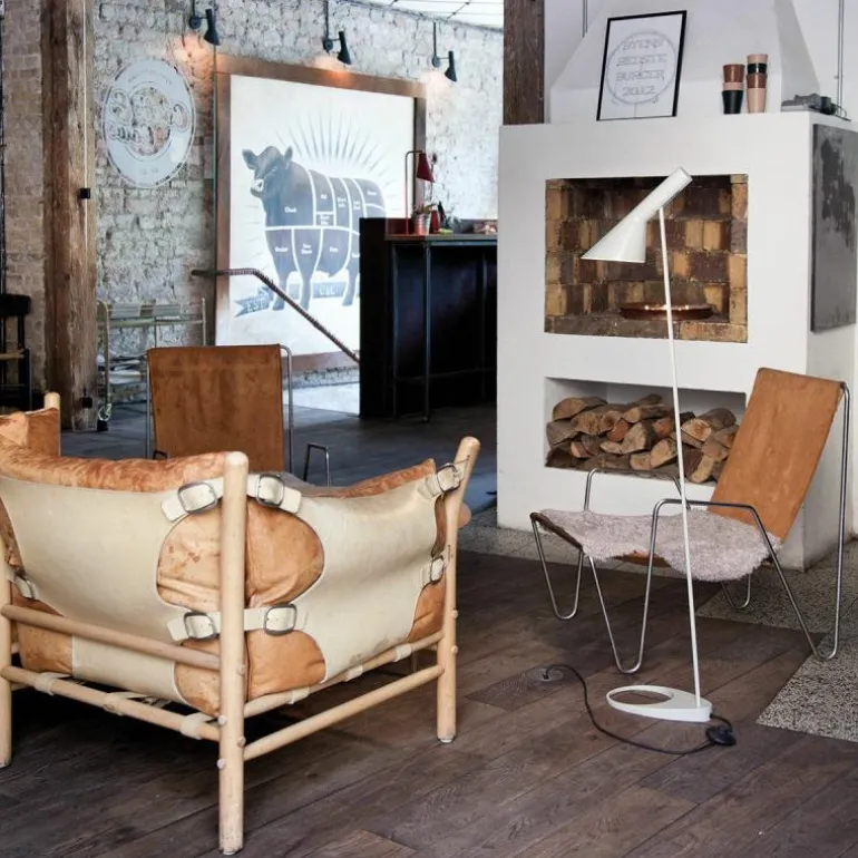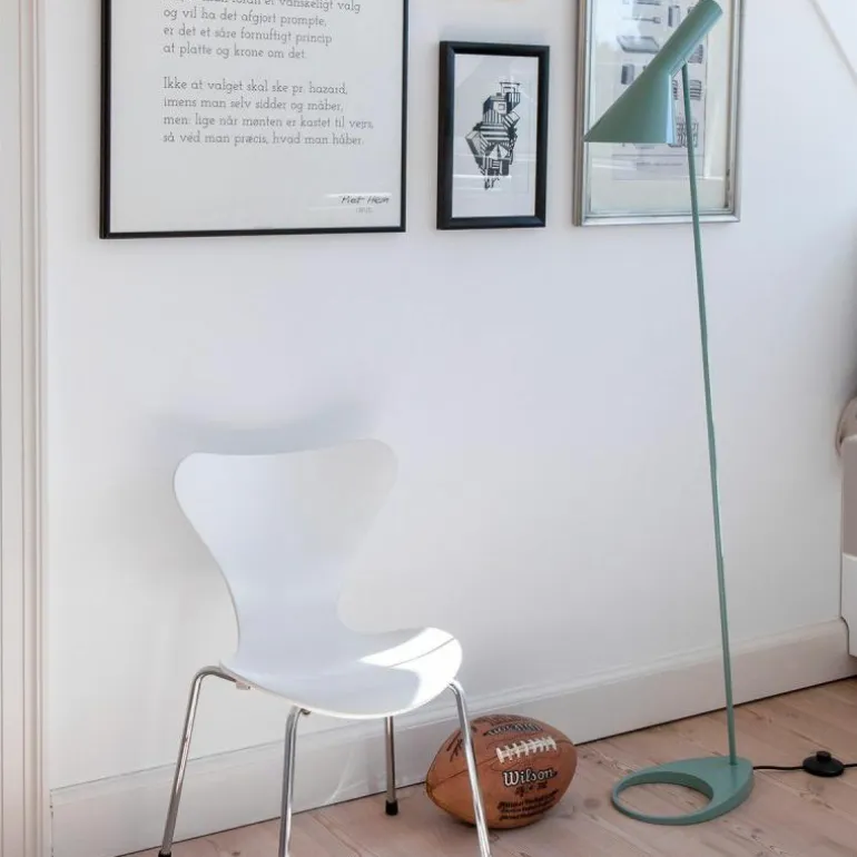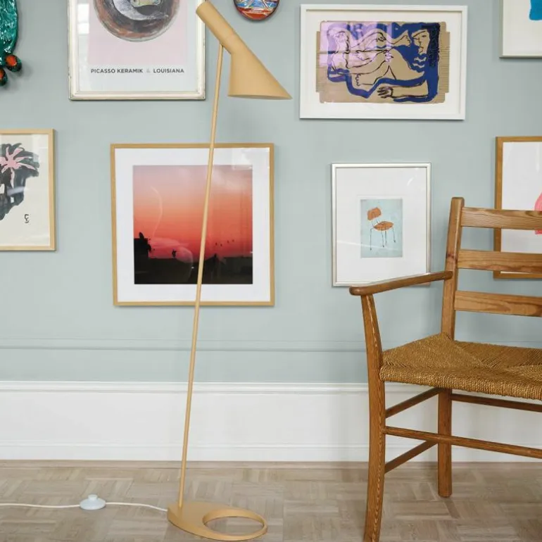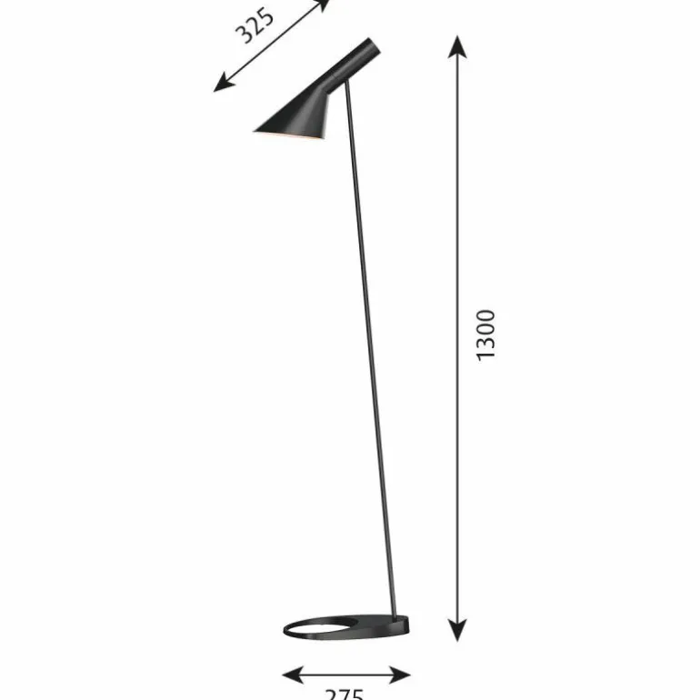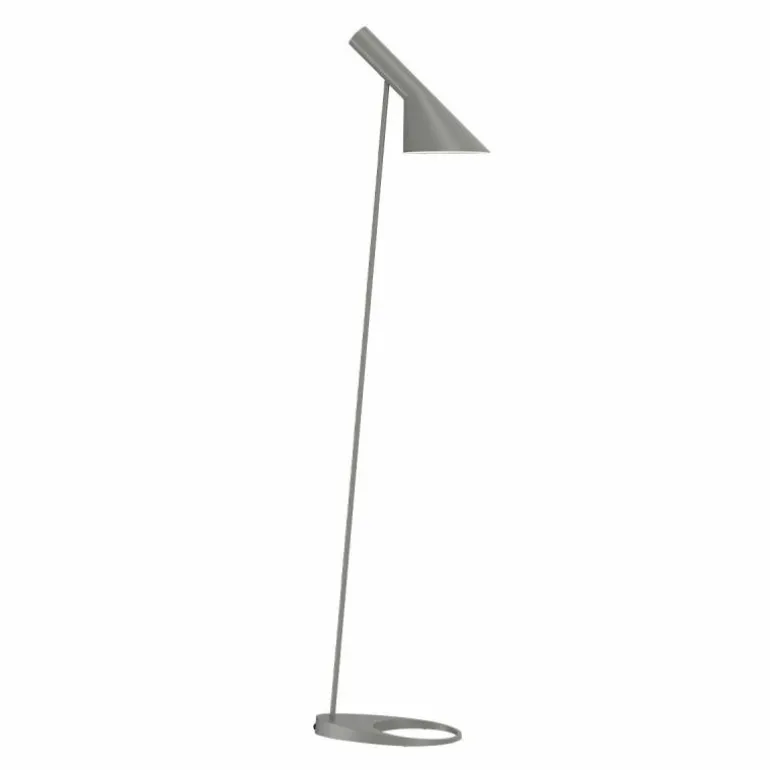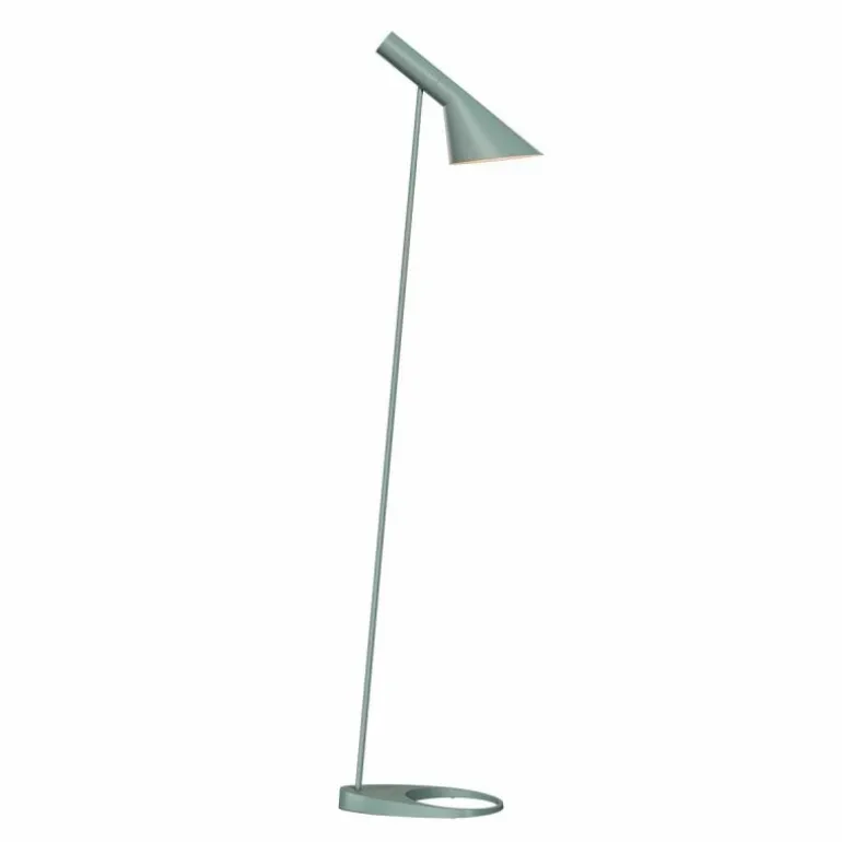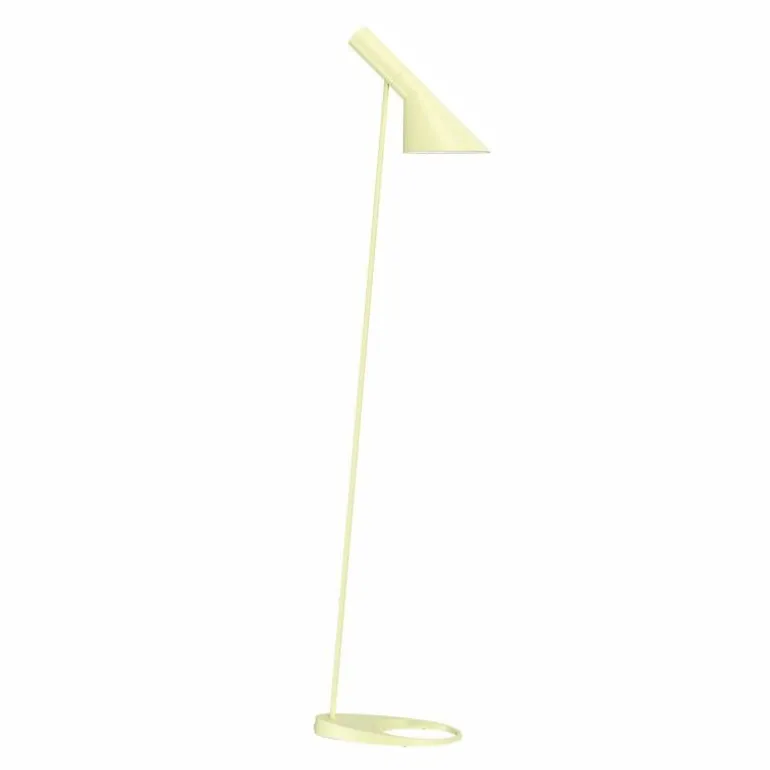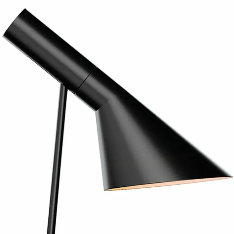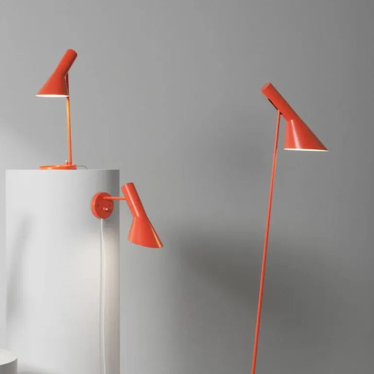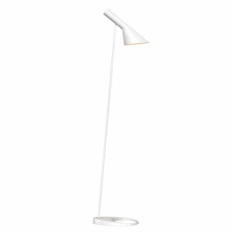 De vloerlamp uit de AJ serie ademt de eenvoudige en functionele ontwerptaal van Jacobsen. De combinatie van rechte en schuine hoeken wordt niet alleen gezien als een parallel van de Serie 3300 stoelen uit zijn hand, ook het geometrische profiel van zijn eigen ontworpen gebouwen komt terug in de vormgeving van de AJ vloerlamp. De hoekige lampenkap zorgt voor een neerwaarts gerichte lichtstraal en kan in de kantelhoek worden aangepast voor een optimale lichtspreiding. Deze is van binnen wit gelakt, wat een aangenaam zacht licht creëert. Aanvankelijk was het ontwerp verkrijgbaar in een uitvoering van koper, roestvaststaal en in de kleuren lichtgrijs, donkerbruin en zwart. Sinds zijn introductie heeft de AJ lamp vele jubilea mogen vieren, die gepaard gingen met de introductie van nieuwe kleuren.r