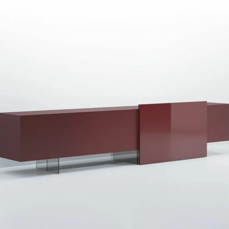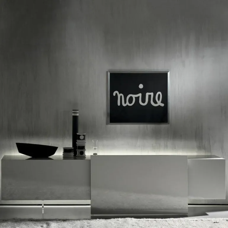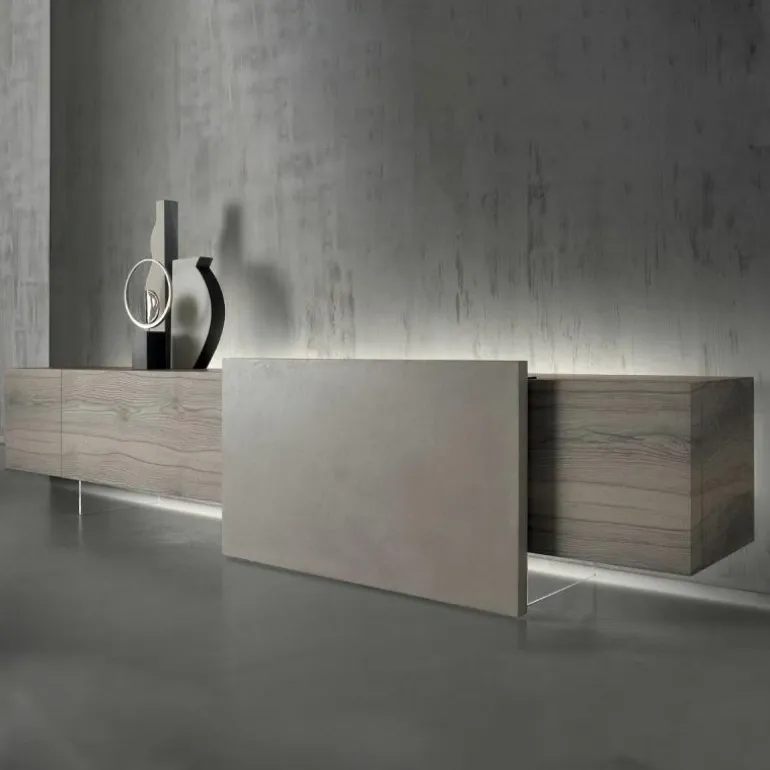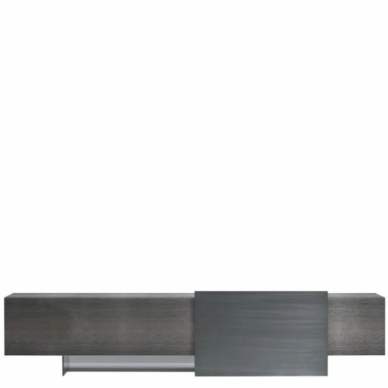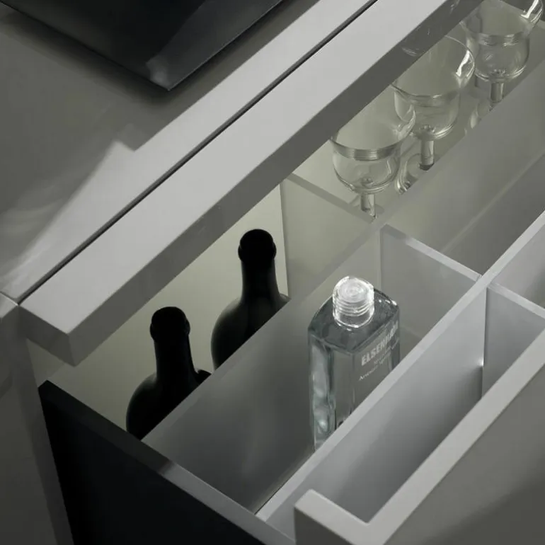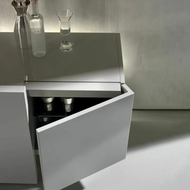 Dat is niet het enige magische aan deze dressoir; het element waar het geheel op lijkt te balanceren, kan namelijk bewegen. Dit is een schuifpaneel en verhult samen met scharnierdeuren en een lade de inhoud van het dressoir. Het meubel is verkrijgbaar in een breedtemaat van 246 en 296 centimeter. Het model 246 is voorzien van een lade aan de linkerzijde, een schuifpaneel en één scharnierdeur rechts. Model 296 heeft een lade, een schuifpaneel en zowel aan het linker uiteinde als rechter uiteinde scharnierdeuren zitten. Het schuifpaneel en de rechter scharnierdeur fungeren bij beide modellen als gezamenlijke deuren voor één compartiment. Alle compartimenten, met uitzondering van de lade, zijn voorzien van een transparante plank van grijs glas. De lade heeft een ‘Slate Grey’ afwerking en wordt van binnen verlicht. Op aanvraag kan de lade worden uitgerust met een flessenhouder of extra interne lade. Meer informatie over de indeling van het dressoir is te vinden in de bijlage.r