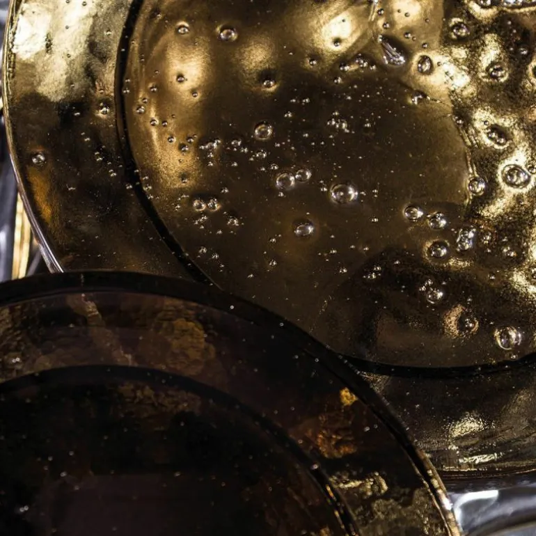 Sebastian Herkner is gefascineerd door gegoten glas dus wilde hij deze bijzondere techniek van glasbewerking graag toepassen in een meubel. Gegoten glas kan een stuk dikker zijn dan mondgeblazen glas, waardoor een robuust tafelblad gecreëerd kan worden. Het dikke glas bootst de esthetiek van water na en de luchtbellen die erin zitten maken ieder tafelblad uniek. r