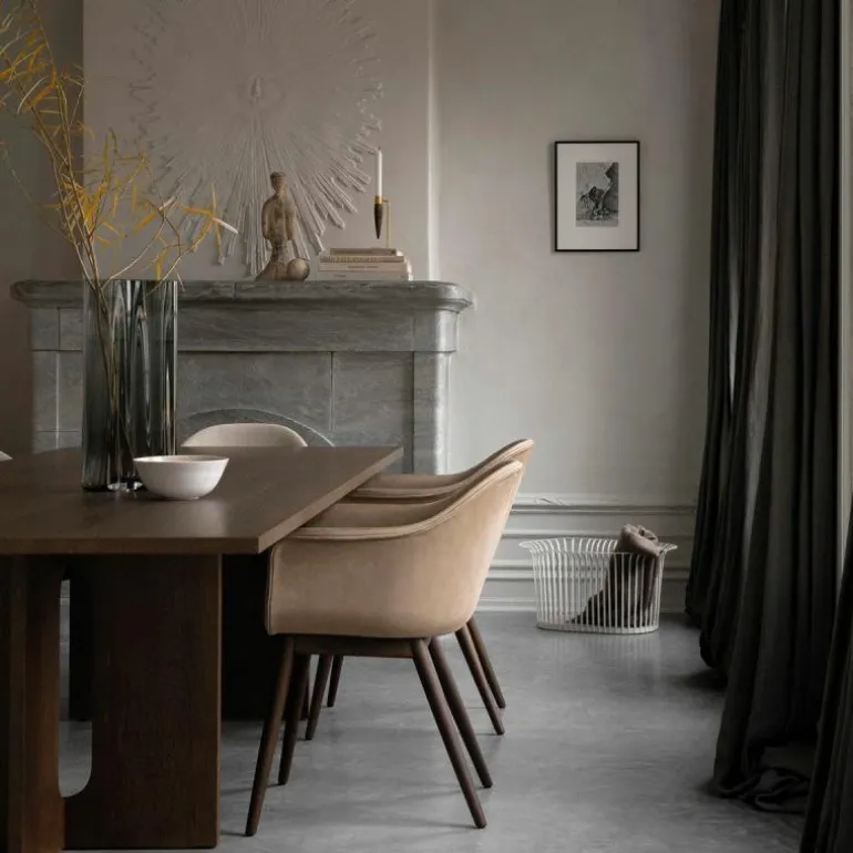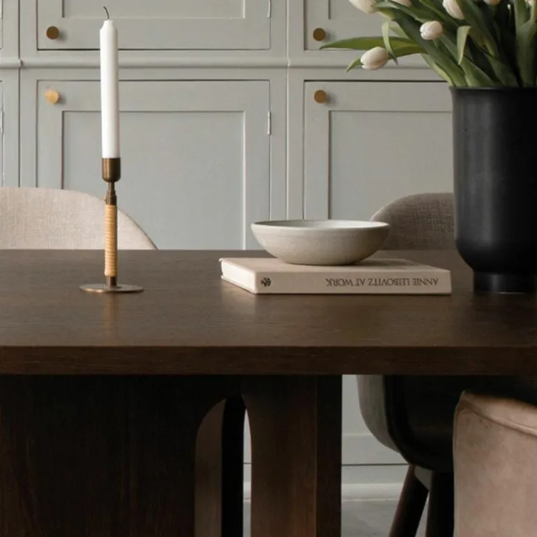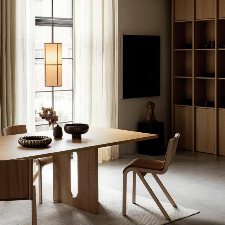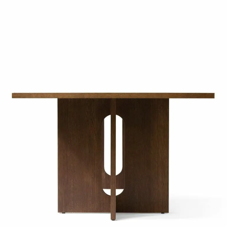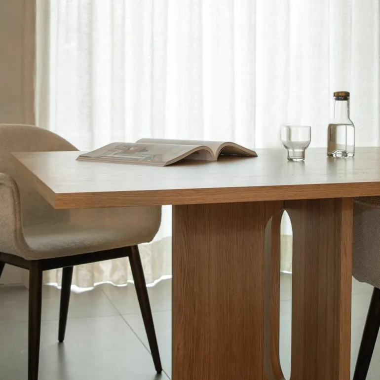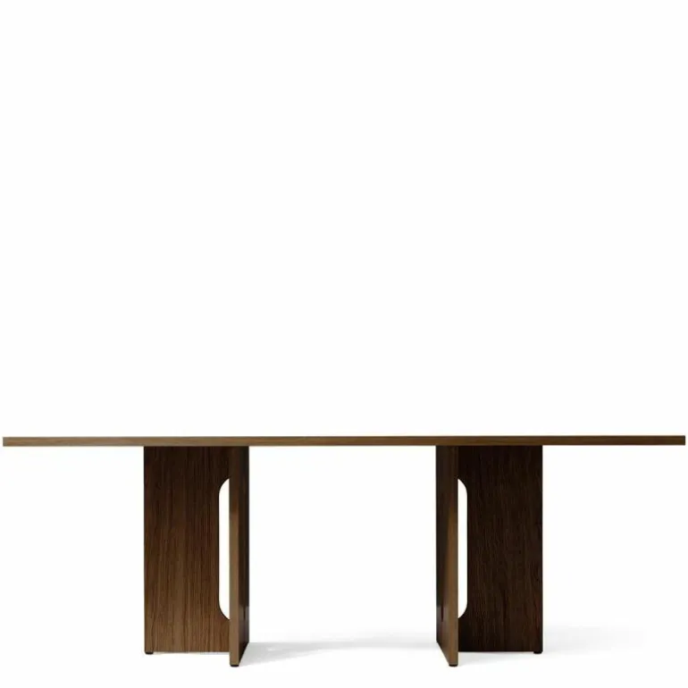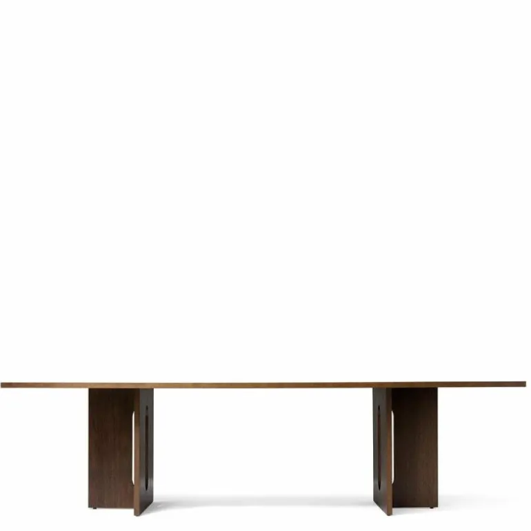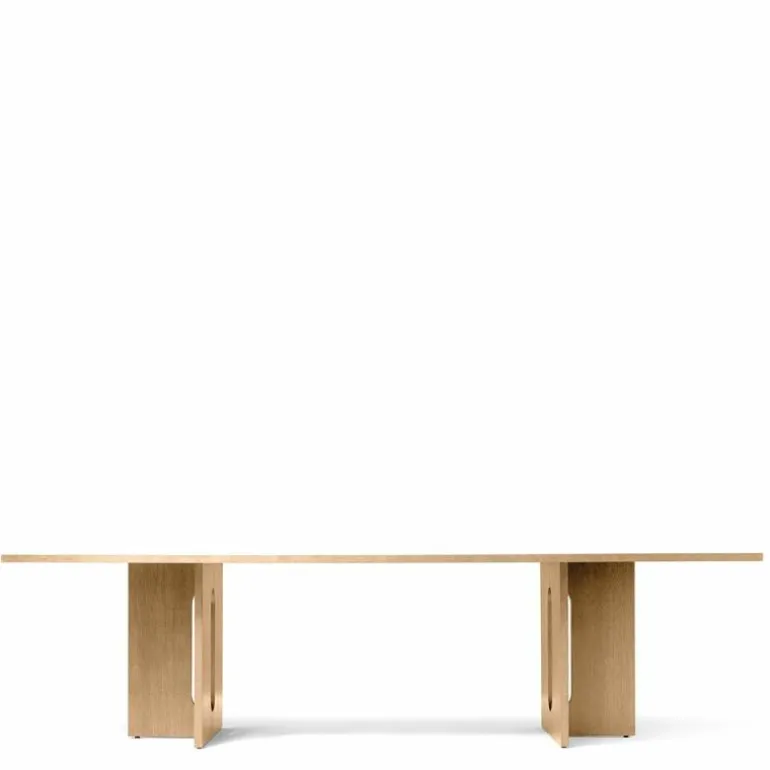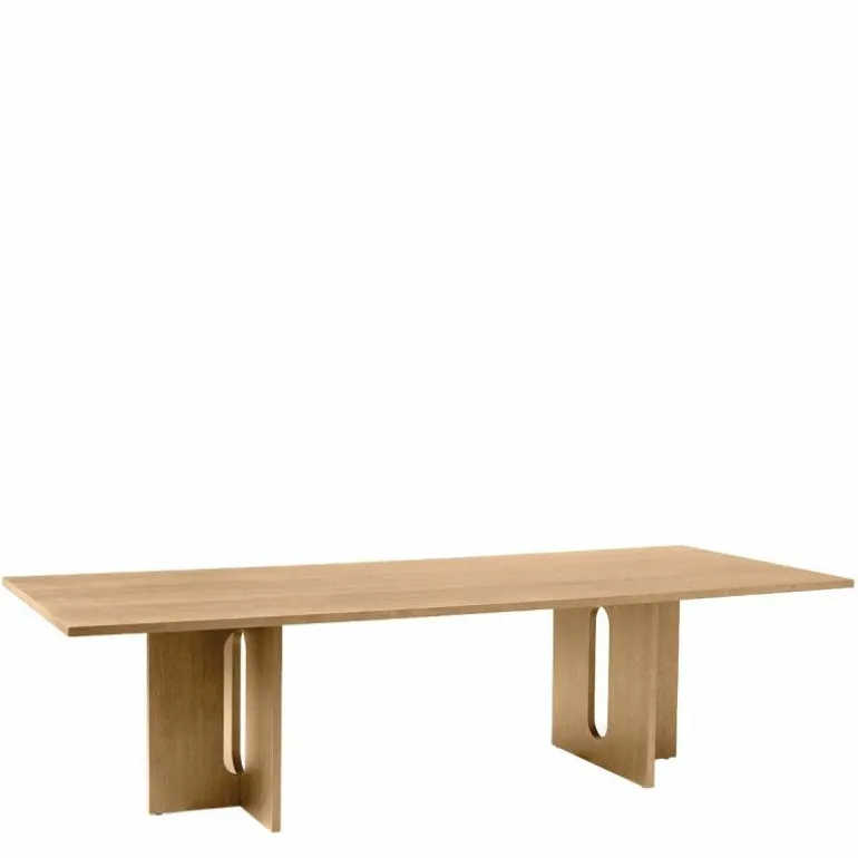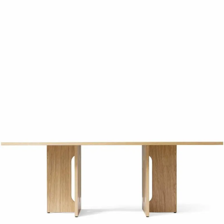 Deze langwerpige uitvoering van de Androgyne eettafel is verkrijgbaar in naturel en donker gebeitst eikenhout, waarbij het onderstel van massief hout is gemaakt en het tafelblad uit eikenfineer bestaat. De tafel is verkrijgbaar in twee afmetingen en biedt voor acht tot tien personen ruimte om aan te schuiven.