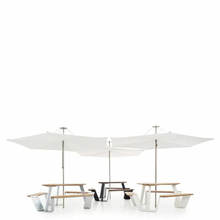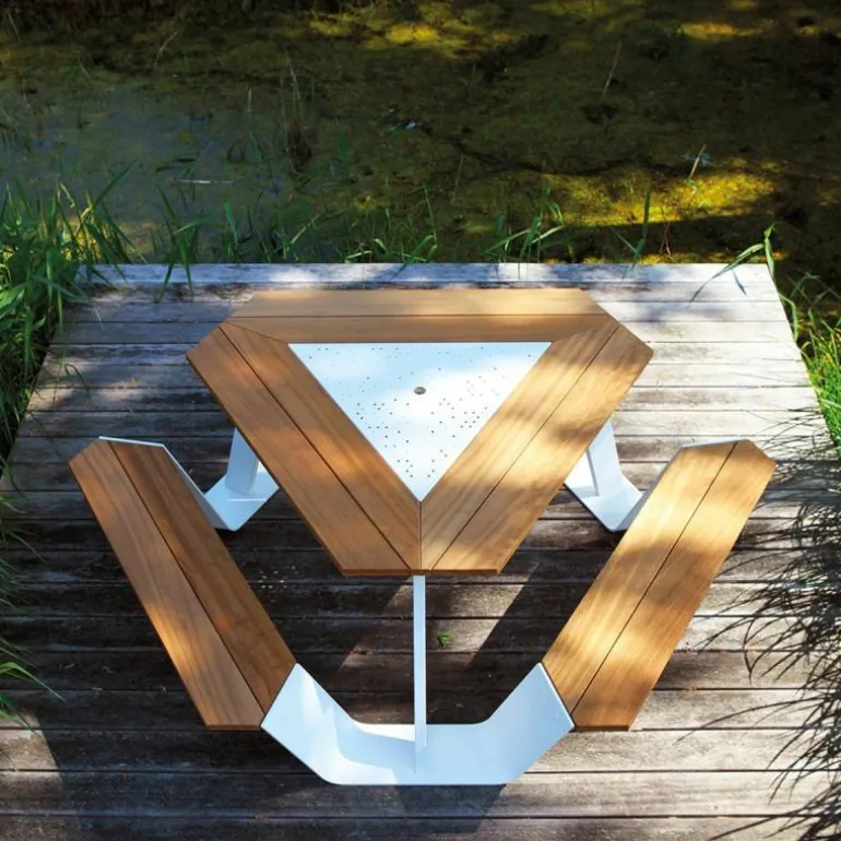 Met de Extremis Anker Picknicktafel laat ontwerper Dirk Wynants zien hoe stijlvol een picknicktafel kan zijn. Bij de meeste picknicktafels is het een hele toer op aan te tafel te gaan zitten en moet u meestal over de bank klimmen. Daar heeft Dirk Wynants een oplossing voor gevonden, door aan beide kanten van de bankjes ruimte te laten. Hierdoor schuift u gemakkelijk aan tafel en kan het genieten beginnen! De bankjes bieden met gemak plek aan zes mensen en met een beetje schuiven kunt u zelfs met 9 man aan tafel zitten. Maar vanwaar de naam? Kijk even naar de zijkant van de tafel en u weet meteen het antwoord!r