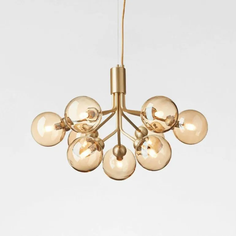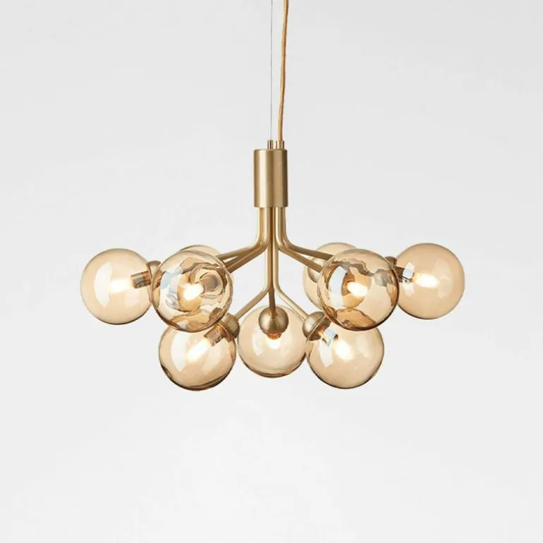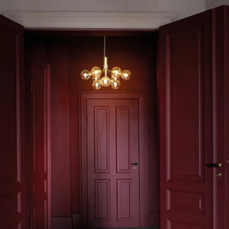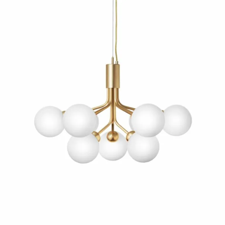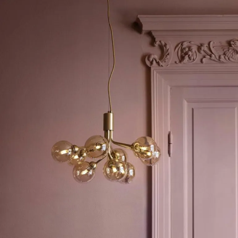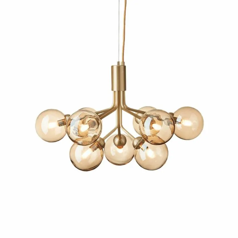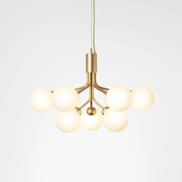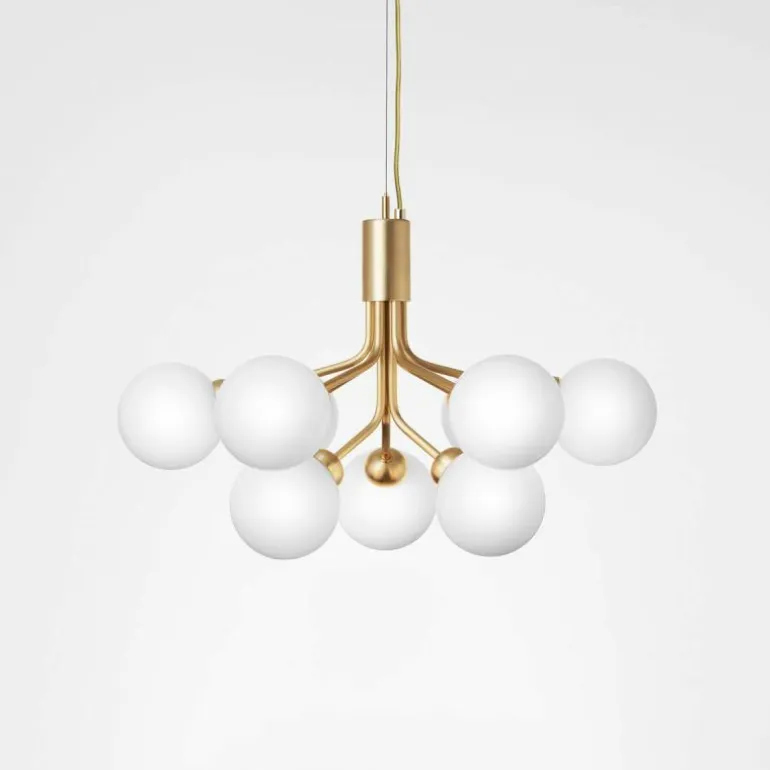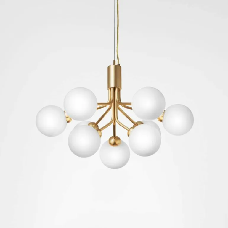 De Apiales 9 telt zoals de naam verklapt maar liefst negen lichtbronnen, die allen een zwoel licht uitstralen. Dit strakke model bestaat uit een mondgeblazen kap van semi-transparant opaal glas of transparant goud en gerookt glas, bevestigd aan een metalen armatuur voorzien van de luxueuze messing-achtige kleur ‘Brushed Brass’ en zachte kleur ‘Satin Black’. De ‘Brushed Brass’ kleur is een geavanceerde poedercoating die op messing lijkt, maar niet verkleurt. De kleur van de kabel komt overeen met de kleur van het armatuur. De lamp biedt een fitting voor een G9 lichtbron van maximaal 5,6 Watt. De Apiales 9 hanglamp wordt geleverd met een plafondkapje (Ø14,5 centimeter) en zonder lichtbron, deze laatste kunt u apart mee bestellen.r
