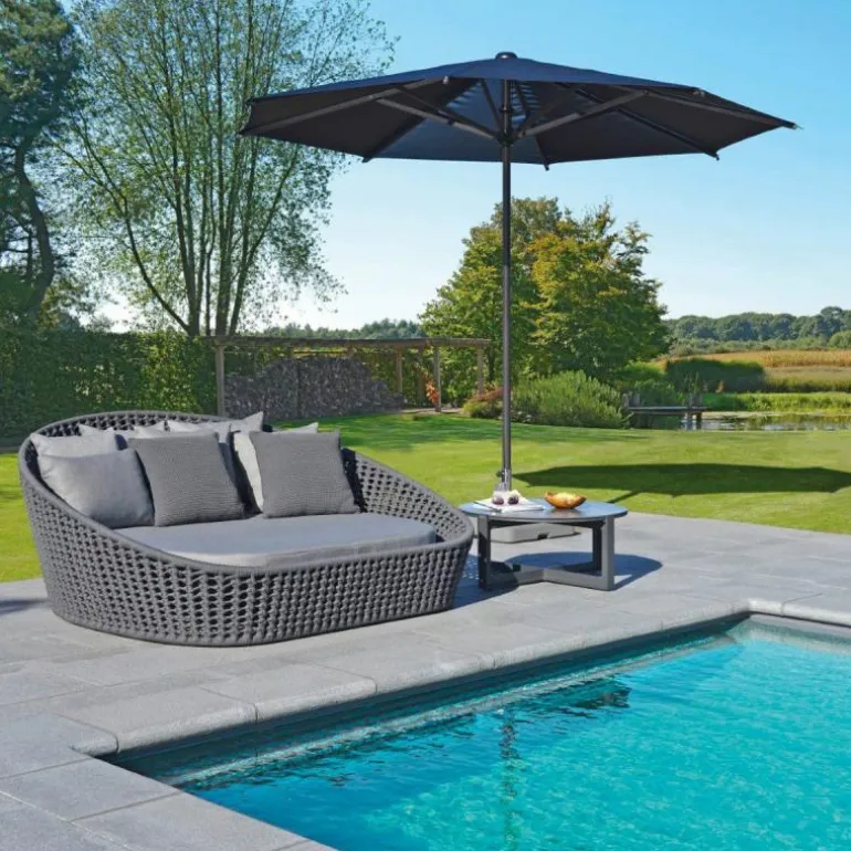 De parasol heeft een frame van grafietkleurig aluminium en een doek van een Sunbrella of Batyline stof. Sunbrella is een water- en vuilafstotende stof, vervaardigd uit polyacrylaat. Het is UV-, kleur- en schimmelbestendig en daardoor tegen weer en wind bestand. Batyline wordt vervaardigd uit een polyestervezel die wordt gecoat met een laag PVC en daarna geweven. Door deze na het weven samen te smelten wordt de stof scheurbestendig en bestand tegen extreme weersomstandigheden.r