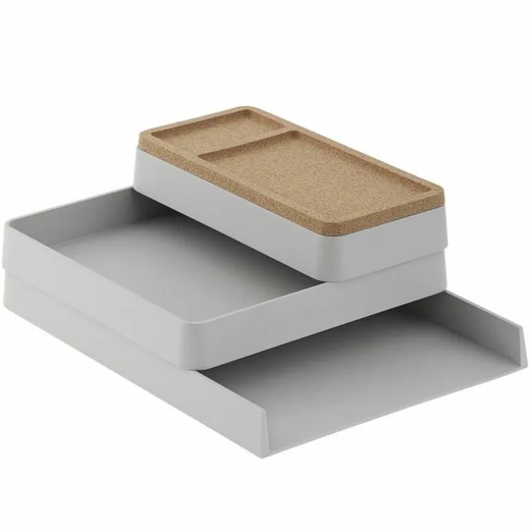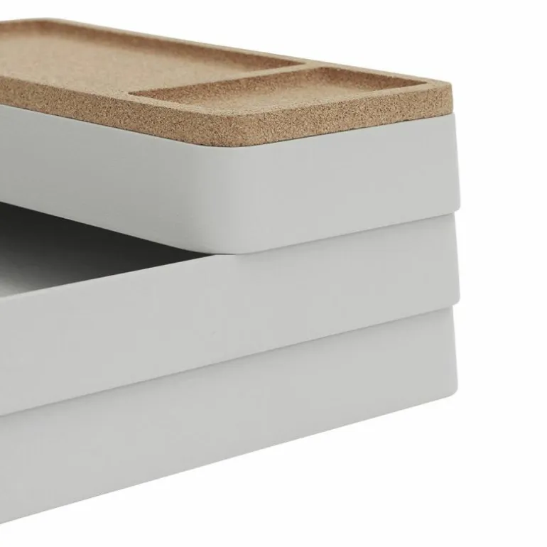 De eerste samenstelling is 25 centimeter breed, 32 centimeter diep en heeft een hoogte van 11 centimeter. Het design bestaat uit drie grijze trays gemaakt van 100% gerecycled plastic met daarop een deksel van kurk. r