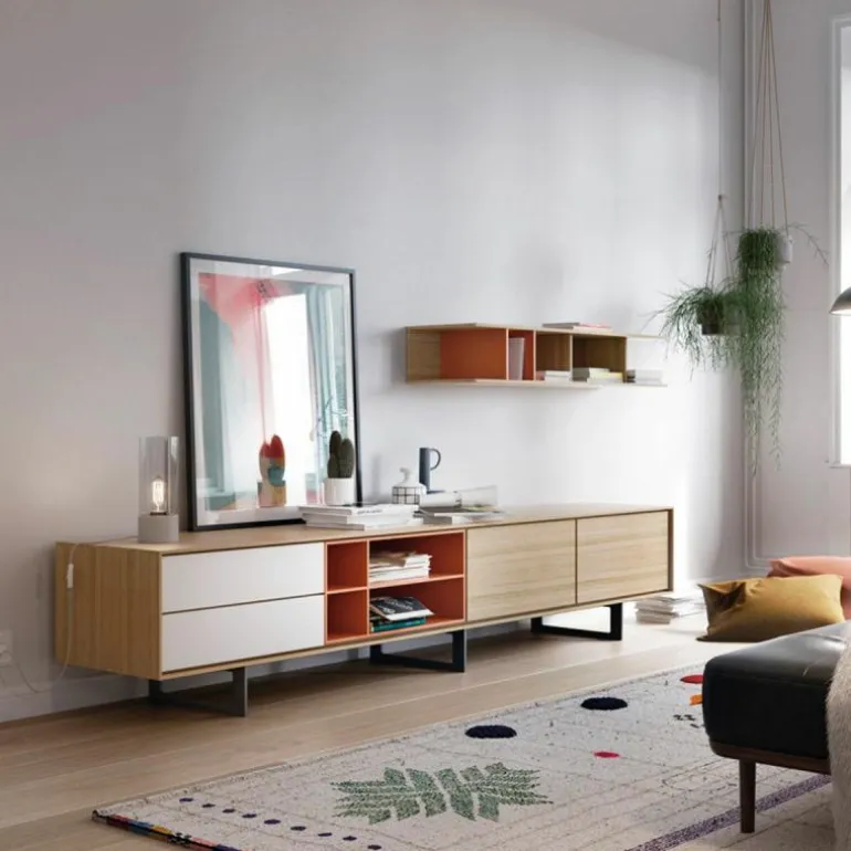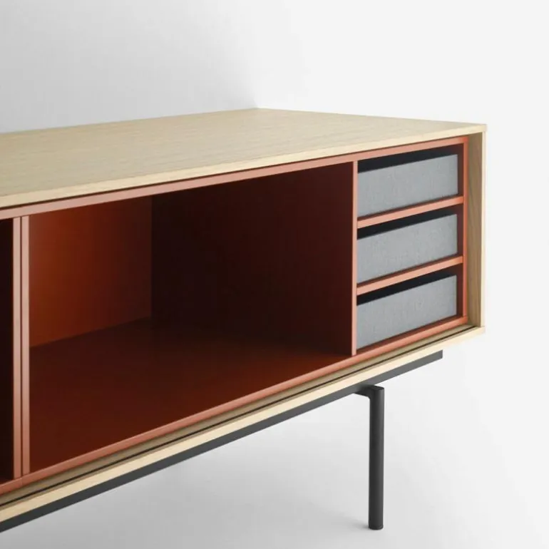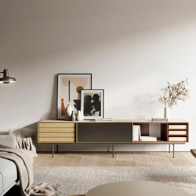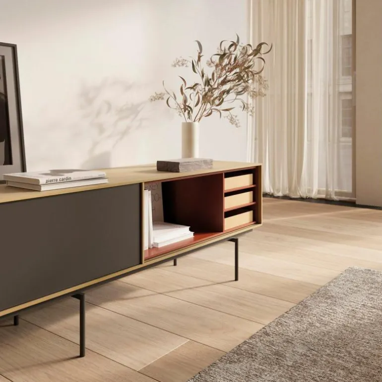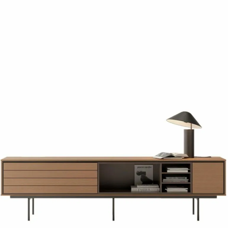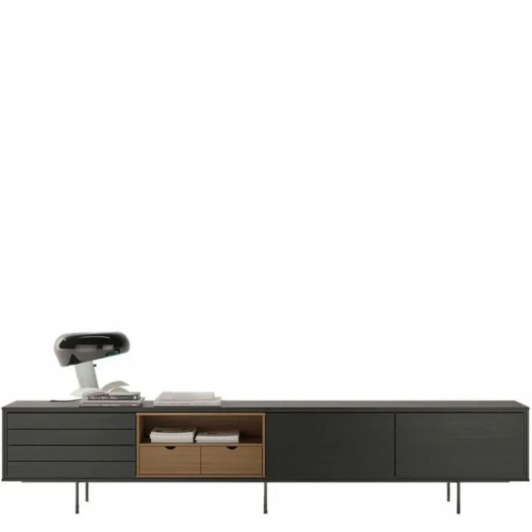 Het Aura A2-2 TV-meubel is op ronde metalen poten geplaatst van 16 centimeter hoog. Het meubel is 260 centimeter breed, 52 centimeter hoog en 47 centimeter diep. r