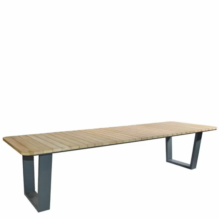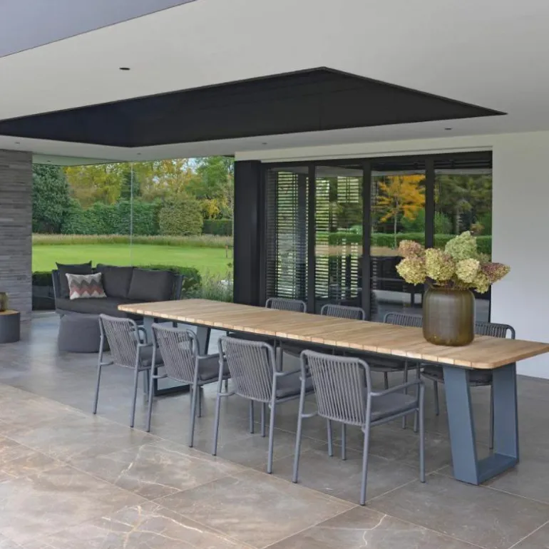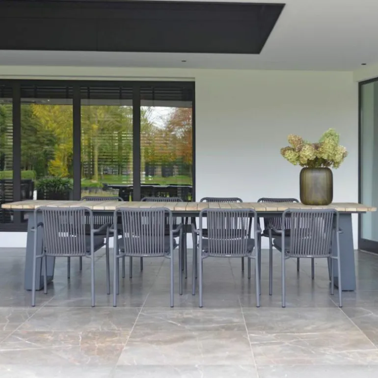 Deze sierlijke en toch stoere Azoren Tuintafel is 330 centimeter lang, 110 centimeter breed en 76 centimeter hoog. Dankzij het gebruik van teakhout is de Azoren Tuintafel zeer geschikt om in de tuin te gebruiken. Teakhout is bestand tegen weer en wind doordat het van nature rijk is aan oliën. Om deze reden wordt deze houtsoort veel gebruikt voor tuinmeubelen. Na verloop van tijd zal teakhout op natuurlijke wijze vergrijzen. Goed onderhoud is daarom van belang om de uitstraling van het hout te bewaren.