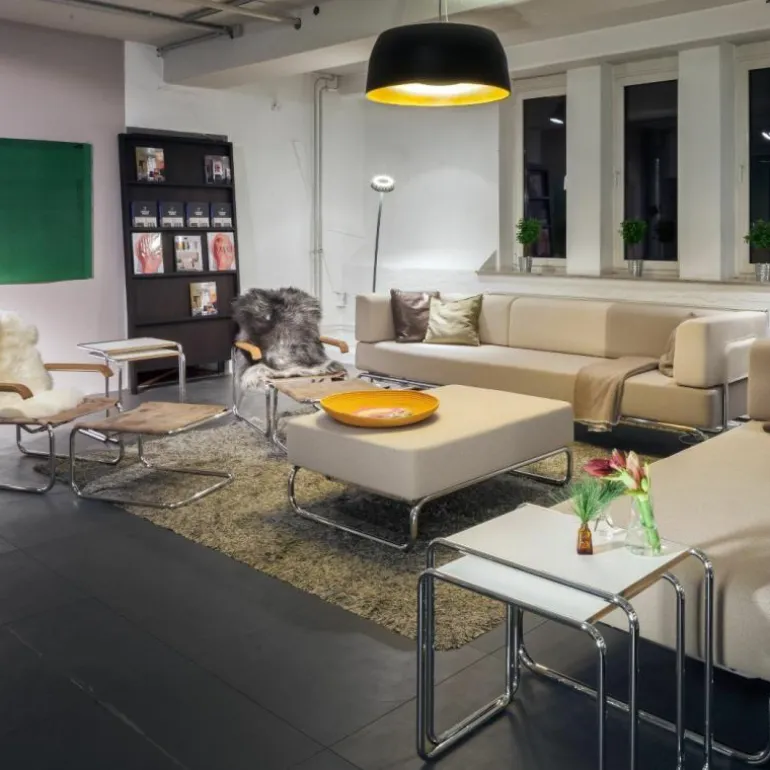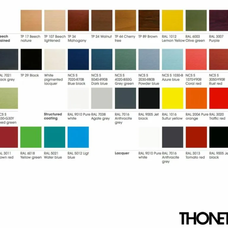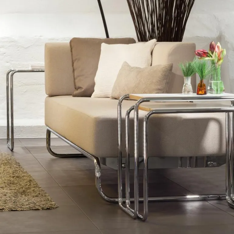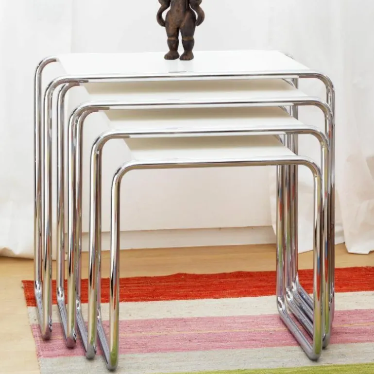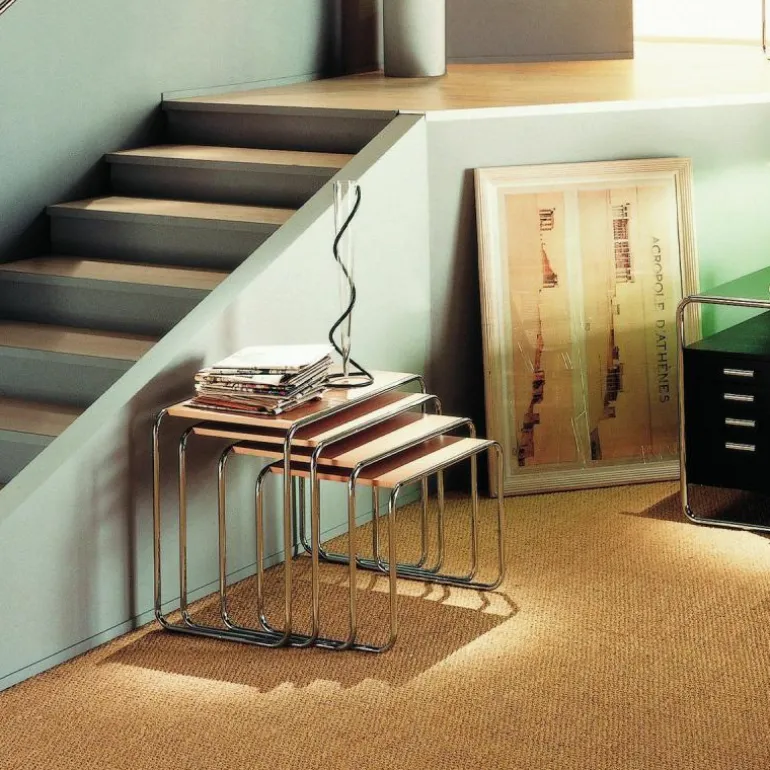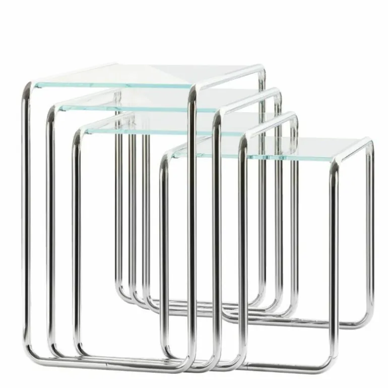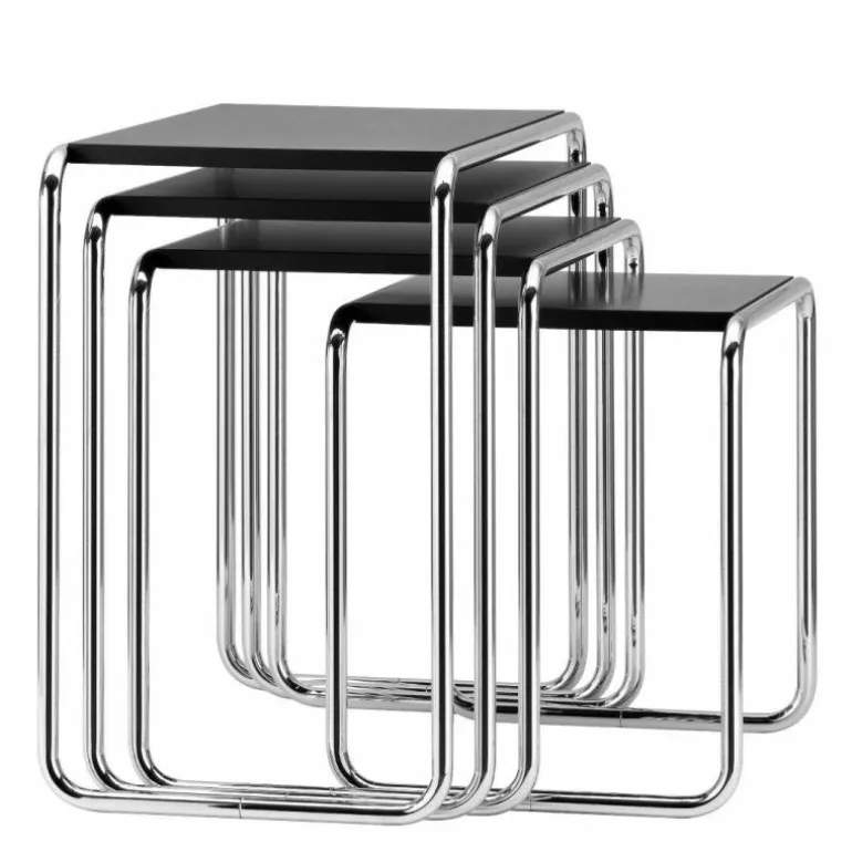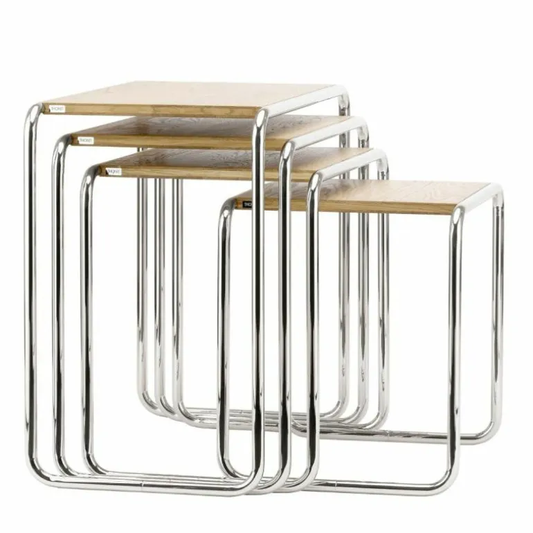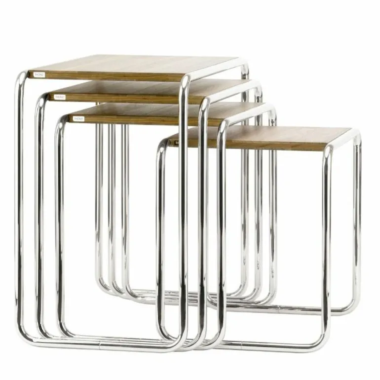 B9 is verkrijgbaar in 4 verschillende afmetingen die ook als set besteld kunnen worden. Het frame is gemaakt van verchroomde stalen buizen of is gelakt in een kleur naar keuze, de houten onderdelen zijn mogelijk in gebeitst beuken, afgelakt of in structuurlak in diverse kleuren of van ThonetDur®. B9 is ook leverbaar als ‘Pure Materials’-uitvoering in geolied eiken en walnoot met vernikkeld frame. In verchroomde uitvoering tevens verkrijgbaar met glasplaten. Daarnaast is er een Thonet All Seasons-uitvoering die variabel inzetbaar is voor binnen en buiten door ThonetProtect®-coating die toegepast is op het frame. Voor de tafelbladen heeft u de keuze uit volkern-HPL-plaat of ruw beton.