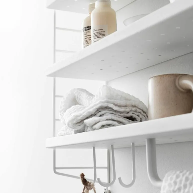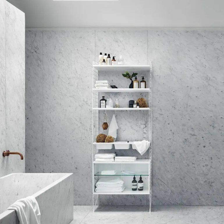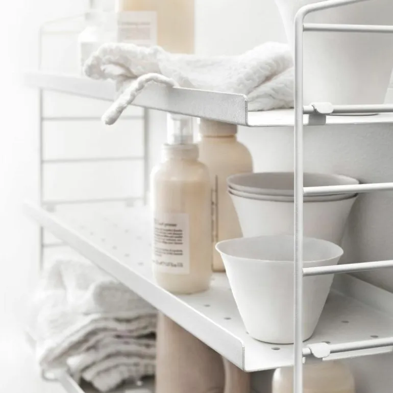 De String Badkamer Combinatie 9 is opgebouwd uit verschillende elementen van het String Opbergsysteem. Het systeem, ontworpen door Nils (Nisse) Strinning, is een ingenieus opbergsysteem dat u geheel naar eigen wens in kunt richten. Het kastsysteem bestaat in de basis uit wandrekken, waaraan verschillende planken en / of lades gehangen kunnen worden. Met de diverse onderdelen en prachtige kleurkeuzes is de serie geschikt voor werkelijk iedere ruimte en voor elk interieur. Er zijn ook tal van accessoire verkrijgbaar. Om het wat gemakkelijker te maken het perfecte systeem te vinden, hebben we voor u alvast een aantal configuraties samengesteld. r