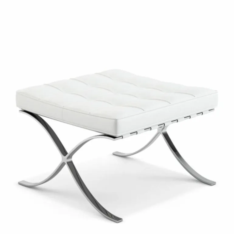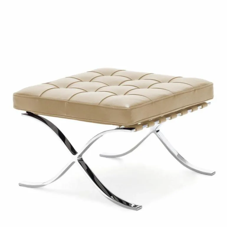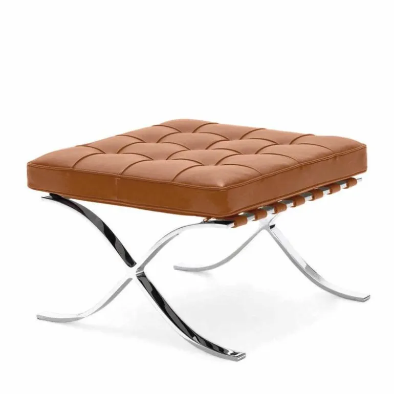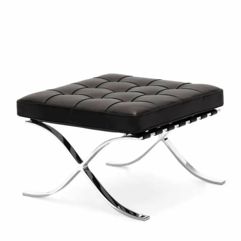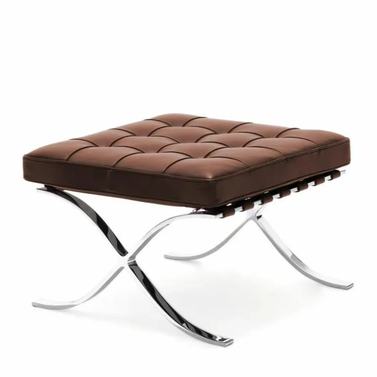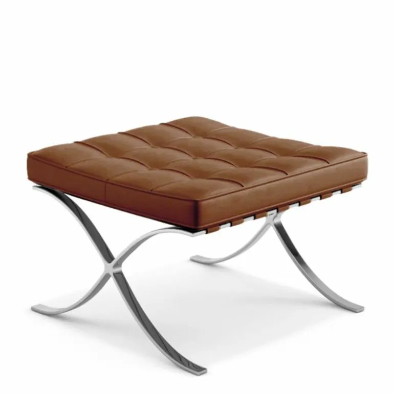 De Knoll Barcelona Poef is een ontwerp van Ludwig Mies van der Rohe. Samen met de iconische Barcelona Chair was deze voetenbank onderdeel van de wereldtentoonstelling van 1929 in Barcelona. Daar is de serie, die daar 7 maanden tentoongesteld stond, later naar vernoemd. De stoelen vormden een rustplaats voor de koning en koningin van Spanje, maar die hebben er naar verluid nooit op gezeten. Toch werd de serie een toonbeeld van modern design. In 1953 gaf Mies de productierechten aan zijn goede vriendin Florence Knoll. Tot op de dag van vandaag geeft Knoll de serie uit, waaronder deze poef. Hoewel hij vaak gepresenteerd wordt als voetenbank bij de Barcelona Chair, is het eigenlijk een op zichzelf staande poef. Het sierlijke chromen kruisframe staat aan de basis van het ontwerp en is met de hand gepolijst. Daarbovenop is een gewoven frame van leren banden gecreëerd, waarop het kussen ligt. Dit comfortabele schuimkussen is bekleed met leer van top kwaliteit. Alle vlakken worden met de hand gezoomd en voorzien van knoopjes. r