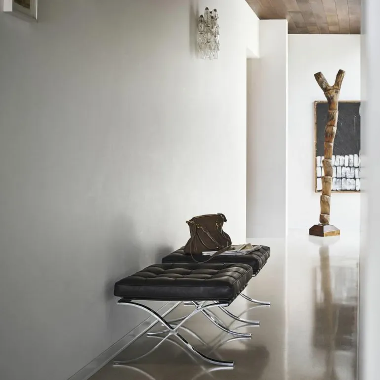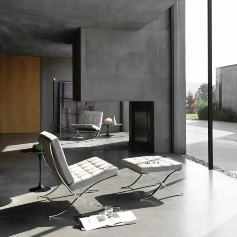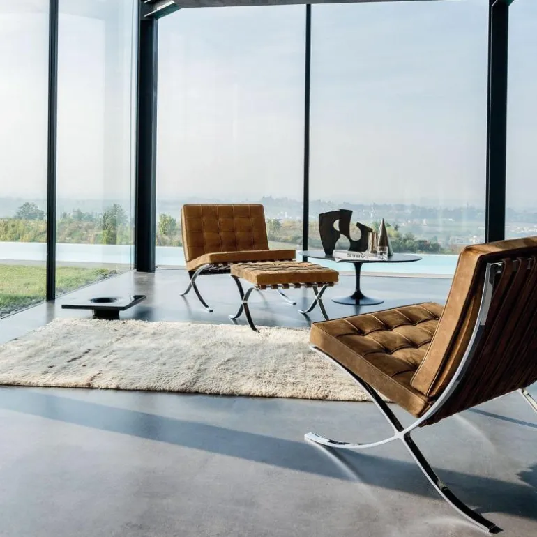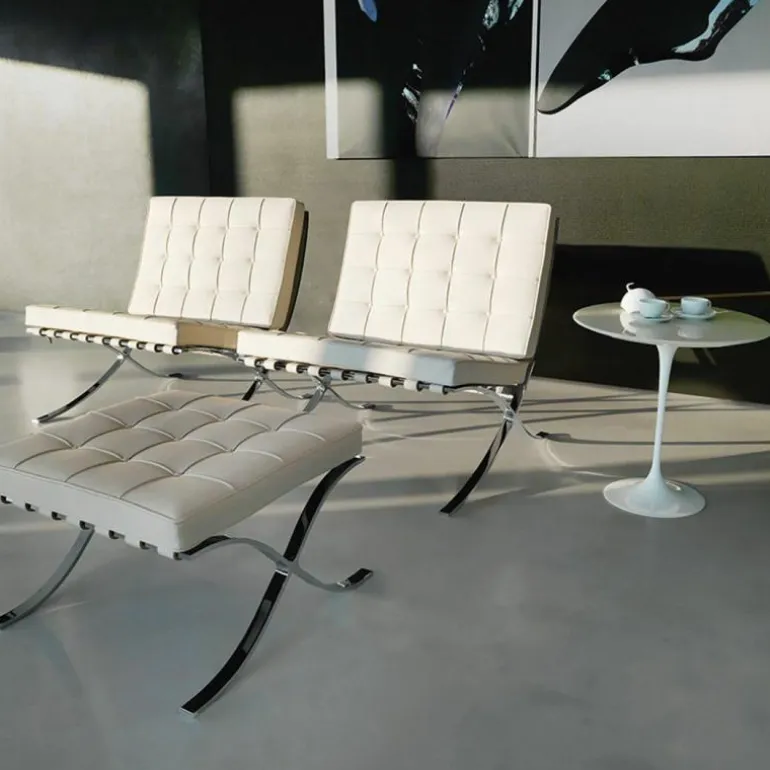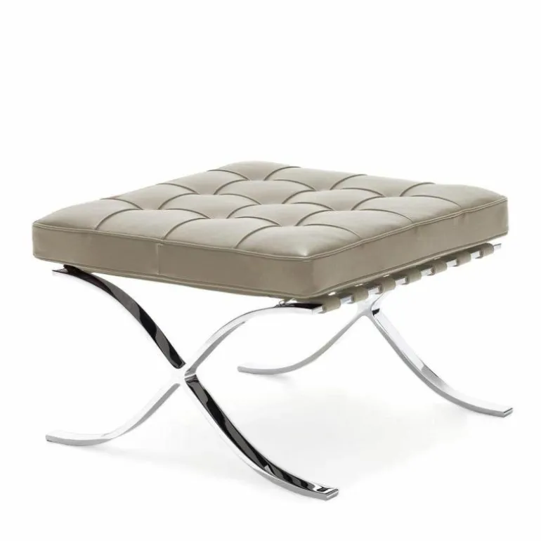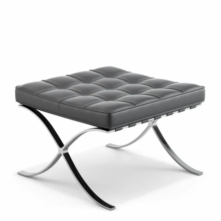 De Knoll Barcelona Poef is een ontwerp van Ludwig Mies van der Rohe. Samen met de iconische Barcelona Chair was deze voetenbank onderdeel van de wereldtentoonstelling van 1929 in Barcelona. Daar is de serie, die daar 7 maanden tentoongesteld stond, later naar vernoemd. De stoelen vormden een rustplaats voor de koning en koningin van Spanje, maar die hebben er naar verluid nooit op gezeten. Toch werd de serie een toonbeeld van modern design. In 1953 gaf Mies de productierechten aan zijn goede vriendin Florence Knoll. Tot op de dag van vandaag geeft Knoll de serie uit, waaronder deze poef. Hoewel hij vaak gepresenteerd wordt als voetenbank bij de Barcelona Chair, is het eigenlijk een op zichzelf staande poef. Het sierlijke chromen kruisframe staat aan de basis van het ontwerp en is met de hand gepolijst. Daarbovenop is een gewoven frame van leren banden gecreëerd, waarop het kussen ligt. Dit comfortabele schuimkussen is bekleed met leer van top kwaliteit. Alle vlakken worden met de hand gezoomd en voorzien van knoopjes. r