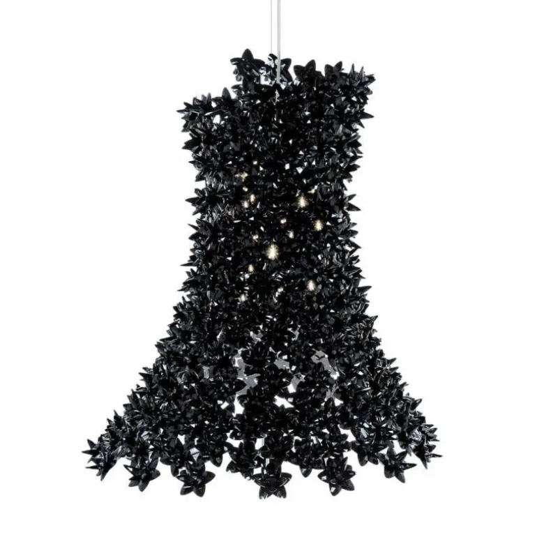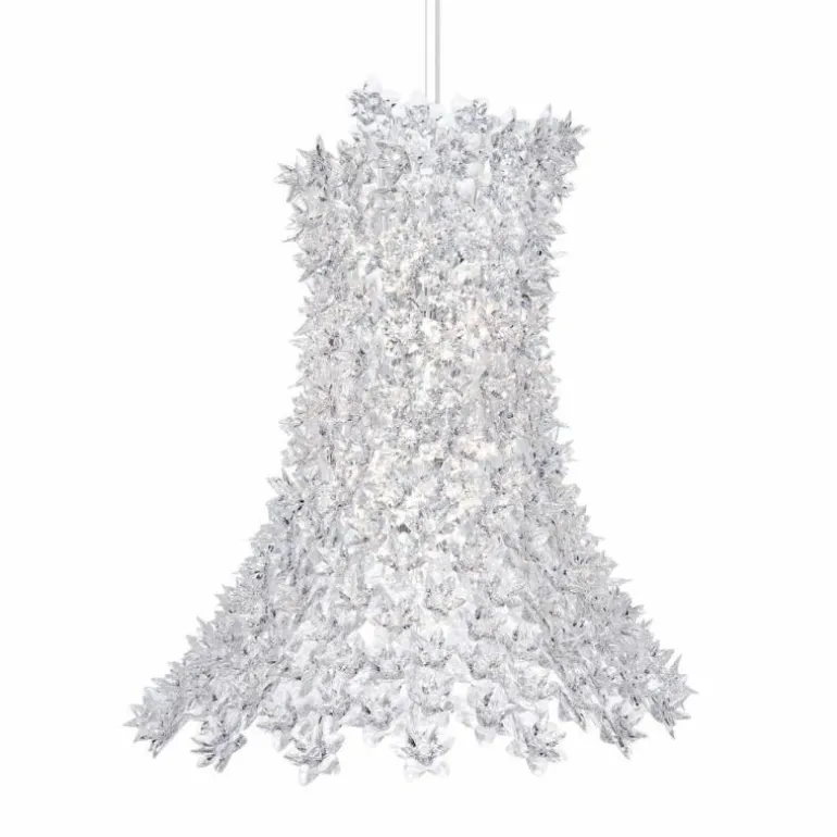 Deze moderne versie is uitgevoerd met kleine bloemen in doorzichtig kunststof dat zorgt voor een schouwspel van reflecties. Deze lamp is meer dan een lamp; het is een sculptuur, een kunstwerk met een grijpende visuele impact.r