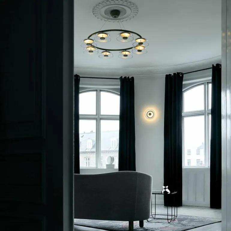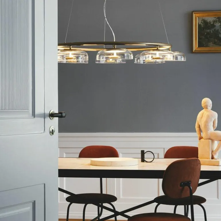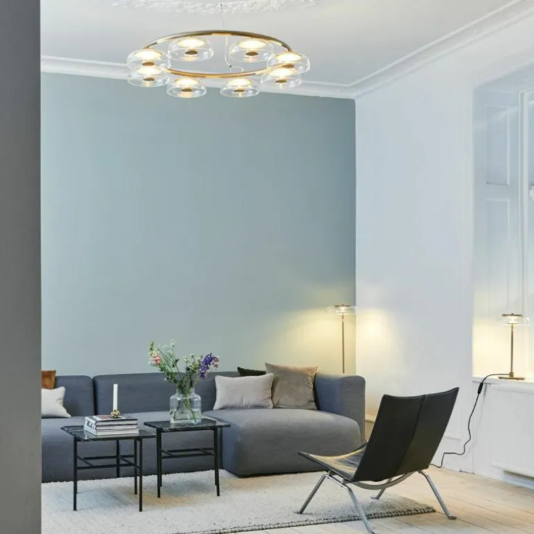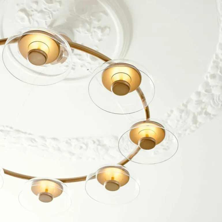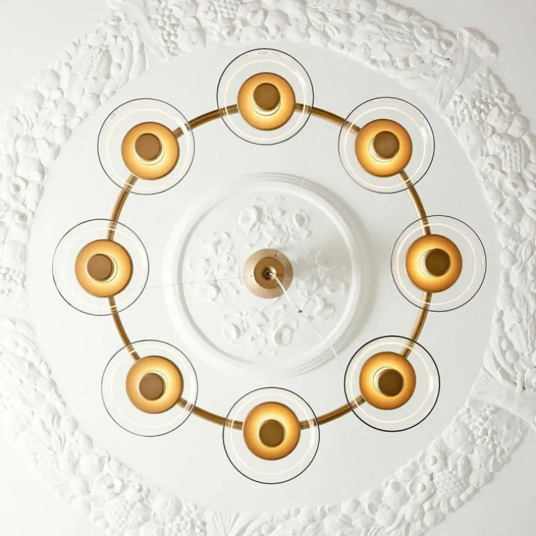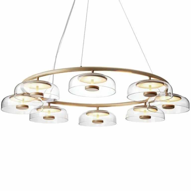 Te midden van de acht schaalvormige mondgeblazen kappen van transparant glas is een prachtig armatuur in de luxueuze kleur ‘Nordic Gold’ te zien, die zachtjes het verfijnde licht van de ingebouwde LED schijf reflecteert. De Blossi 8 Kroonluchter lamp biedt acht aansluitingen voor G9 LED lichtbronnen van maximaal 7 Watt, deze zitten bevestigd aan een prachtige luxueuze ring. De kroonluchter wordt met drie ophangkabels, een zwarte snoer en een plafondkap van (Ø14,8 centimeter) geleverd.r