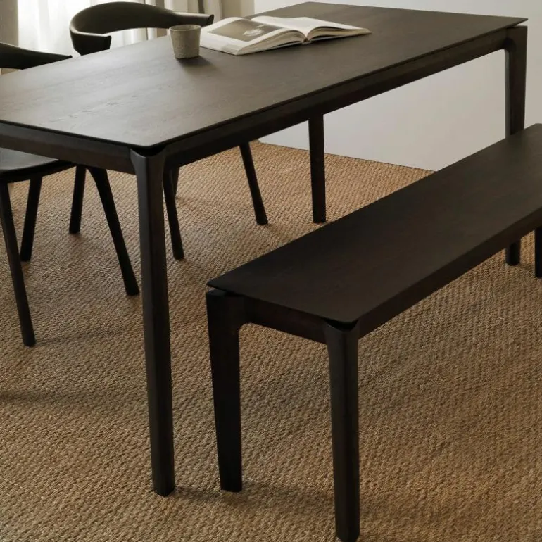 Het ontwerp is herkenbaar aan de afgeronde vormen, schuin toelopende poten en het elegante lijnenspel. Deze elementen zorgen samen voor een luchtige uitstraling, zonder in te boeten op stevigheid of comfort. De bank is ontworpen met aandacht voor ergonomie en detail, en sluit qua proporties en afwerking naadloos aan bij de Bok Eettafel in teak – maar kan ook losstaand ingezet worden als stijlvol en functioneel zitmeubel.