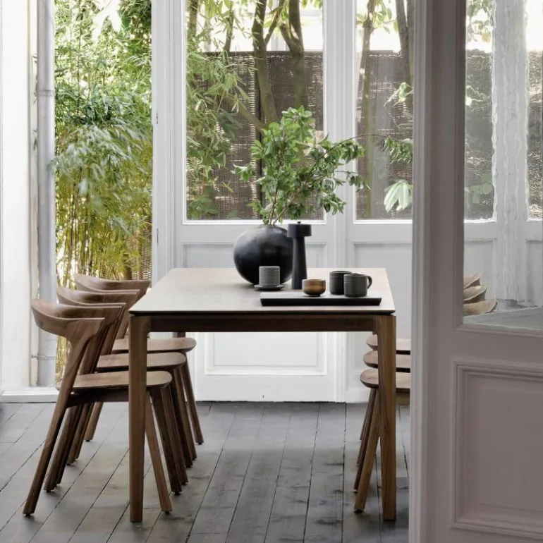 Het ontwerp onderscheidt zich door een strak lijnenspel en verfijnde details. De schuin aflopende poten creëren een licht, elegant silhouet, terwijl ze tegelijkertijd zorgen voor een solide en stabiele basis. Deze doordachte combinatie van vorm en functie maakt de Bok Eettafel tot een geraffineerd ontwerp met een sterke visuele en praktische meerwaarde.