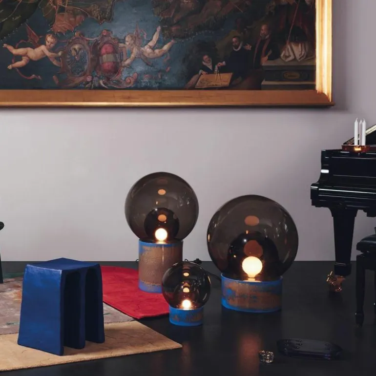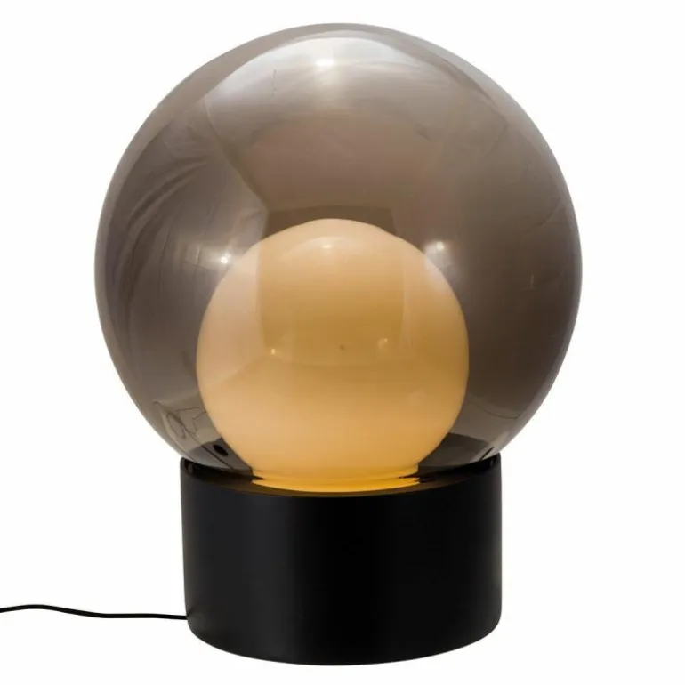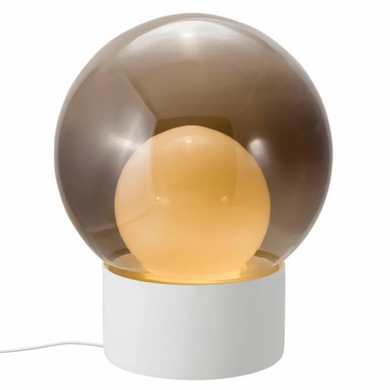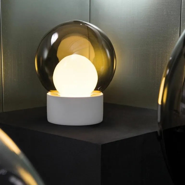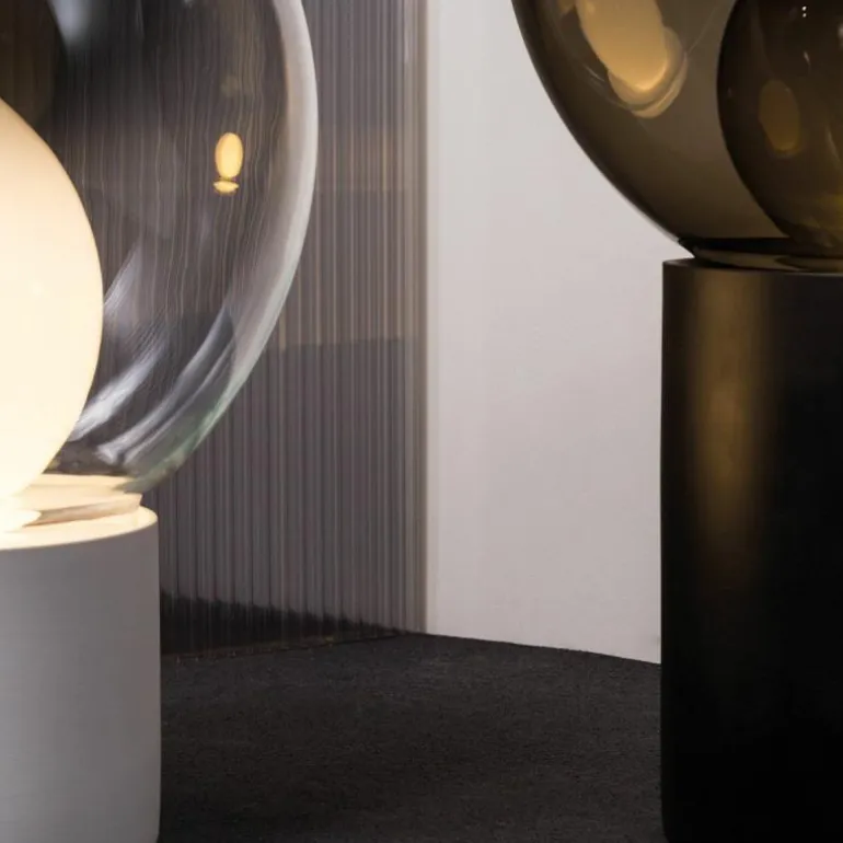 De verschillende materialen zijn verkrijgbaar in meerdere kleurcombinaties. De porseleinen basis is er in zwart of wit. De buitenste glazen bol kan in transparant glas of Smoke Grey uitgevoerd worden en de binnenste bol in Smoke Grey of opaal wit. r