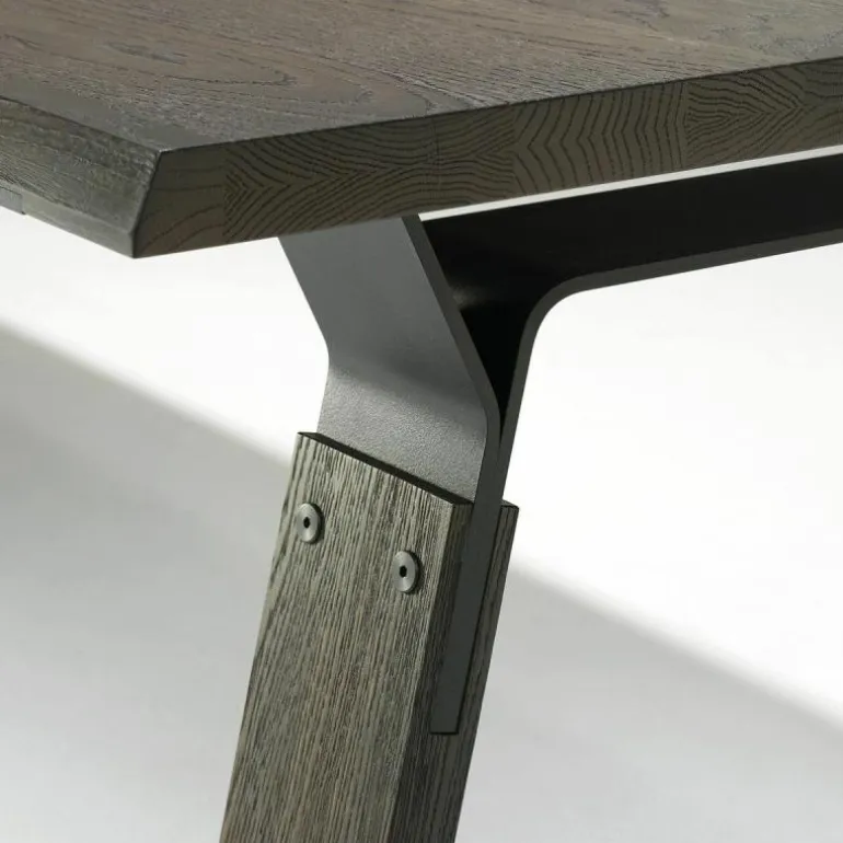 De Bridge Tafel heeft een stalen frame dat met laser cut-technology is vormgegeven. Het frame is verzonken in de houten elementen waardoor de verschillende materialen feilloos in elkaar overlopen. Het tafelblad bestaat uit één stuk massief eikenhout dat uit Frankrijk afkomstig is. Het blad kan in meerdere afwerkingen en afmetingen uitgevoerd worden.r