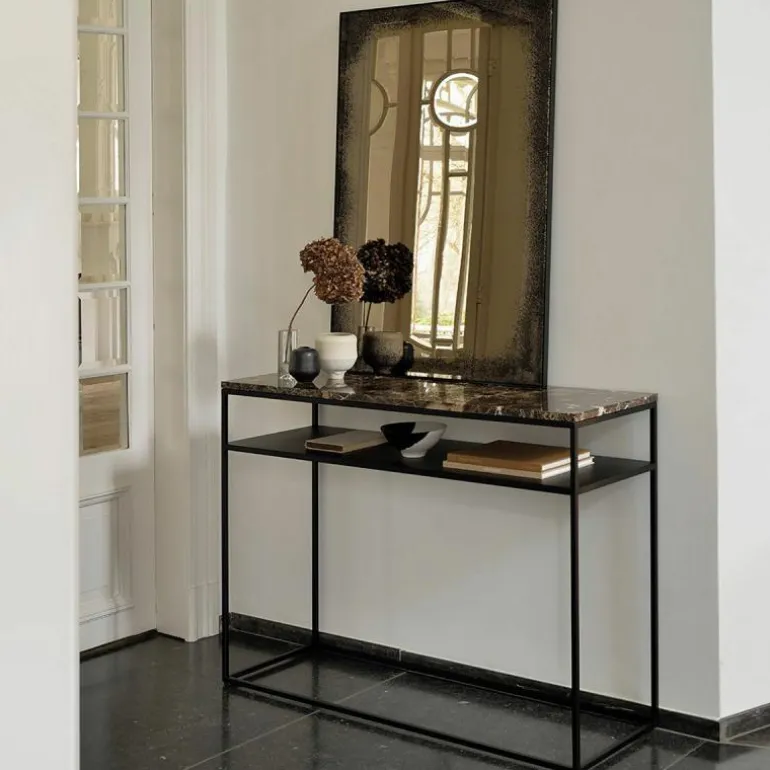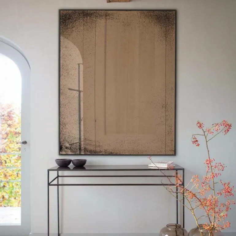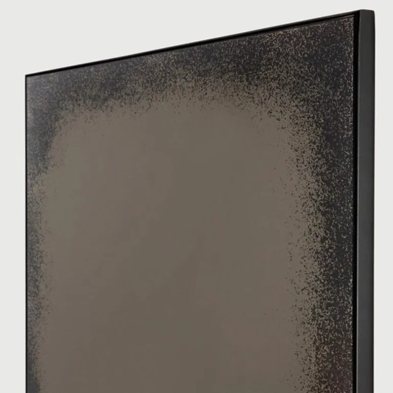 De Ethnicraft Bronze Spiegel is een ontwerp van Dawn Sweitzer. De spiegel heeft een industriële uitstraling, doordat hij een verouderingsproces heeft ondergaan. Hierdoor is het glas niet volledig helder meer, wat een stoer en verweerd effect oplevert. Op deze manier geeft Dawn Sweitzer een functioneel object een artistiek vleugje mee. De dunne metalen rand verzacht de stoere uitstraling van de spiegel en zorgt ervoor dat de Bronze Spiegel in elk interieur past. r