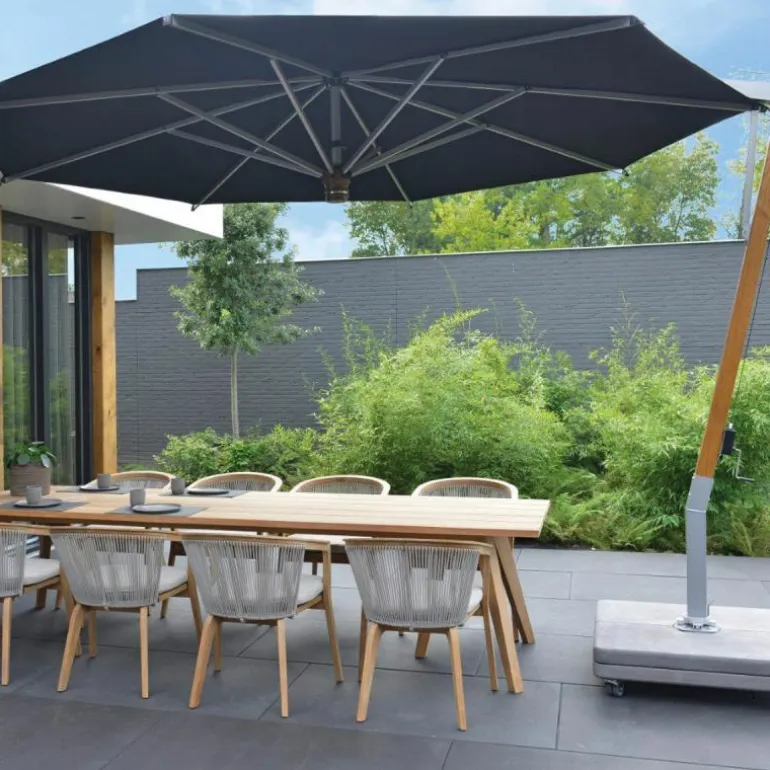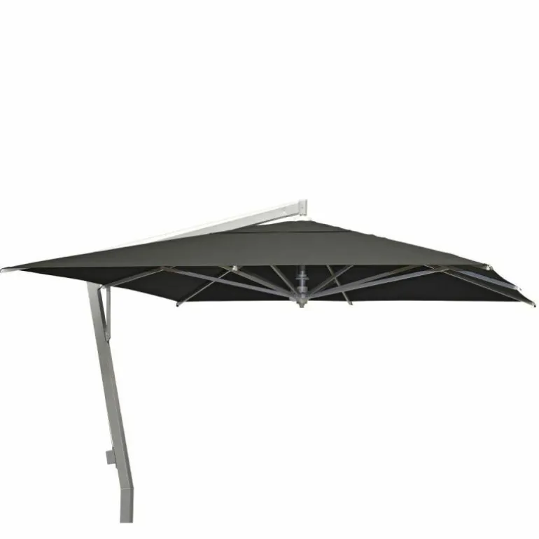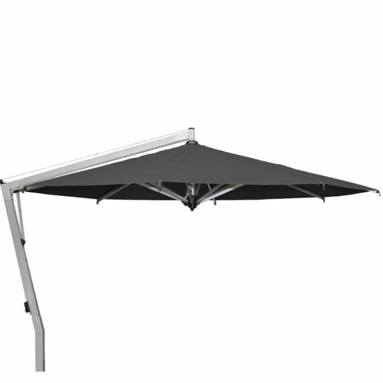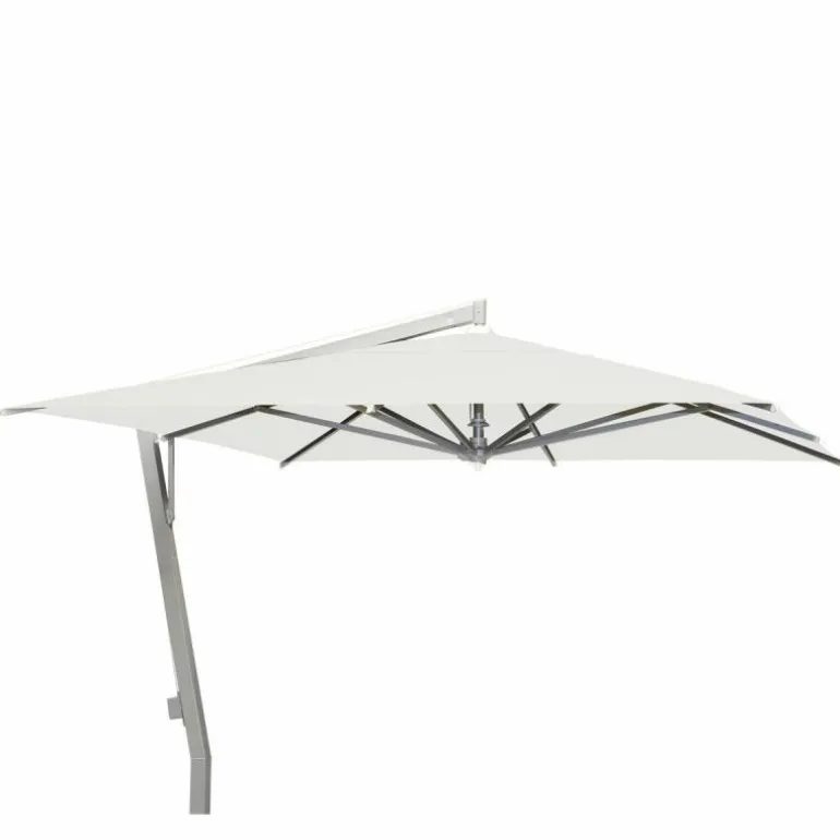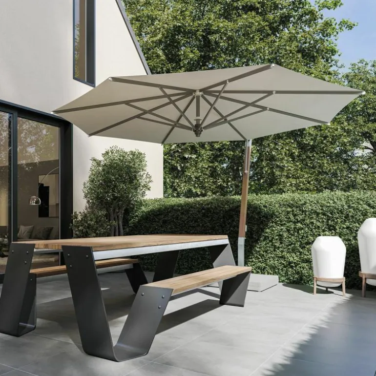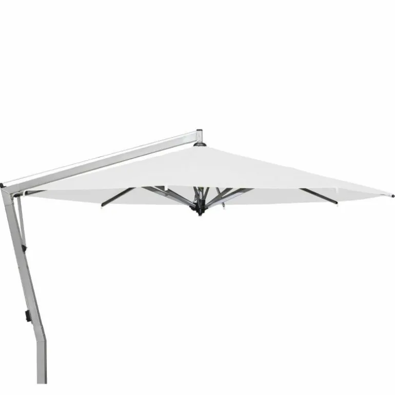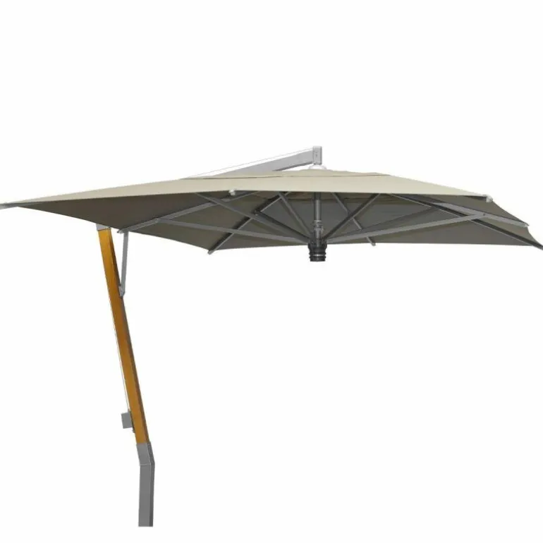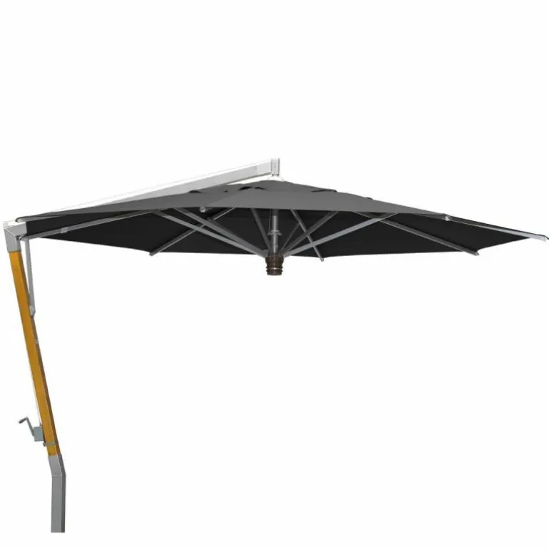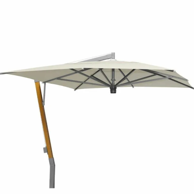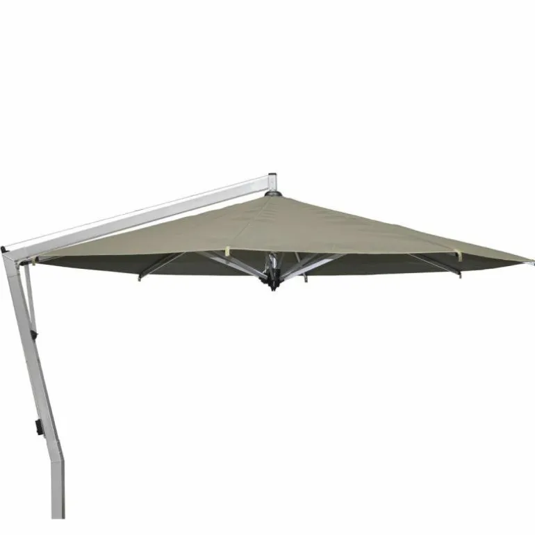 De parasol is in verschillende uitvoeringen verkrijgbaar. Kies voor een frame vervaardigd uit zilver- of grafietkleurig aluminium voor een strakke, eigentijdse look of ga voor de combinatie van zilverkleuring aluminium met teakhout voor een warmere uitstraling. Het doek is verkrijgbaar in twee verschillende stoffen: Sunbrella in de kleuren ecru, wit, taupe of zwart, of Batyline in de kleuren wit, coffee of zwart. Sunbrella is een water- en vuilafstotende stof, vervaardigd uit polyacrylaat. Het is UV-, kleur- en schimmelbestendig en daardoor tegen weer en wind bestand. Batyline wordt vervaardigd uit een polyestervezel die wordt gecoat met een laag PVC en daarna geweven. Door deze na het weven samen te smelten wordt de stof scheurbestendig en bestand tegen extreme weersomstandigheden. r
