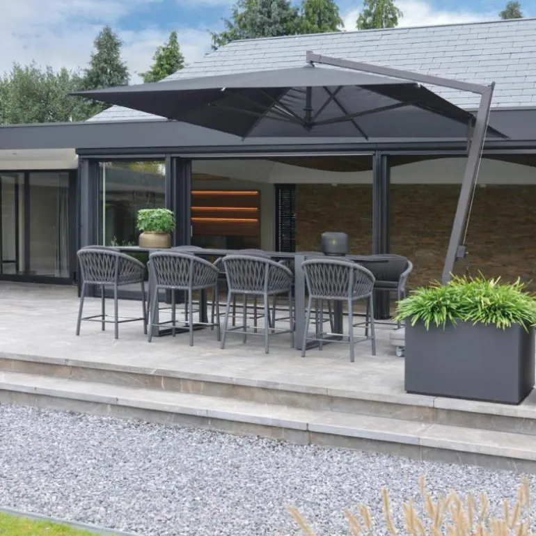 Tevens is de Capri Parasol te bestellen in drie verschillende afmetingen: een ronde variant met een diameter van 400 centimeter, een vierkante variant van 350 bij 350 centimeter en een rechthoekige variant van 300 bij 400 centimeter. De parasol wordt exclusief voet geleverd maar kan geplaatst worden in een verrijdbare betonvoet, een betonverankering of een terrasplaat van Borek. Neem hiervoor contact op met onze interieuradviseurs of kom langs in de winkel. Dan nemen we graag de mogelijkheden met u door!