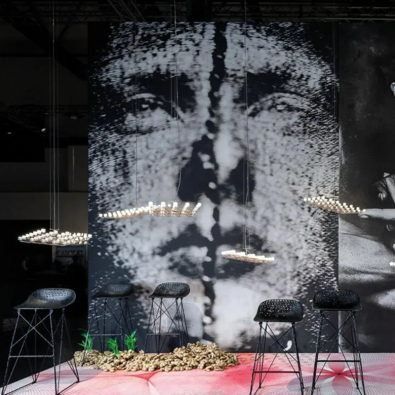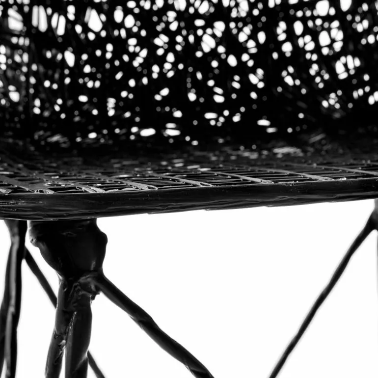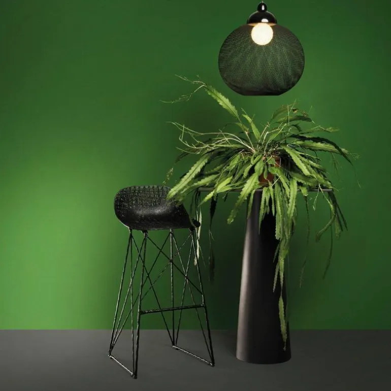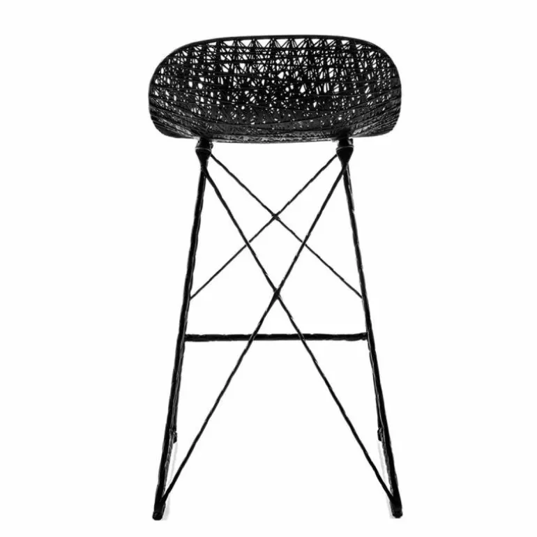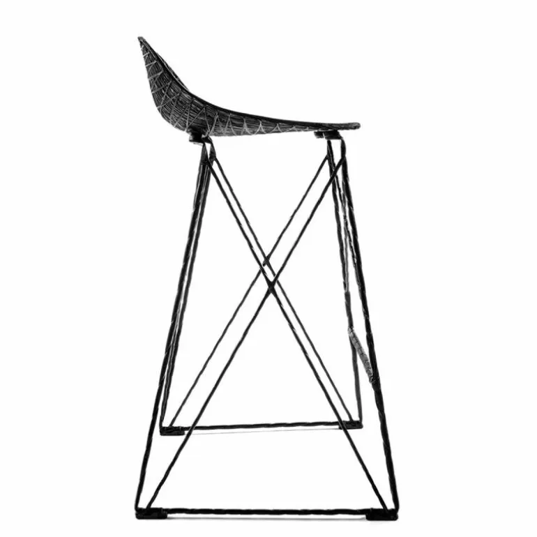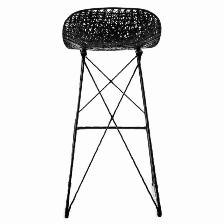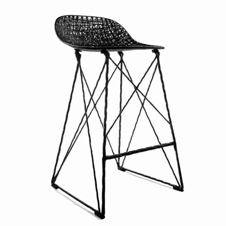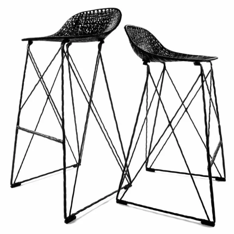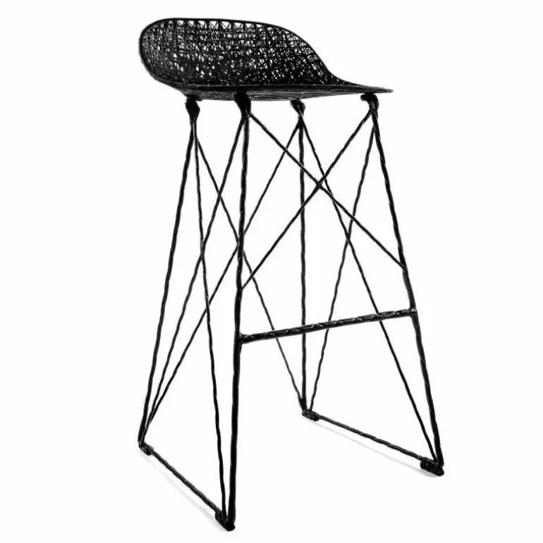 Het patroon in de barkruk lijkt geheel willekeurig, maar elk punt van de rand loopt door naar de vier punten waar het onderstel bevestigd is aan de zitting. Een staaltje vakmanschap dus. De unieke carbon stoel is dan ook te bewonderen in het Stedelijk Museum Amsterdam. Om urenlang zitplezier te garanderen kunt u het zitkussen mee bestellen. Deze is van kunstleder en niet geschikt om buiten te gebruiken. De barkruk is er in twee maten, met een zithoogte van 66 of 76 centimeter.