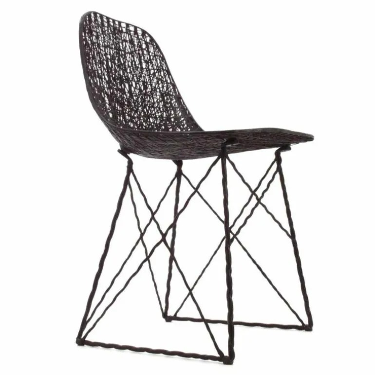 De Moooi Carbon Stoel is een prachtig ontworpen en kwalitatief zeer hoogwaardige stoel van Bertjan Pot, die hij samen ontwikkelde met Marcel Wanders. De constructie is vervaardigd van ingeharste Carbonvezels (koolstofvezels) die om een mal gewikkeld zijn. Hierdoor is de constructie oersterk. Zo sterk zelfs, dat er geen ijzeren frame nodig is. Bijkomstig voordeel is dat de Carbon Chair hierdoor slechts 1,1 kg. weegt. Bovendien oxideert carbon fibre niet, waardoor de stoel ook buiten gebruikt kan worden.Het patroon in de stoel lijkt geheel willekeurig, maar elk punt van de rand loopt door naar de vier punten waar het onderstel bevestigd is aan de zitting. Een staaltje vakmanschap dus. Deze unieke stoel is dan ook te bewonderen in het Stedelijk Museum Amsterdam. Om urenlang zitplezier te garanderen kunt u het zitkussen en het rugkussen mee bestellen. Deze zijn van kunstleder en niet geschikt om buiten te gebruiken.