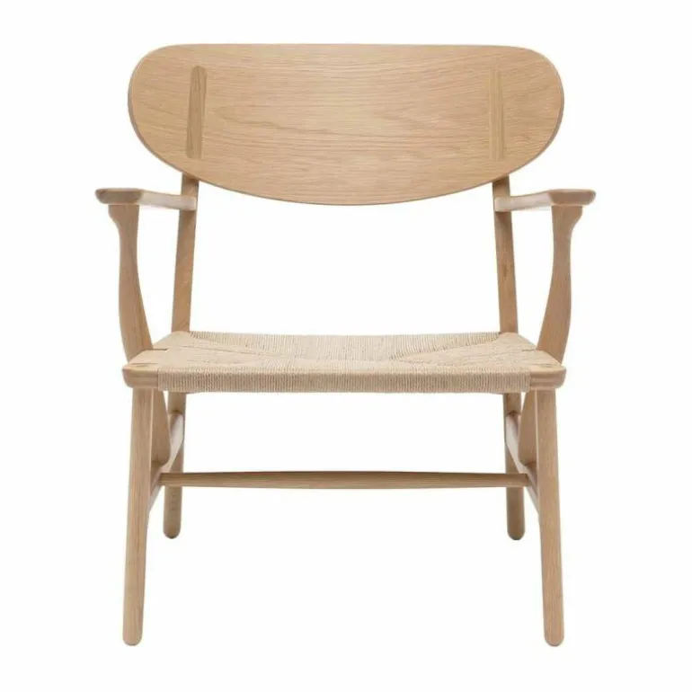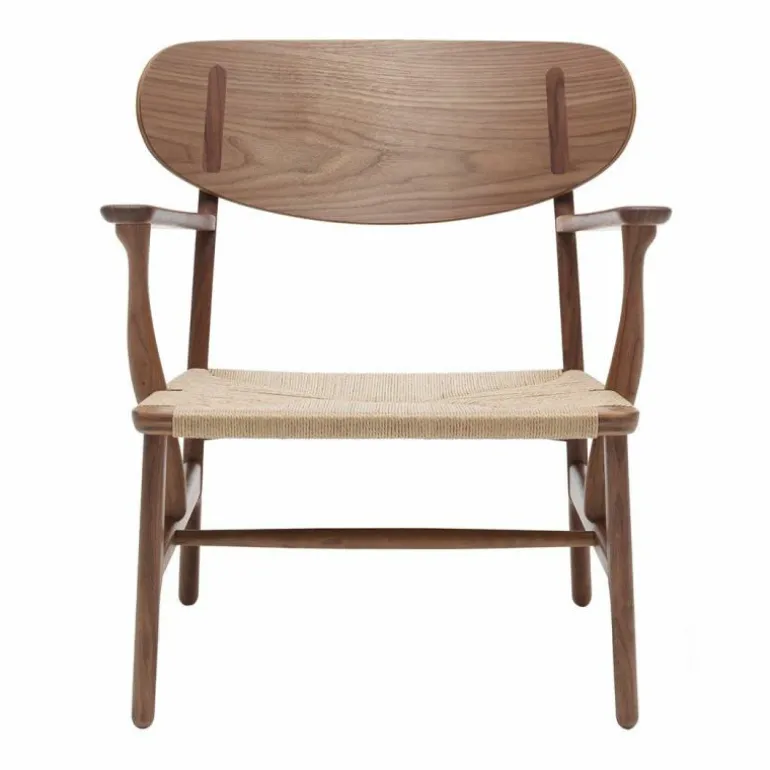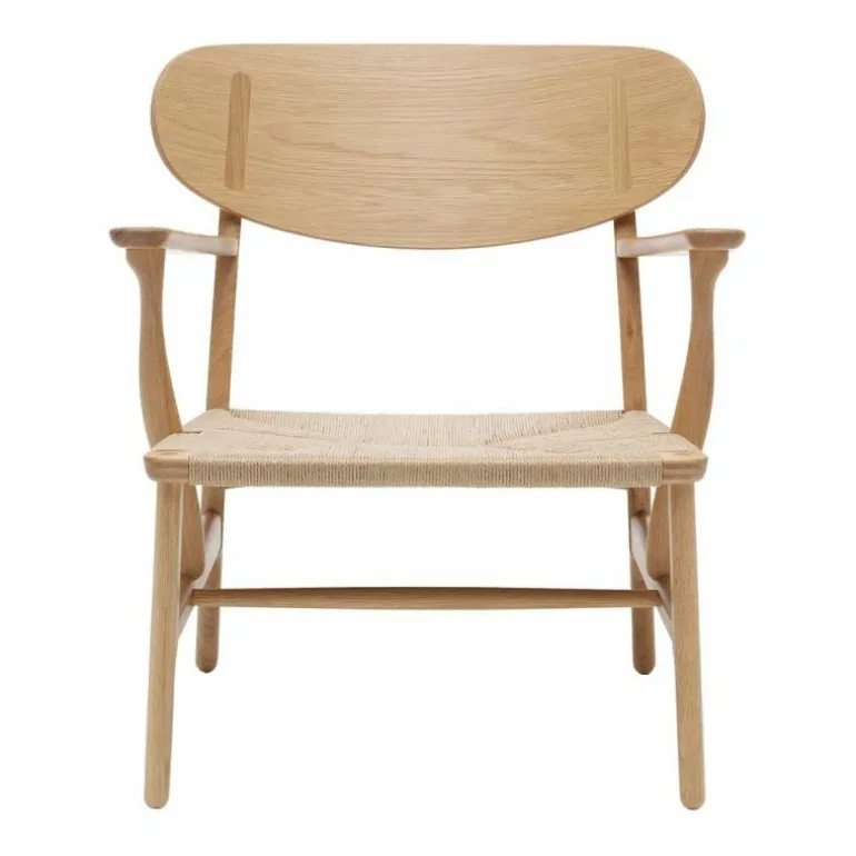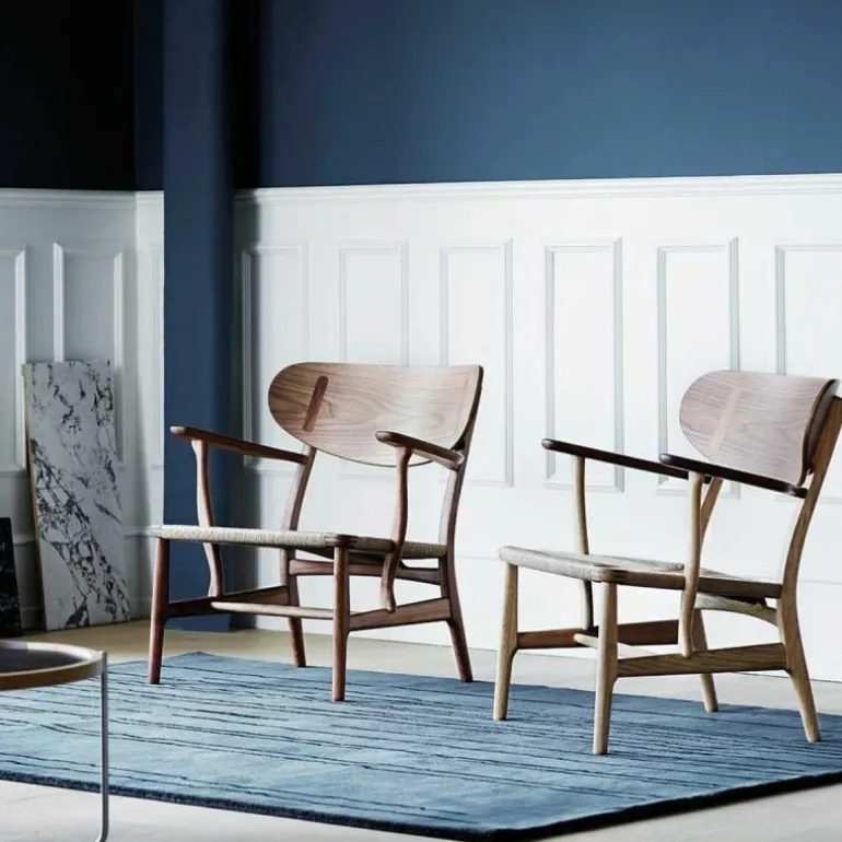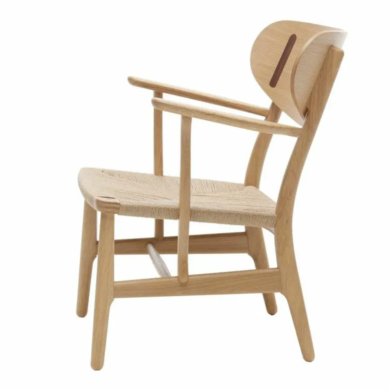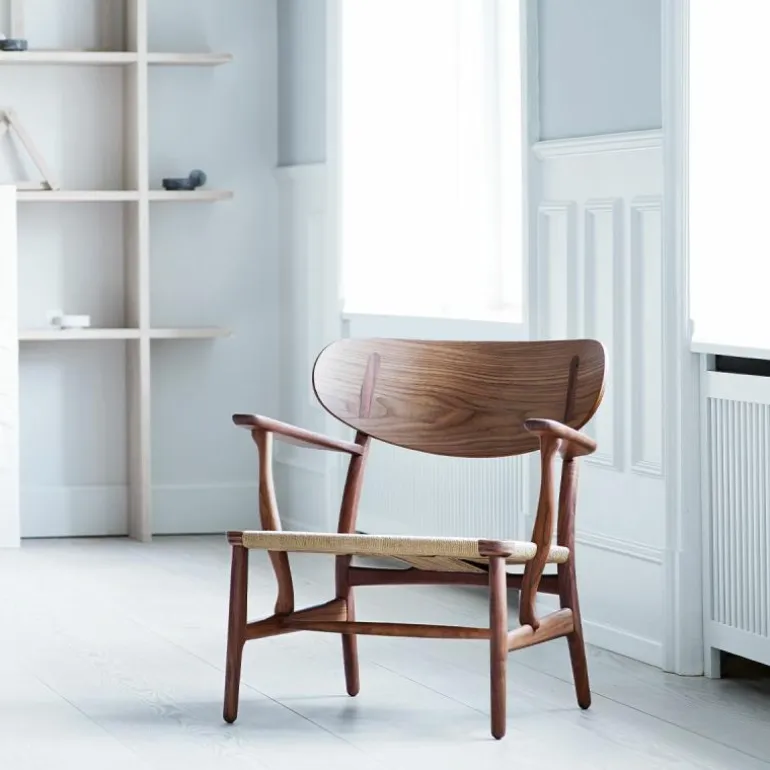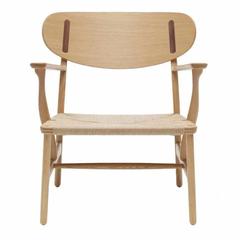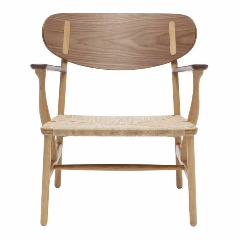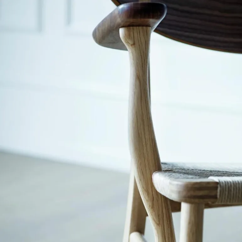 De cover cap op de rugleuning kan naar keuze vervaardigd worden uit eiken- of walnoothout. Kies voor eenzelfde afwerking als het frame van de stoel, of juist voor een andere afwerking voor een mooi contrast. De zitting van de CH22 is verkrijgbaar in naturel of zwart.r