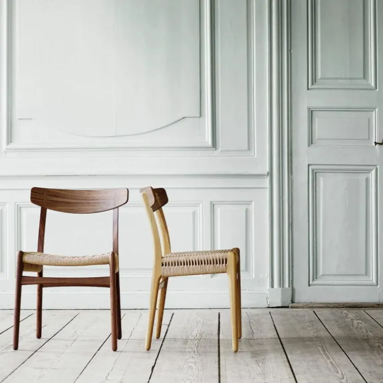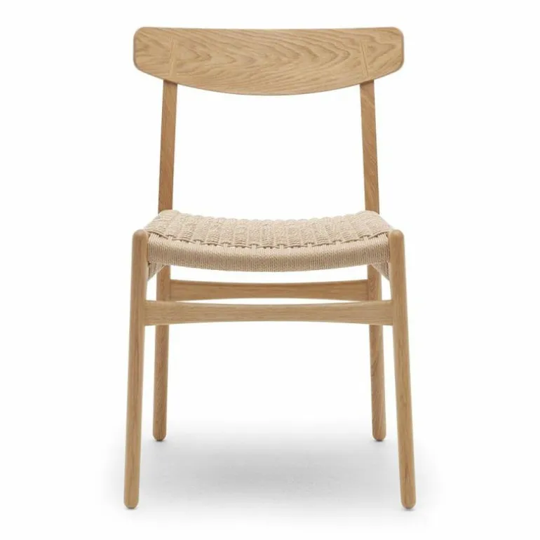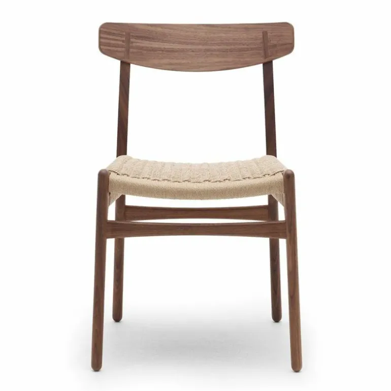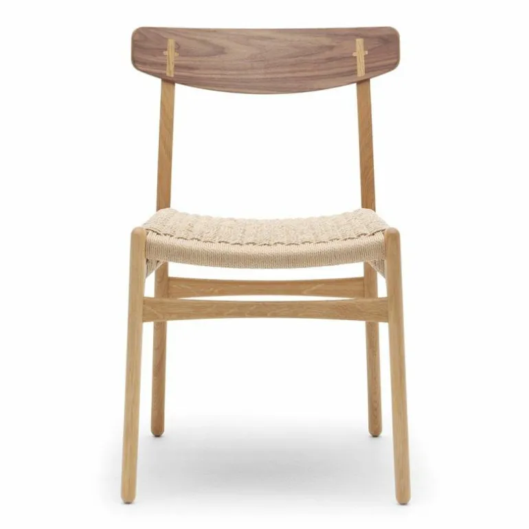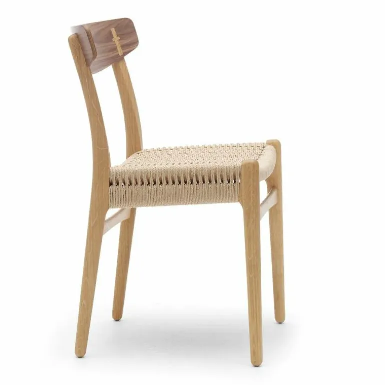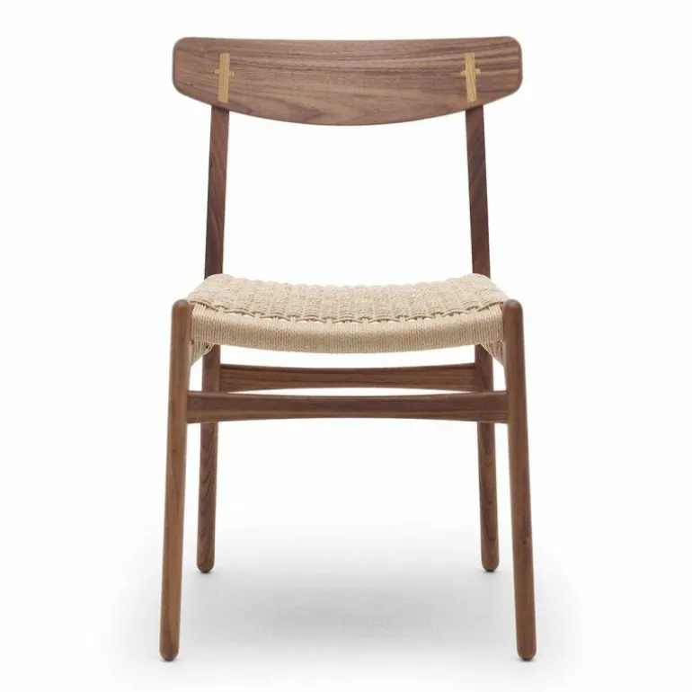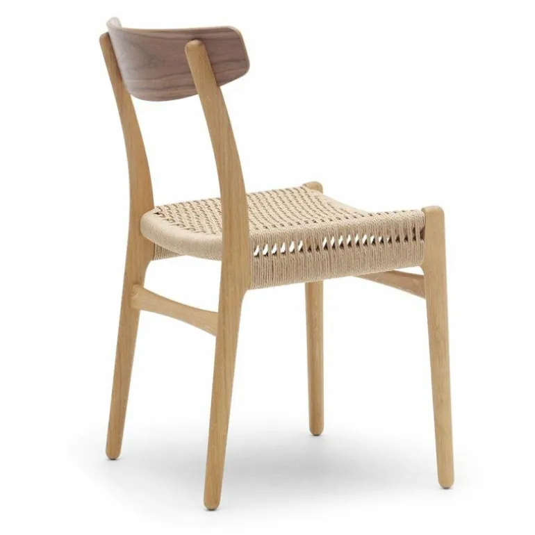 De CH23 Stoel is gemaakt van massief eiken, walnoothout of een combinatie van deze houtsoorten. De rugleuning is van geperst fineer en de zitting is dubbel gevlochten met de hand. De stoel heeft geen armleuningen, waardoor hij erg praktisch is te gebruiken als eetkamerstoel en ook goed zijn weg vindt in kleinere ruimtes. r