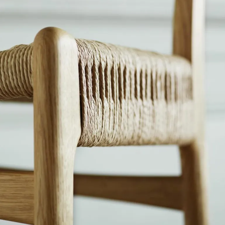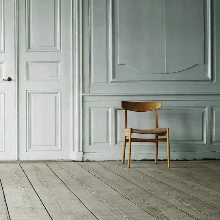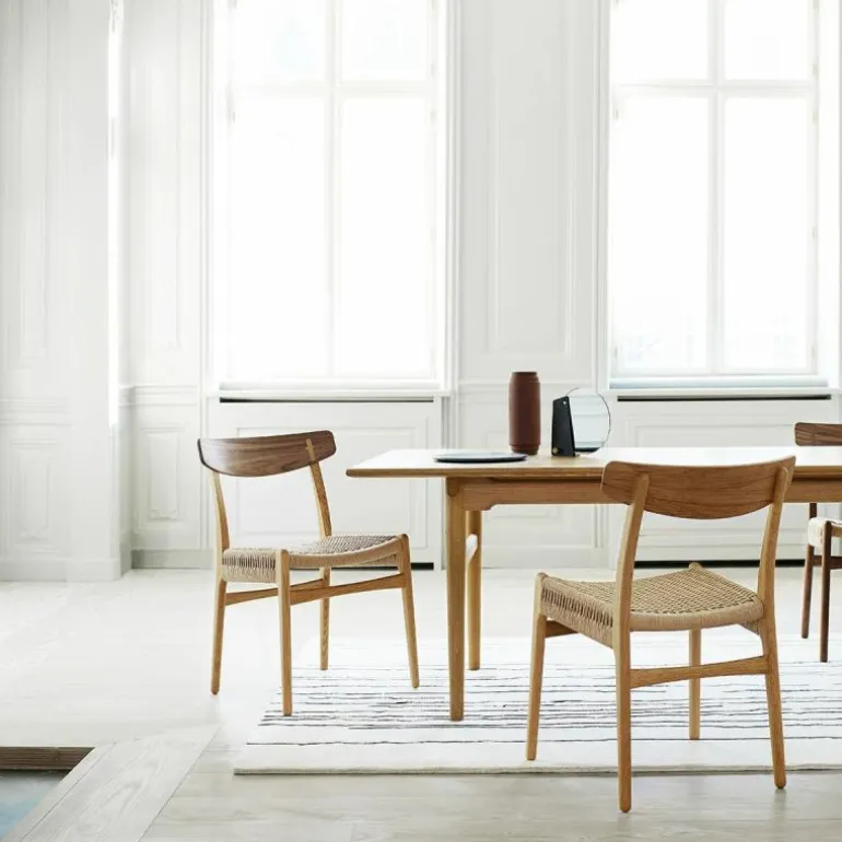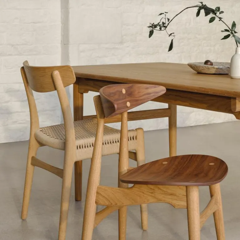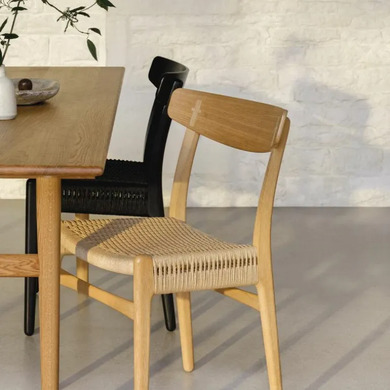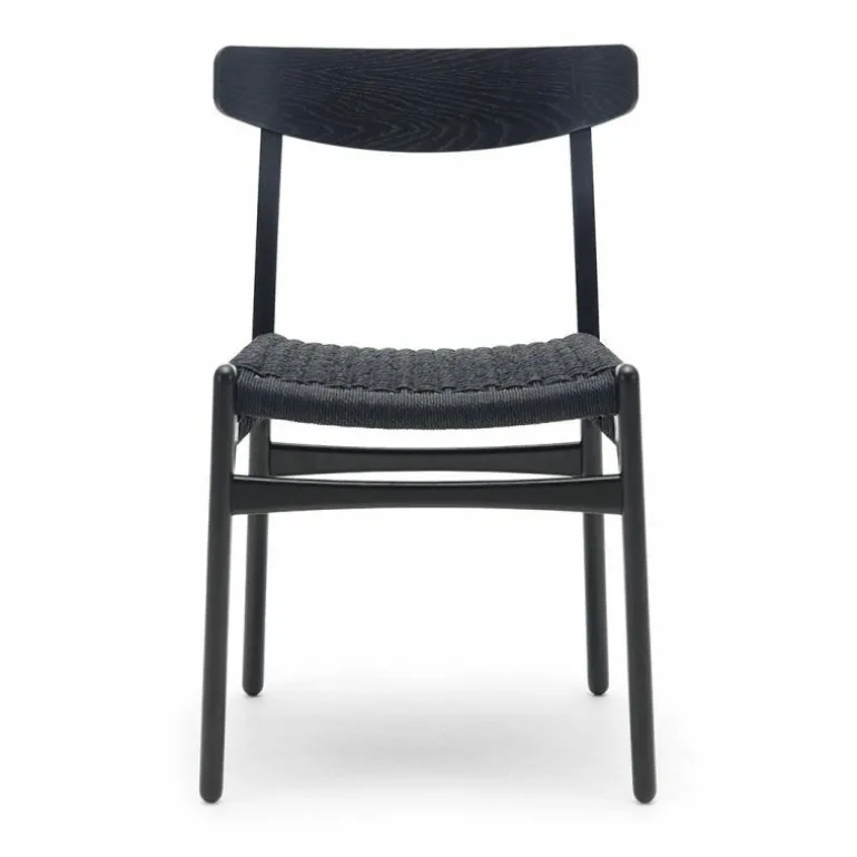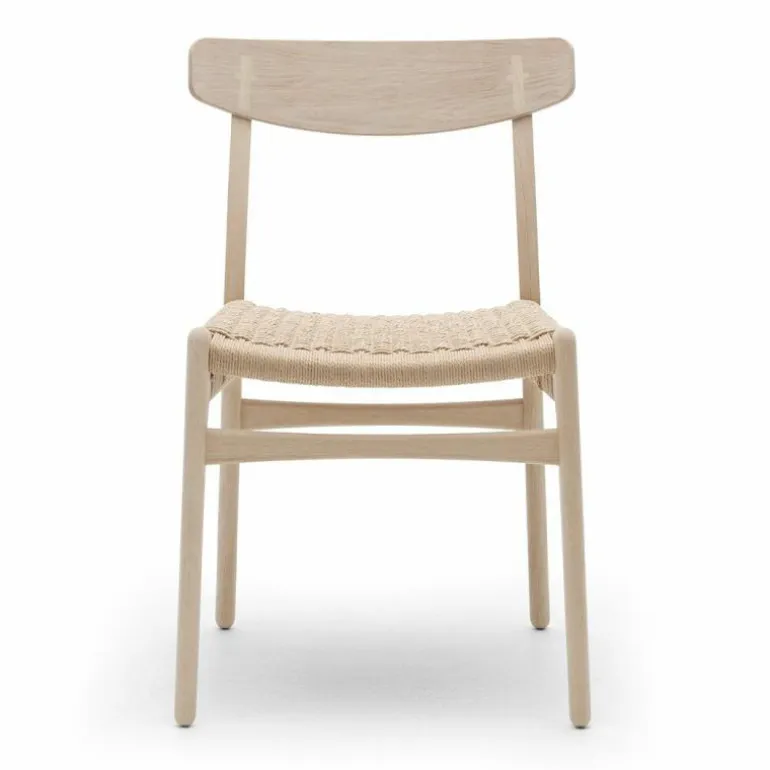 De CH23 Stoel is gemaakt van massief eiken, walnoothout of een combinatie van deze houtsoorten. De rugleuning is van geperst fineer en de zitting is dubbel gevlochten met de hand. De stoel heeft geen armleuningen, waardoor hij erg praktisch is te gebruiken als eetkamerstoel en ook goed zijn weg vindt in kleinere ruimtes. r