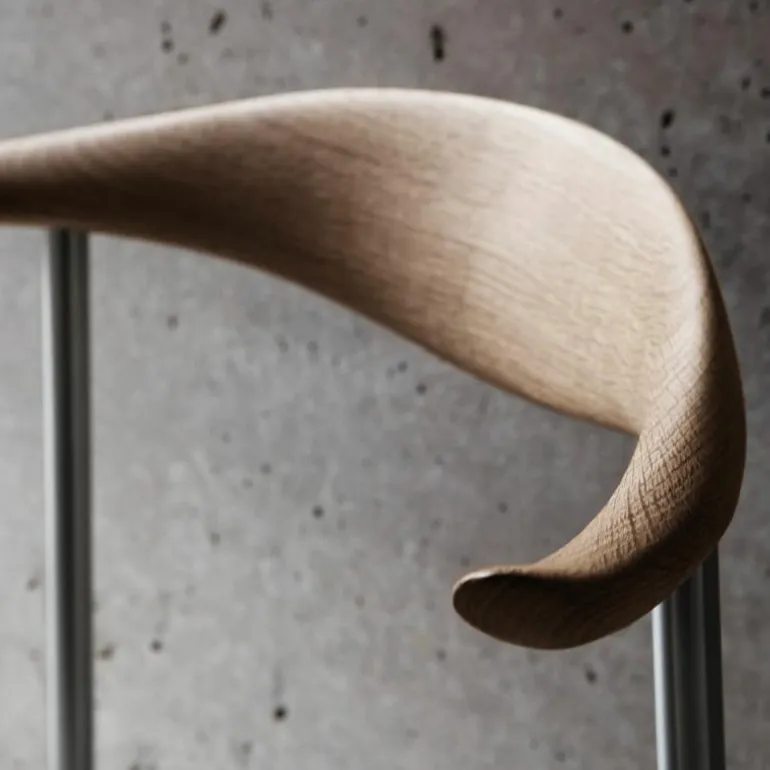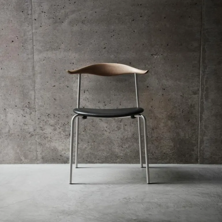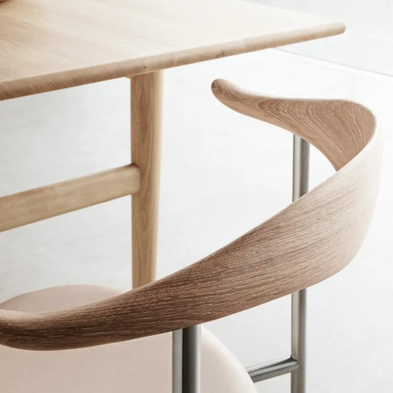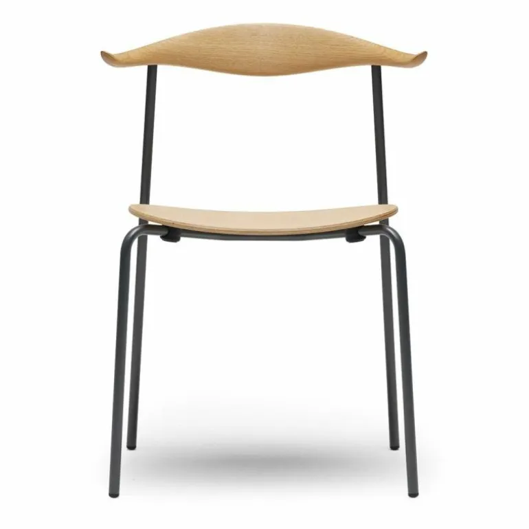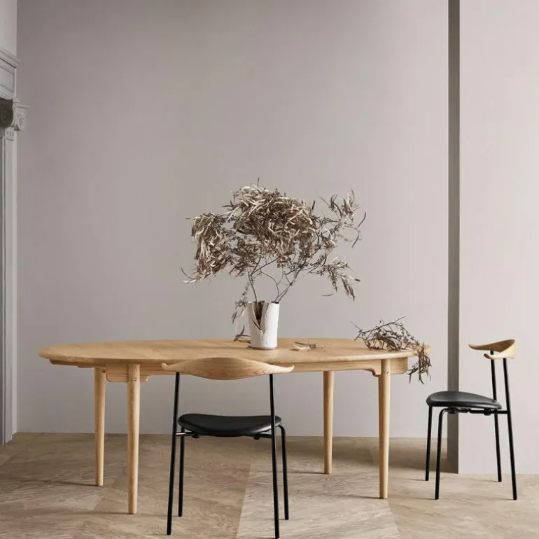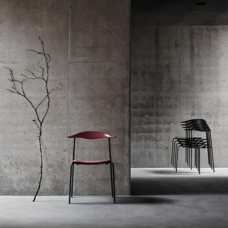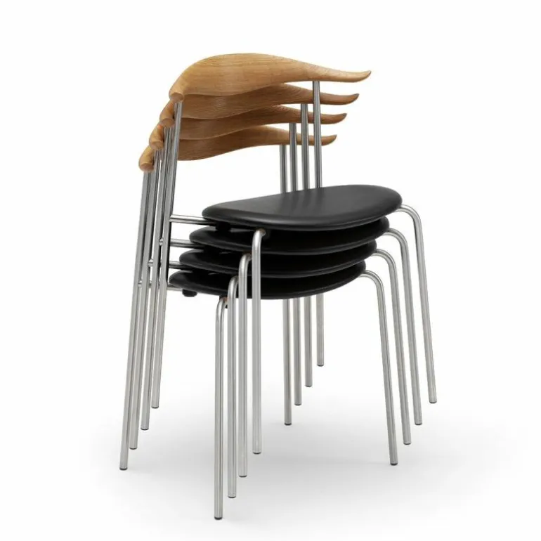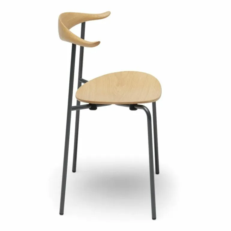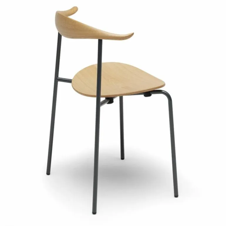 De ovale houten zitting wordt ondersteund door een stalen frame. De combinatie van materialen en het minimalistische design resulteert in een lichte, organische en industriële uitstraling. Een fijne bijkomstigheid is dat de stoelen stapelbaar zijn en dus geschikt voor als je regelmatig meerdere gasten ontvangt.r