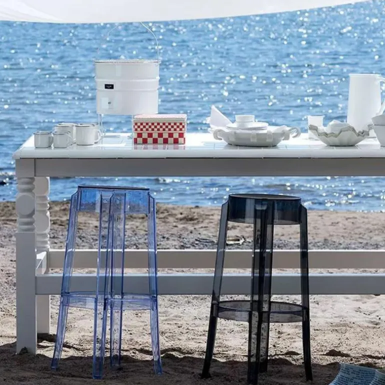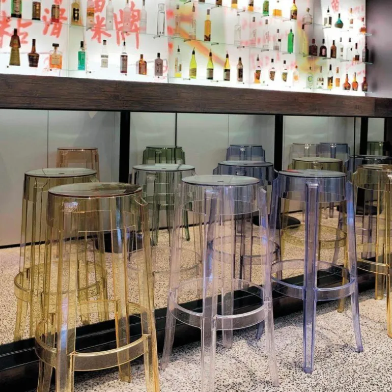 De Charles Ghost Barkruk past zich door zijn vormgeving en kleurstelling aan in een gesloten- en open omgevingen en ze past bij om het even welk meubilair en in om het even welke cultuur. r