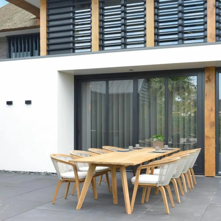 Deze eettafel is onderdeel van de Chepri collectie en dankt zijn karakter aan het royale tafelblad en de zes poten, beide vervaardigd uit massief teakhout dat bekendstaat om zijn weerbaarheid. Deze houtsoort is van nature rijk aan oliën en is dan ook tegen weer en wind bestand, vandaar dat het veel gebruikt wordt voor tuinmeubelen. Het teakhout zal na verloop van tijd op natuurlijke wijze vergrijzen, maar kan door behandeling zijn natuurlijke kleur behouden of terugkrijgen. Om het massieve tafelblad te verstevigen wordt het ondersteund door een onzichtbaar onderstel van rvs. r