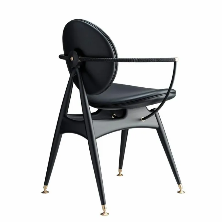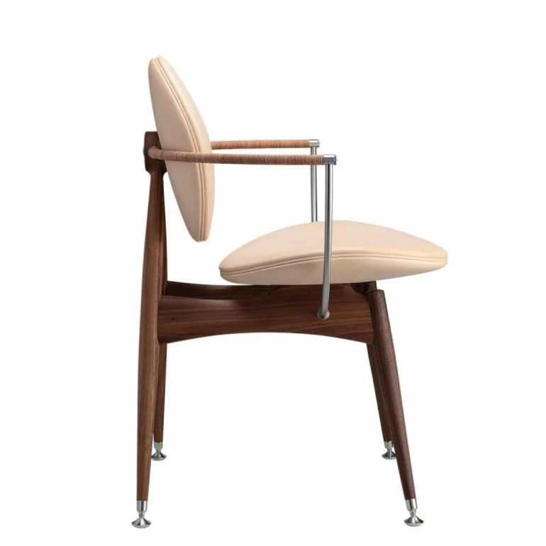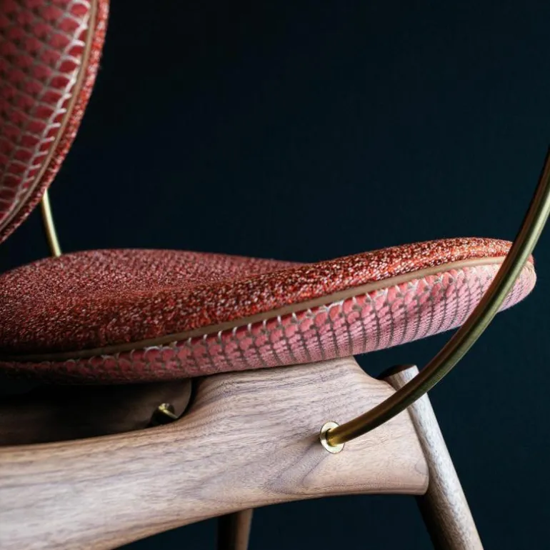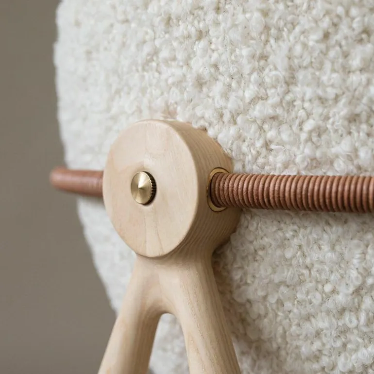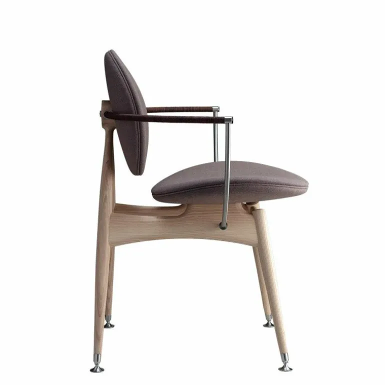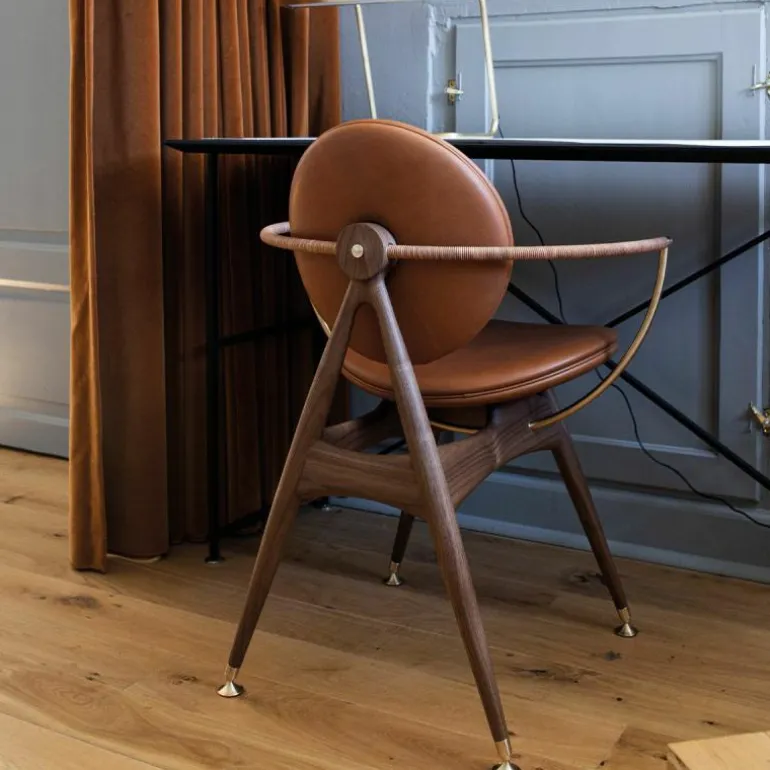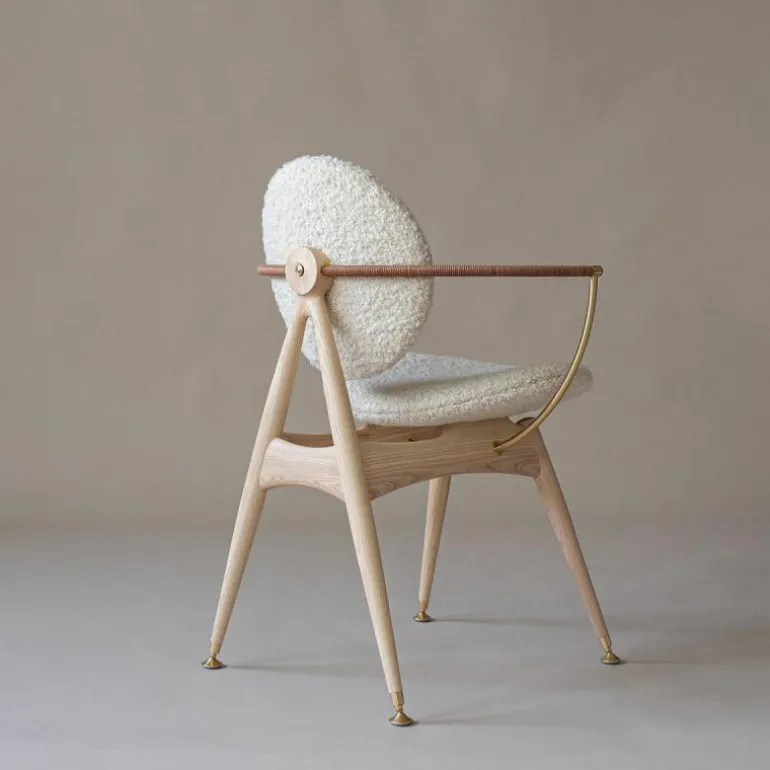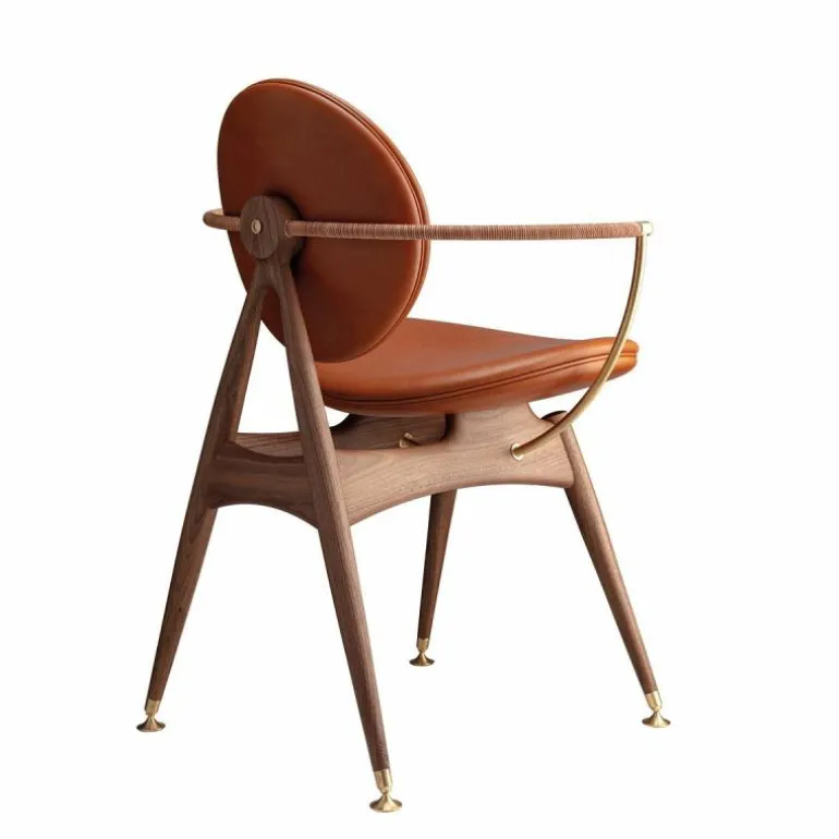 Om de zitting heen bevindt zich een schraagvormig frame van solide hout. Dit frame kan worden uitgevoerd in notenhout, zwart gebeitst essenhout, wit geolied essenhout, eikenhout en gerookt eikenhout. Uit het frame lopen twee armleuningen van messing, verouderd messing of RVS. Deze zijn ieder opgedeeld in twee bogen van 45 graden, één horizontaal en één verticaal. De horizontale boog wordt voorzien van een lederen koord, dat comfort schenkt aan de armleuning. Het houten frame wordt tevens gecombineerd met ronde metalen details aan de onder- en achterzijde van de stoel, in hetzelfde materiaal als de armleuningen. De metalen elementen vormen een prachtig contrast met de natuurlijke uitstraling van de rest van de stoel.r