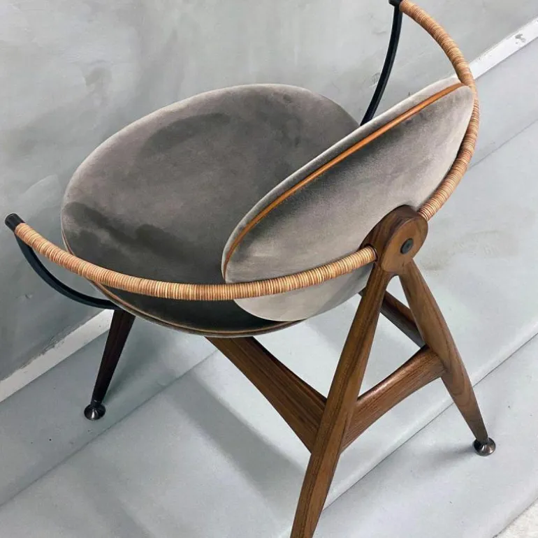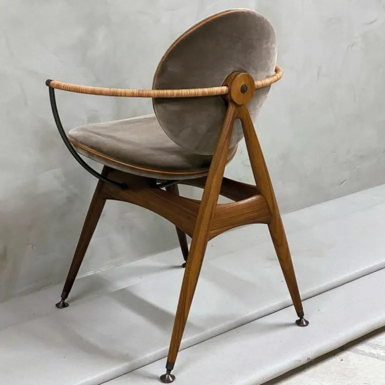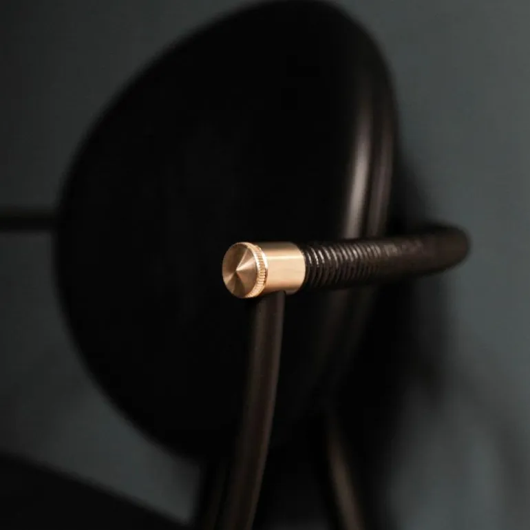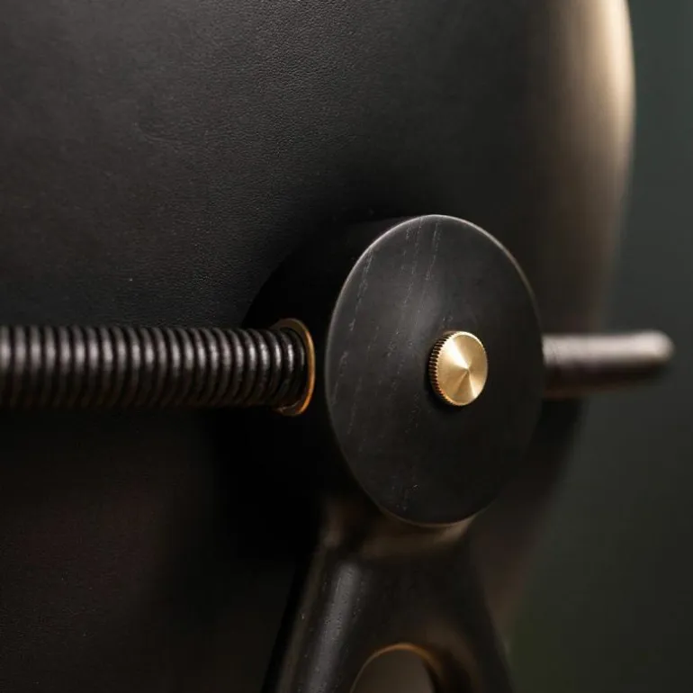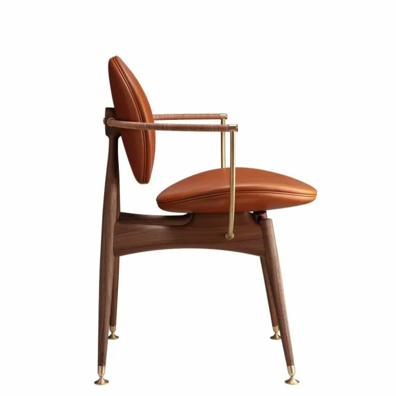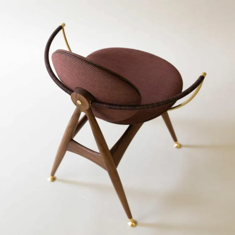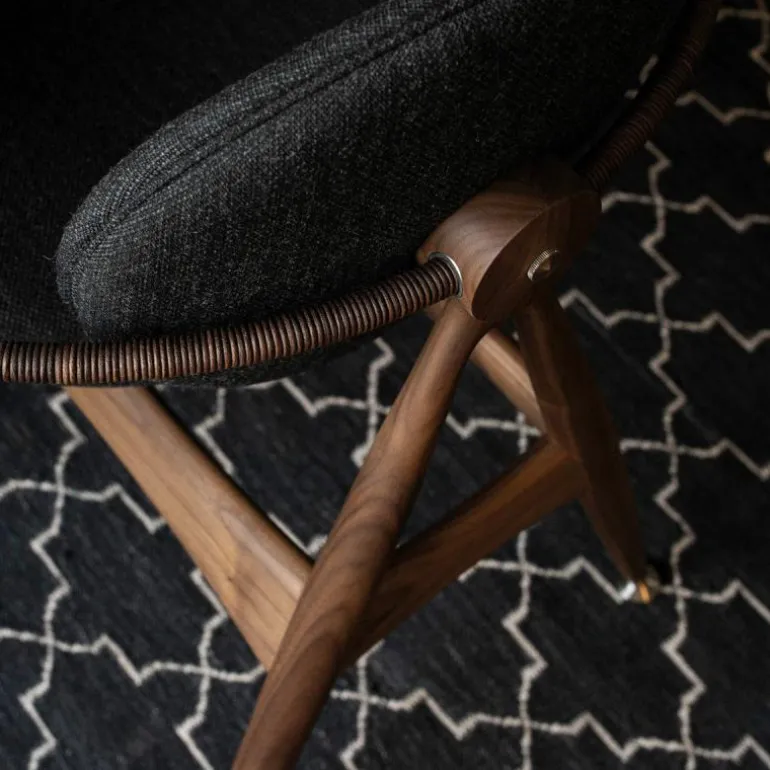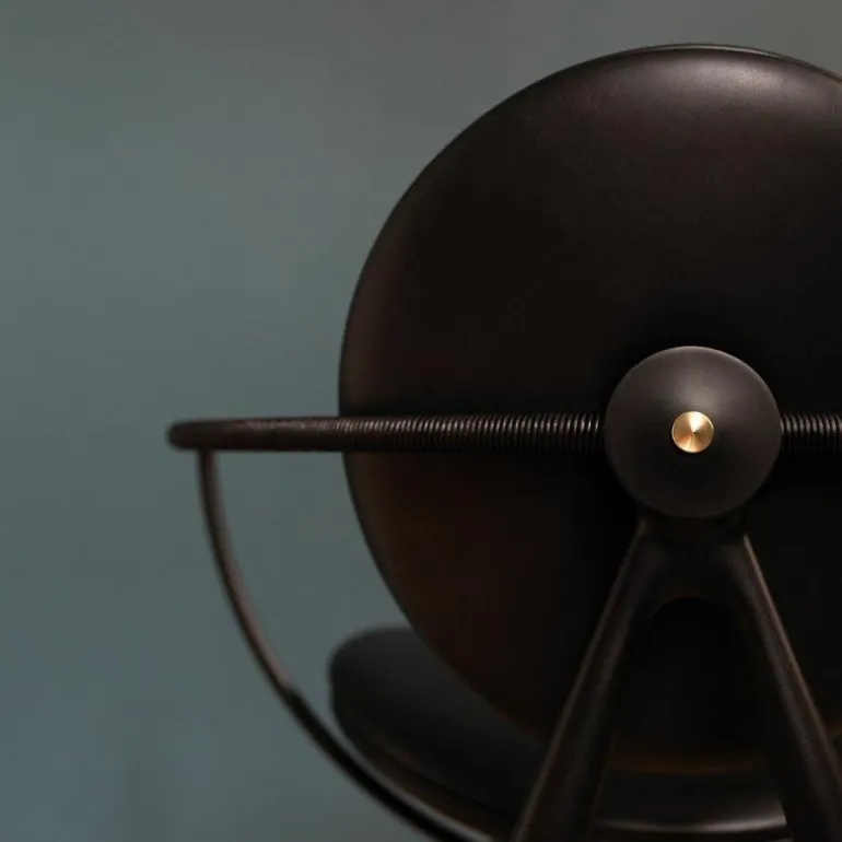 Om de zitting heen bevindt zich een schraagvormig frame van solide hout. Dit frame kan worden uitgevoerd in notenhout, zwart gebeitst essenhout, wit geolied essenhout, eikenhout en gerookt eikenhout. Uit het frame lopen twee armleuningen van messing, verouderd messing of RVS. Deze zijn ieder opgedeeld in twee bogen van 45 graden, één horizontaal en één verticaal. De horizontale boog wordt voorzien van een lederen koord, dat comfort schenkt aan de armleuning. Het houten frame wordt tevens gecombineerd met ronde metalen details aan de onder- en achterzijde van de stoel, in hetzelfde materiaal als de armleuningen. De metalen elementen vormen een prachtig contrast met de natuurlijke uitstraling van de rest van de stoel.r