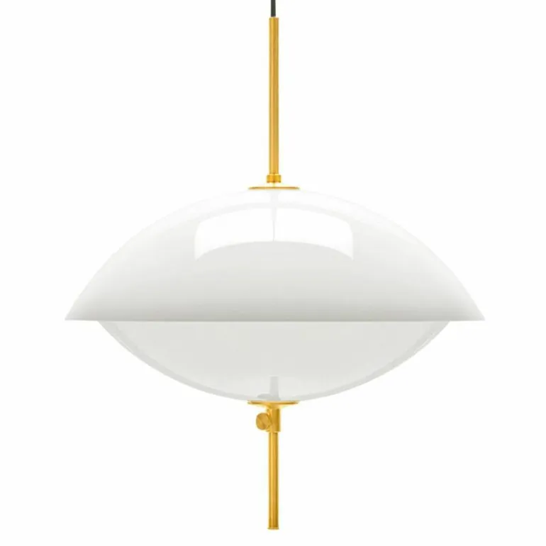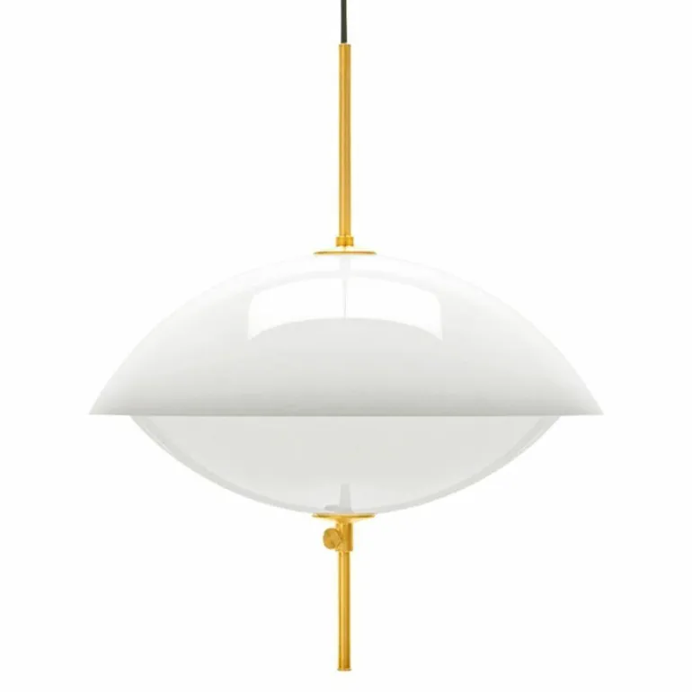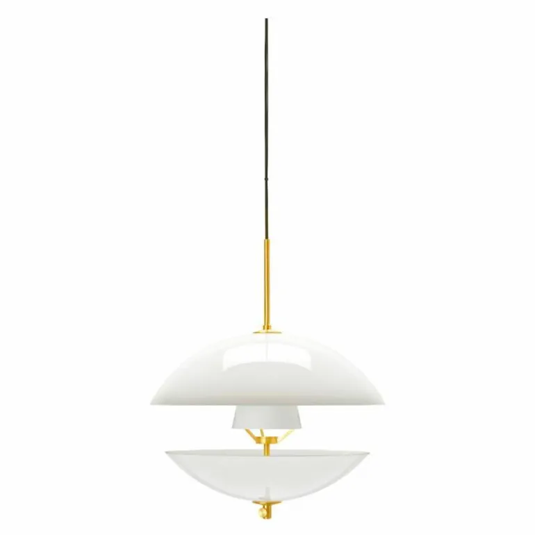 De schermen van de lamp zijn gemaakt van mondgeblazen opaalglas en messing. Door het handgemaakte karakter kunnen er variaties zijn in dikte en textuur van de kappen. De messing details zijn zowel esthetisch als functioneel. Door de onderkant los te schroeven kan de onderste kap namelijk lager worden gehangen zodat de lichtbron zichtbaar wordt. De hanglamp is verkrijgbaar in twee afmetingen. U kunt kiezen voor een variant met een diameter van 44 centimeter en hoogte van 52,2 centimeter of een variant met een diameter van 55 centimeter en hoogte van 54 centimeter. r