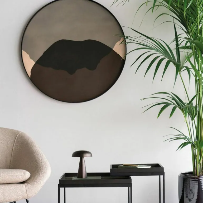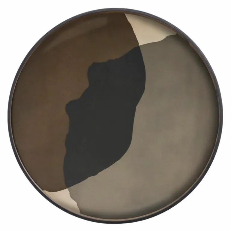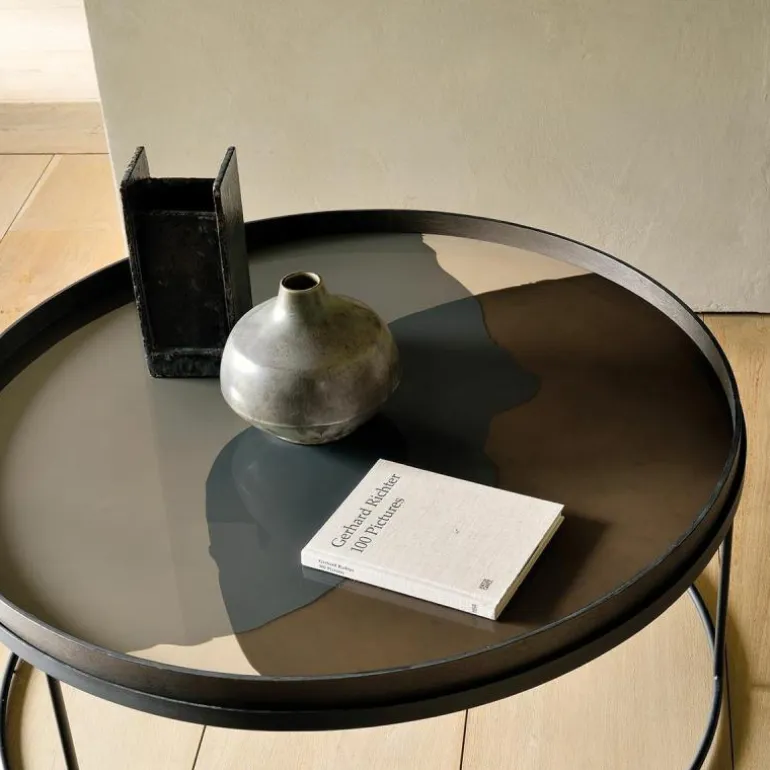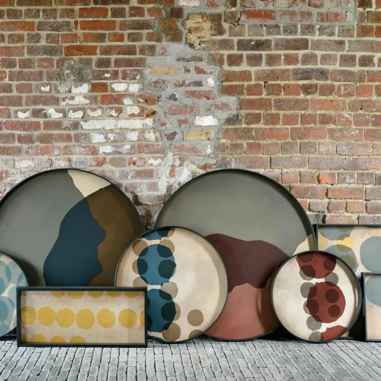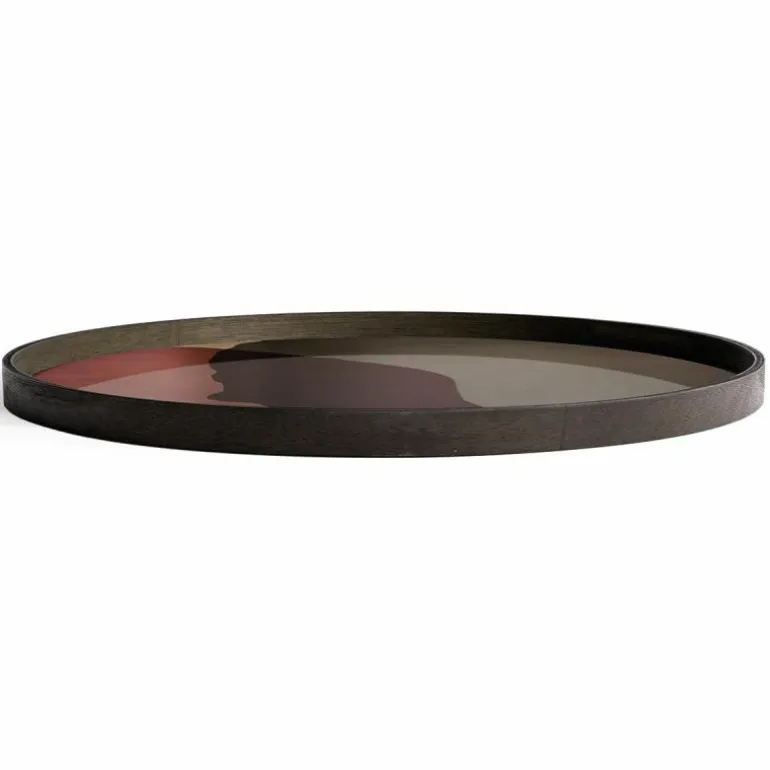 Het dienblad is verkrijgbaar in twee uitvoeringen, heeft een diameter van 92 centimeter en opstaande randen met een hoogte van 4 centimeter. Het design is met de hand gemaakt van helder glas met een houten rand en onderkant. De verf wordt handmatig aangebracht op het glazen blad, wat elk design uniek maakt. Het dienblad is ook prachtig te combineren met de XL variant Round Tray Table van Ethnicraft. r