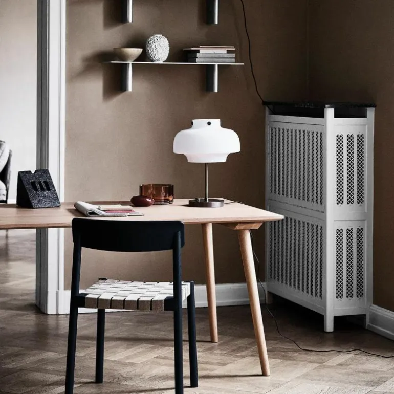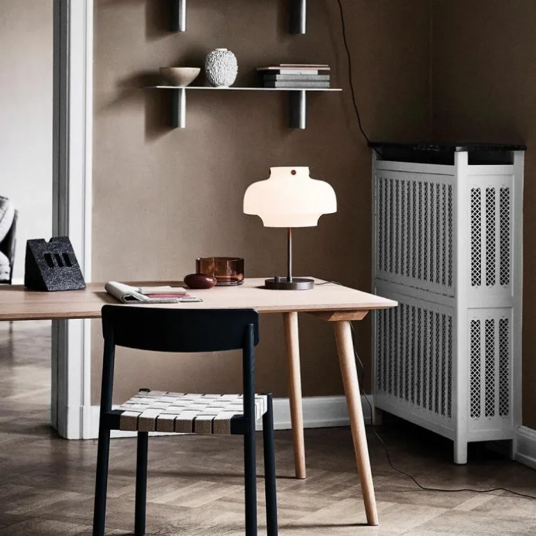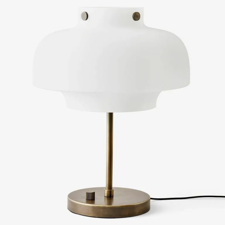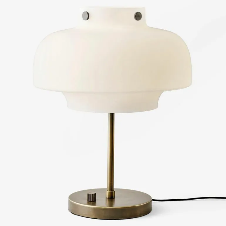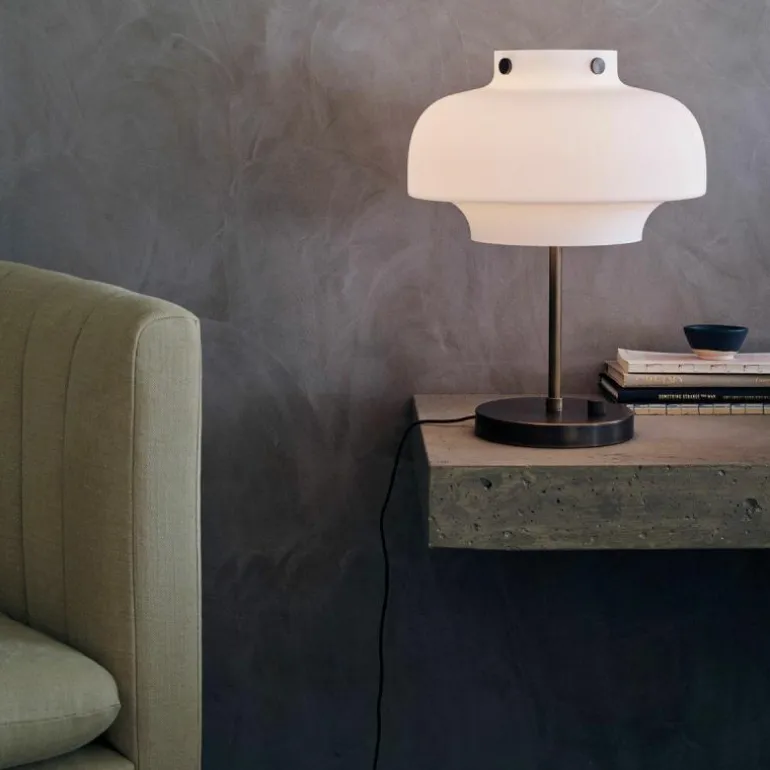 De Copenhagen lampenserie is geïnspireerd door de gaslampen die begin vorige eeuw de geplaveide straten in de haven van Kopenhagen verlichtten. In het moderne uiterlijk van de tafellamp met opaalglass en messing zijn subtiele maritieme invloeden te zien, die de lamp een klassiek, maar eigenzinnig karakter geven. Er zit een ingebouwde LED-dimmer op de draad van deze lamp, waardoor er een keuze is uit energiek wit licht om bijvoorbeeld bij te werken en warmer licht voor een kalm effect. Tafellamp Copenhagen heeft een diameter van 33 centimeter en is 42 centimeter hoog.