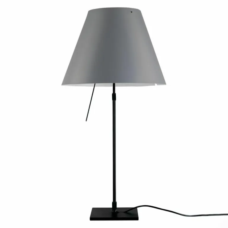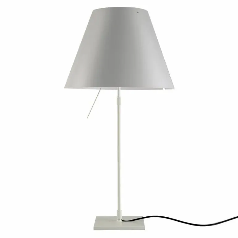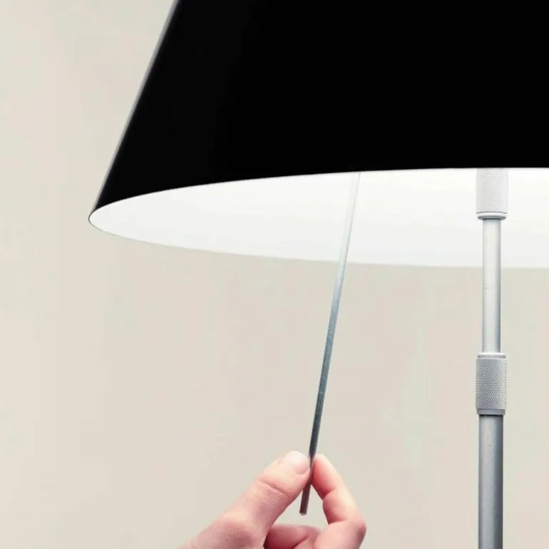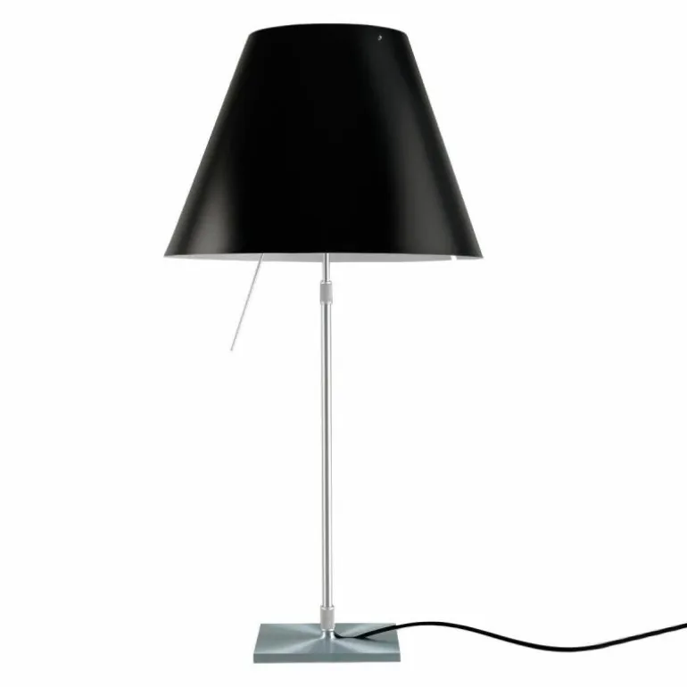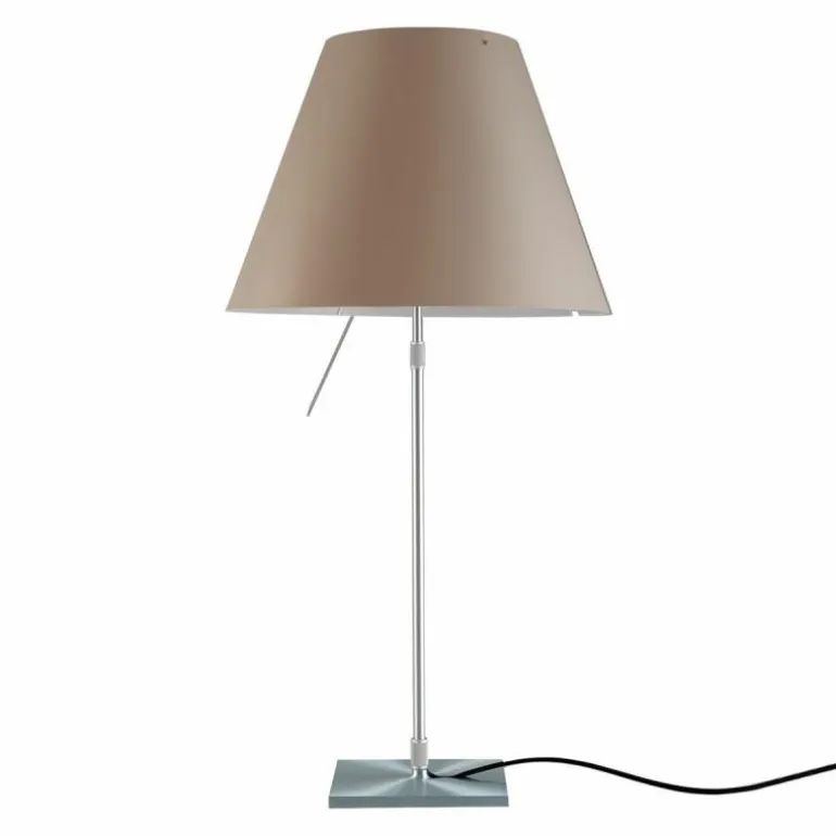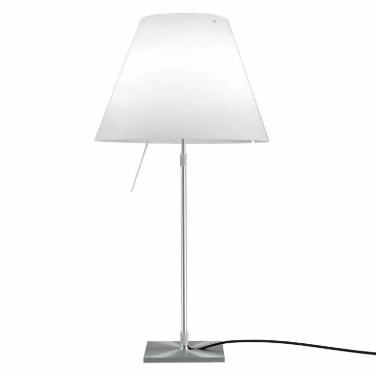 De Luceplan Costanza Tafellamp is in hoogte verstelbaar met een hoogte van 76 centimeter tot 110 centimeter. De lampenstandaard is naar keuze uitvoerbaar in aluminium, zwart of messing. r