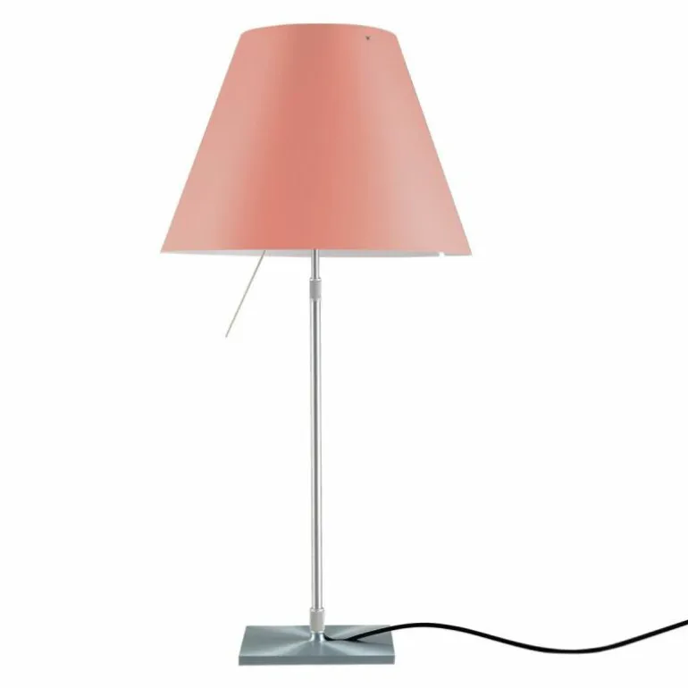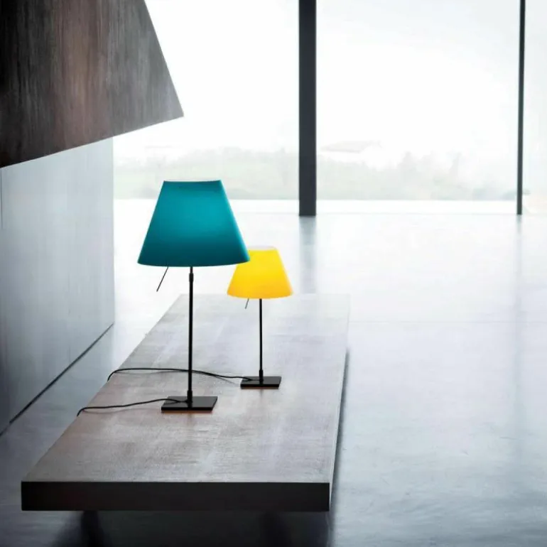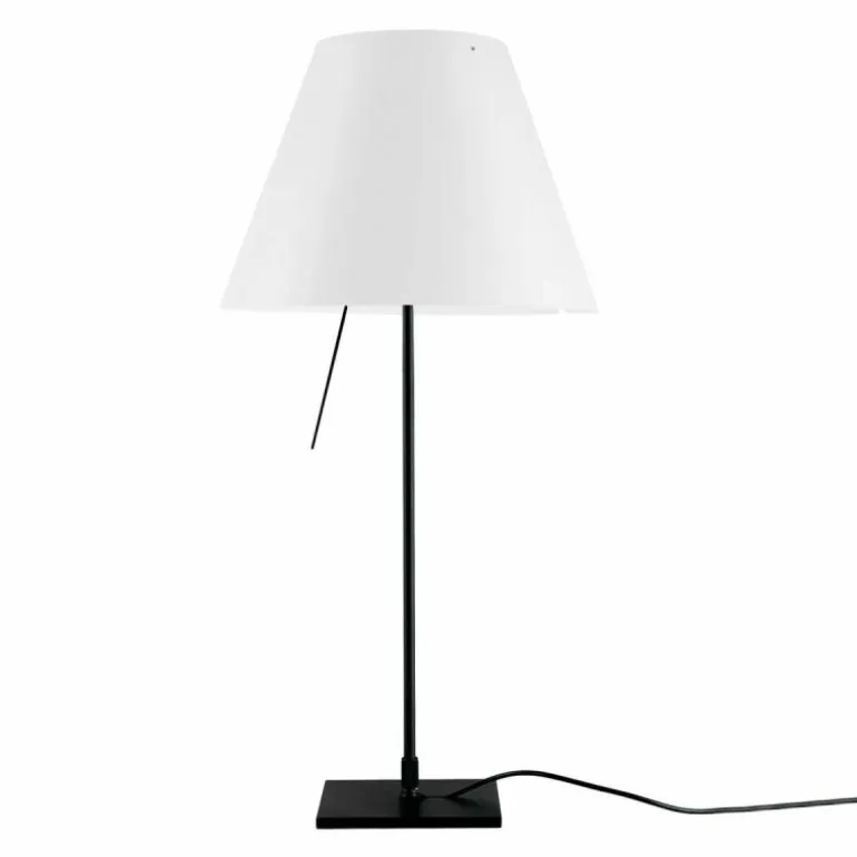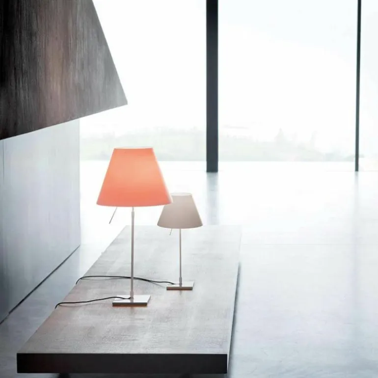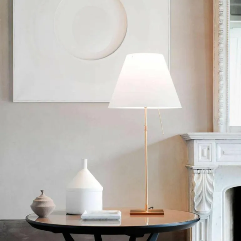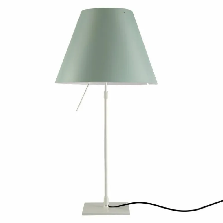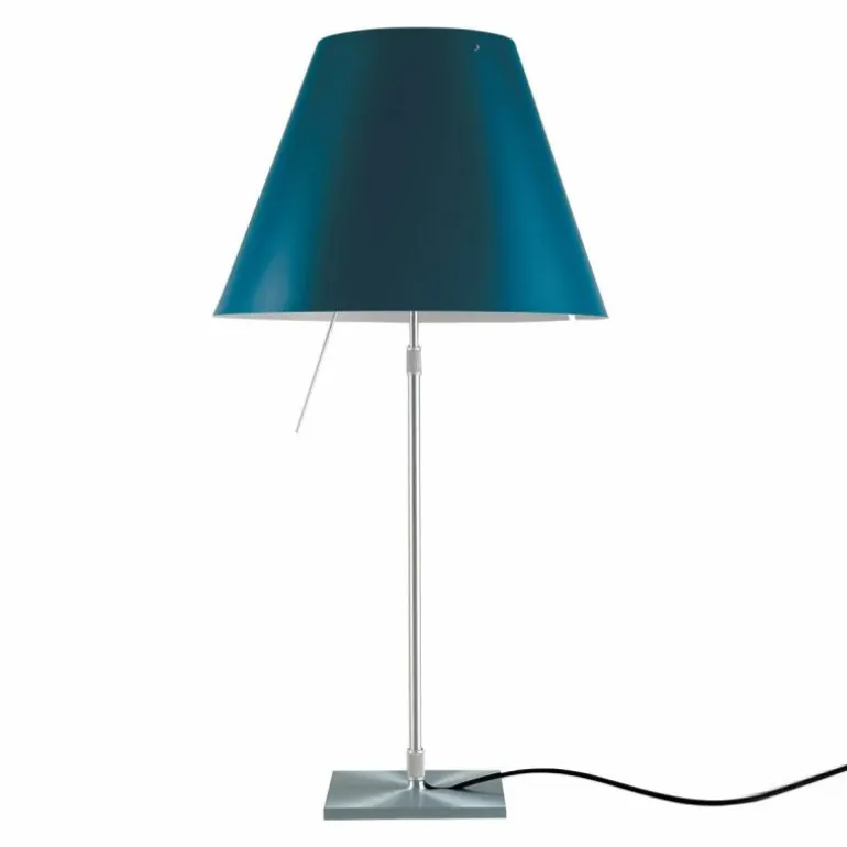 De Luceplan Costanza Tafellamp is in hoogte verstelbaar met een hoogte van 76 centimeter tot 110 centimeter. De lampenstandaard is naar keuze uitvoerbaar in aluminium, zwart of messing. r