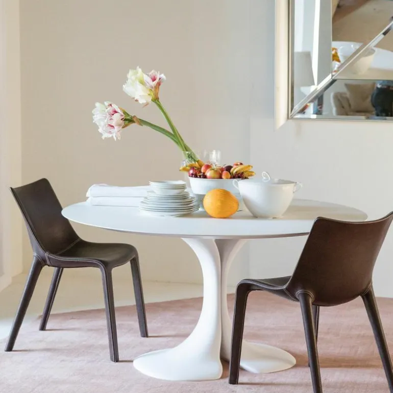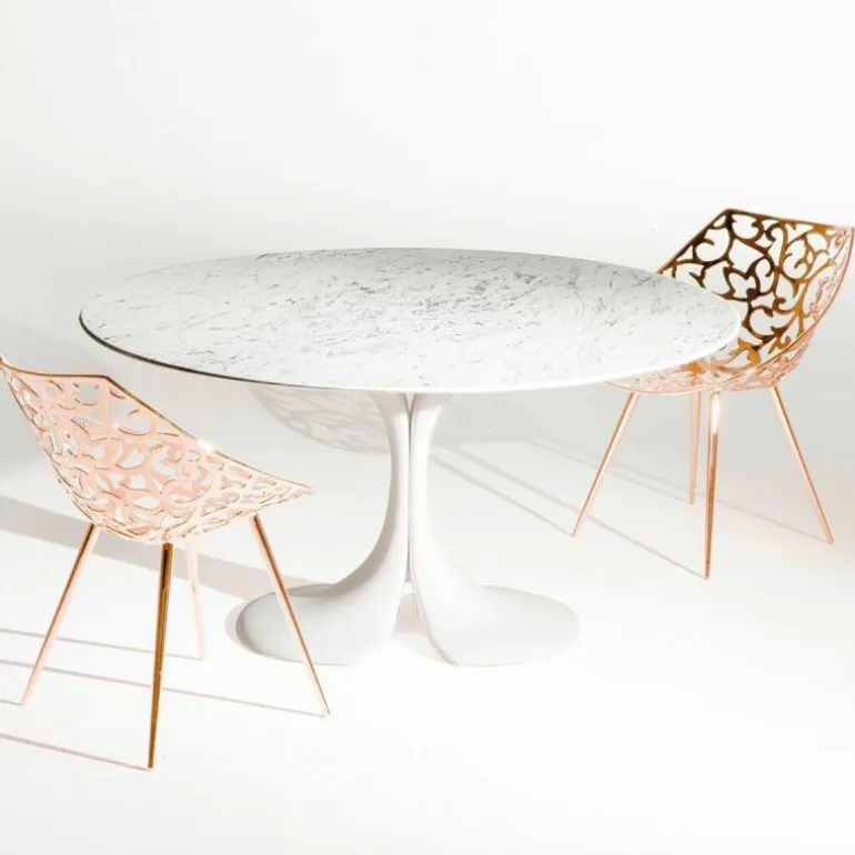 Online kunt u twee uitvoeringen van deze tafel direct bestellen: een uitvoering met een blad van wit Carrara marmer en een wit onderstel van Crystalplant, en een uitvoering met een blad van zwart Nero Marquina marmer met een onderstel van zwart gelakt Crystalplant. Heeft u een ander formaat of uitvoering dan de varianten die online verkrijgbaar zijn in gedachten? Neem contact op met onze interieurspecialisten, zij helpen u graag verder. Naast deze schitterende ronde uitvoering is de Didymos eettafel ook uitgebracht in een ovale uitvoering, deze kunt u bij de productfamilie terugvinden.r