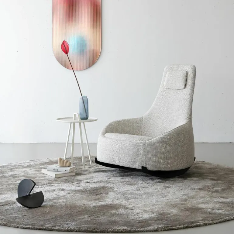 Samen met de ervaren stoffeerders wordt een zeer duurzame afwerking gerealiseerd. Het schommelonderstel dat bestaat uit zogenaamde ‘houten schenkels’ is uitvoerbaar in wit geolied eiken, zwart carbon gebeitst eiken of mat gelakt noten. Onder het hout is een rubberprofiel gemonteerd, zodat de vloer niet beschadigd tijdens het schommelen in de fauteuil. r