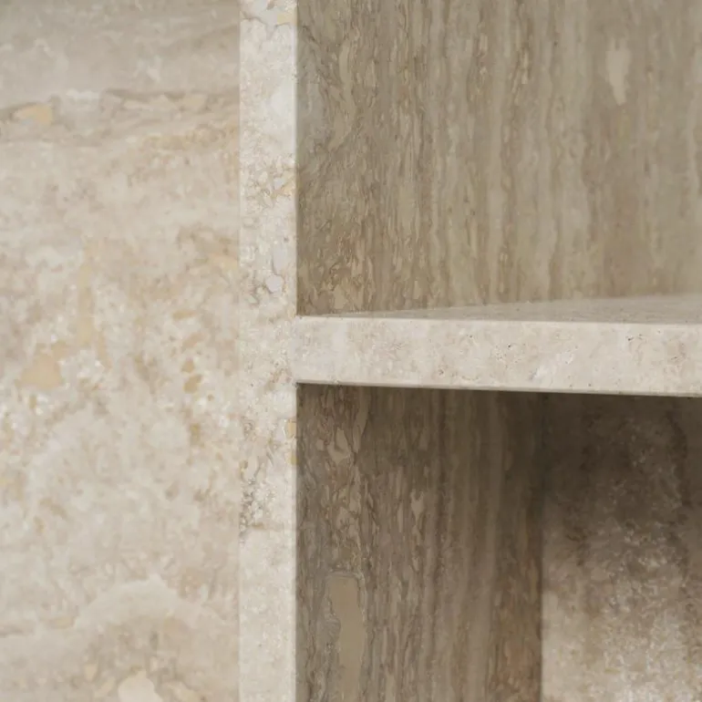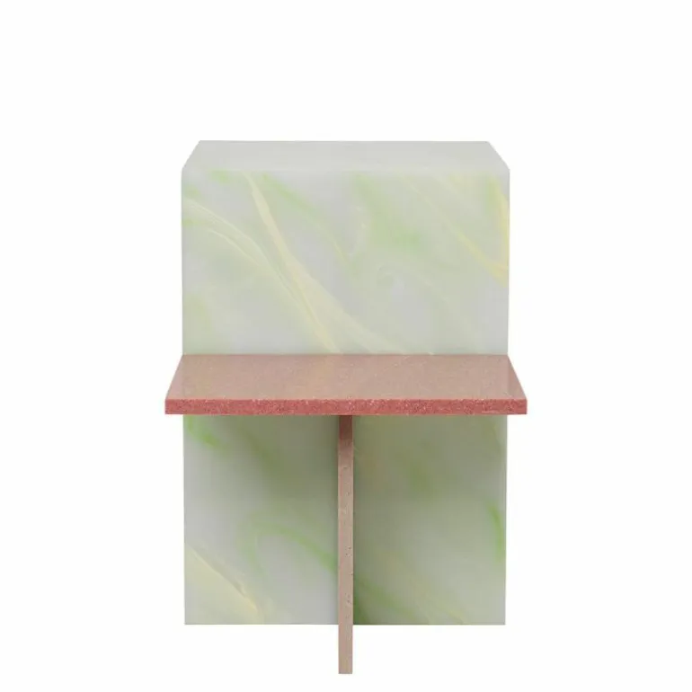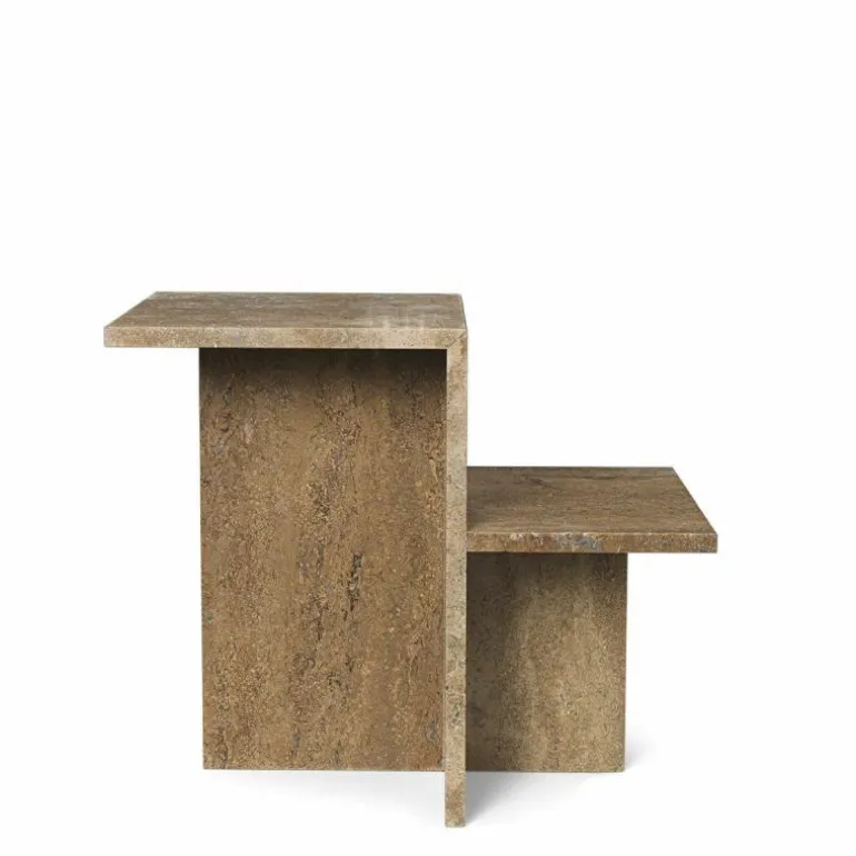 De Distinct Bijzettafel is verkrijgbaar in twee varianten die verschillen in kleur en materiaalgebruik. De bruine uitvoering is gemaakt van zandkleurig kalksteen, de andere bijzettafel is gemaakt van verschillende soorten acrylsteen.