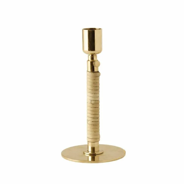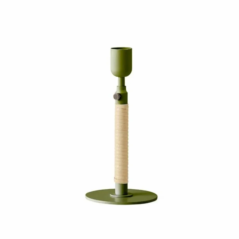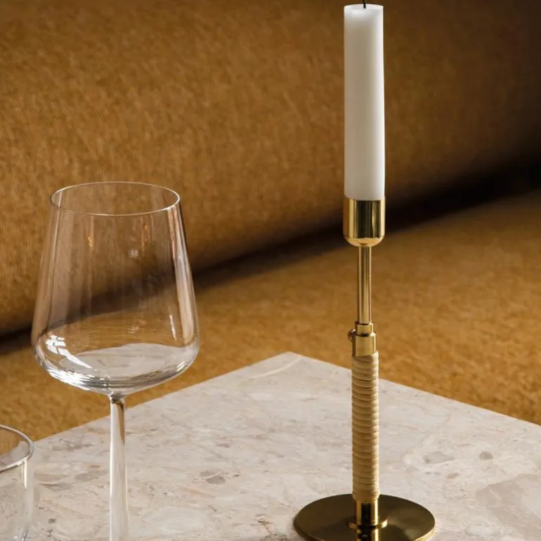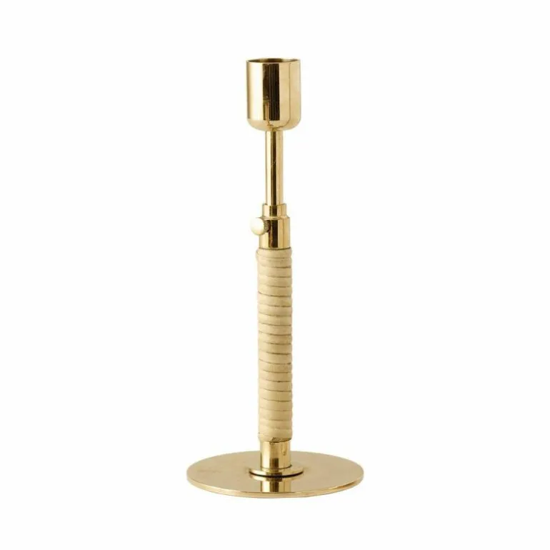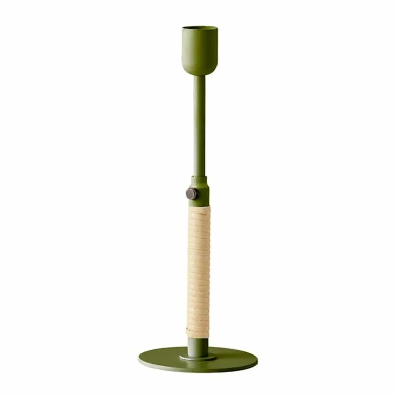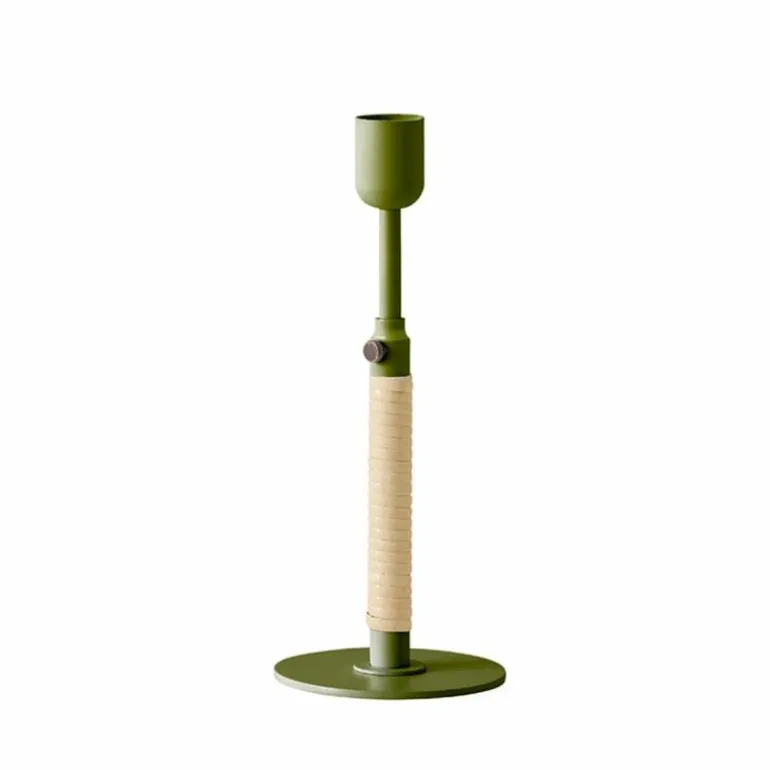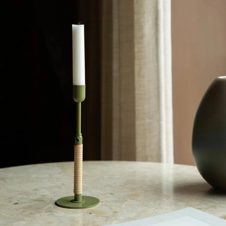 De Duca Kandelaar is gemaakt van gepolijst messing dat aan de onderzijde strak is omhuld met rotan. Daarnaast heeft u ook de keuze uit een stalen variant in een olijfgroene kleur. Deze combinatie van uiteenlopende materialen zorgt voor een romantische en klassieke uitstraling en voegt een intiem en warm gevoel toe aan ieder interieur.