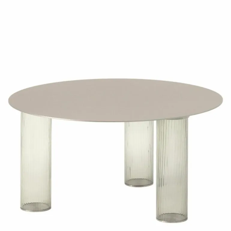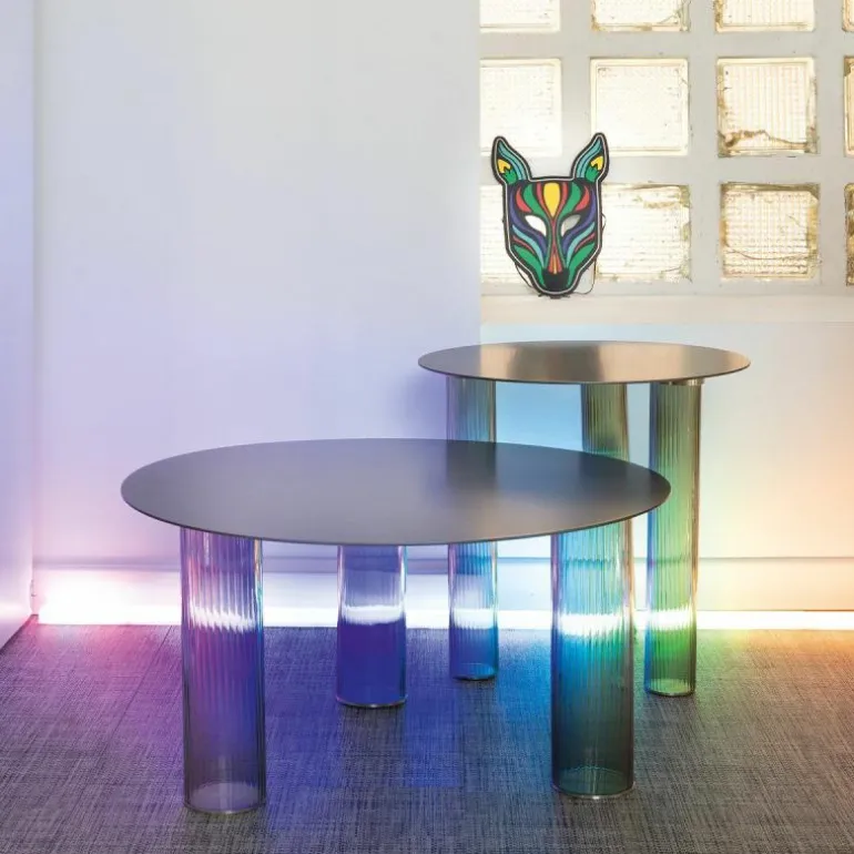 De Echino Salontafel heeft een rond tafelblad van 4 millimeter dik en is gemaakt van staal. Bovendien is het tafelblad verkrijgbaar met een naturel- of een zwarte nikkel-satijnen afwerking. De drie tafelpoten zijn gemaakt van drielaags geblazen glas en is verkrijgbaar in smokey grey en amber. De salontafel heeft een diameter van 68 centimeter en is 34 centimeter hoog. r