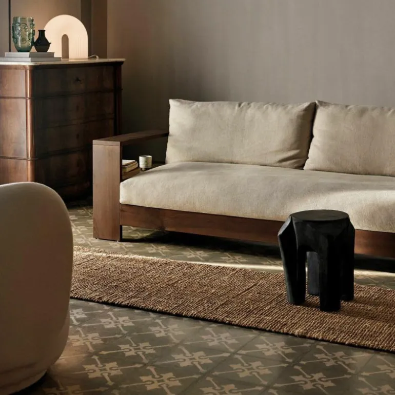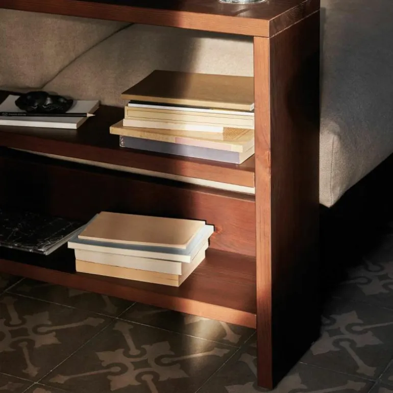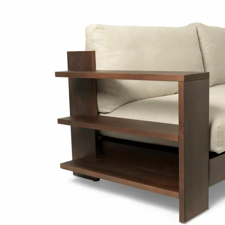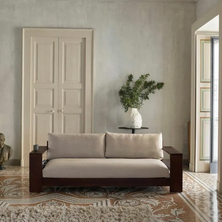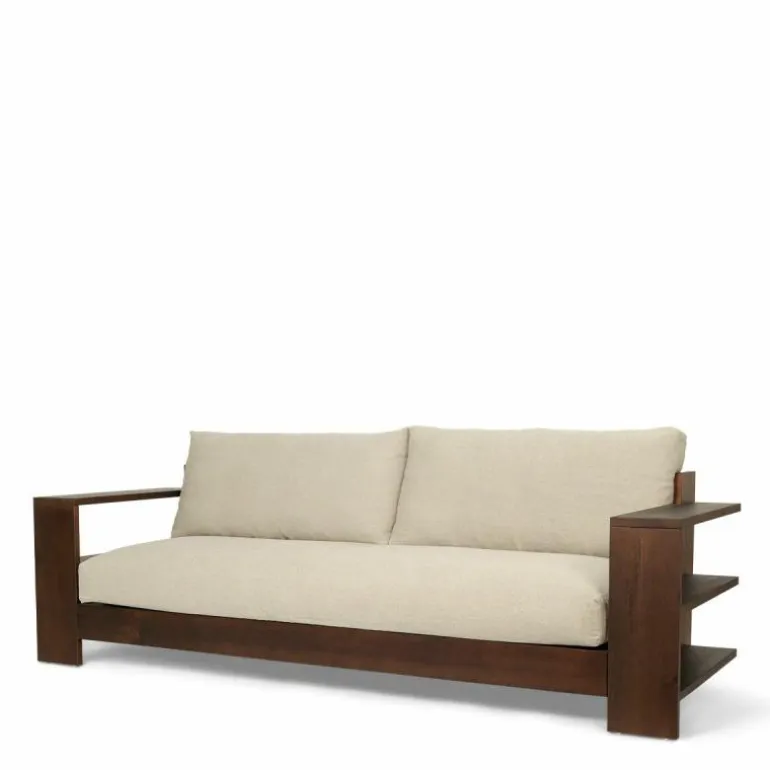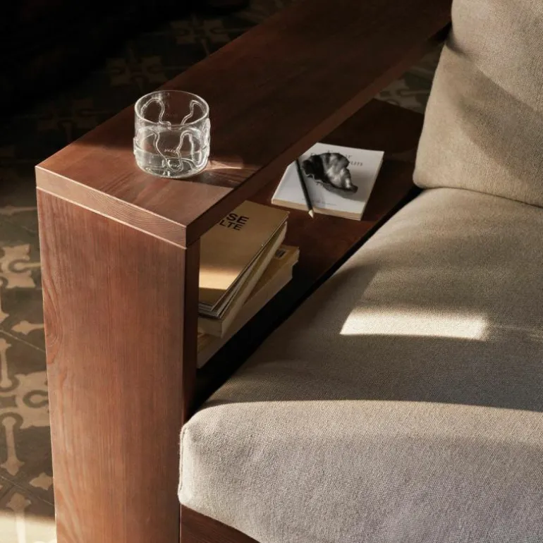 Het frame van de Edre Bank is gemaakt van massief, donker gebeitst en geolied dennenhout. De kussens bestaan uit schuim en gerecycled polyester en zijn bekleed met een stoffen hoes van 100% linnen. De zitting van de bank is voorzien van een antislip stof die de comfortabele kussens perfect in positie houden.