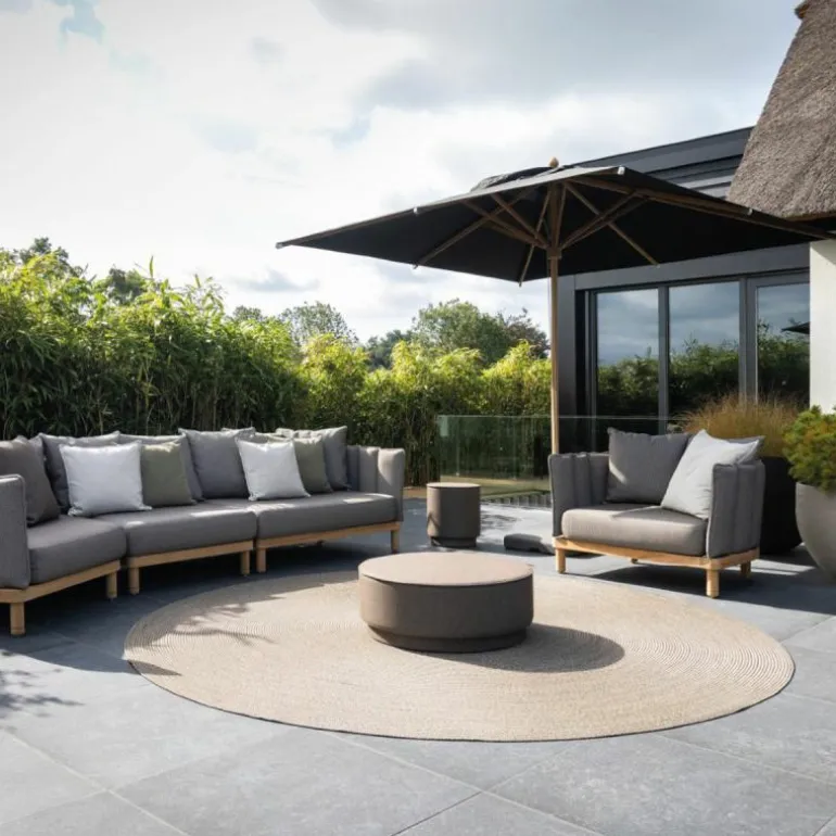 De Elena Parasol heeft een frame dat is vervaardigd uit teakhout en heeft een doek van Olefin stof. Deze stoffering is bestand tegen schimmel, insecten en chemicaliën en is bovendien eenvoudig te reinigen en onderhouden. Dit maakt de parasol bestand tegen verschillende weersomstandigheden. Tevens is het doek voorzien van een ventilatieopening waardoor de wind die onder de parasol komt weggeleid wordt. r