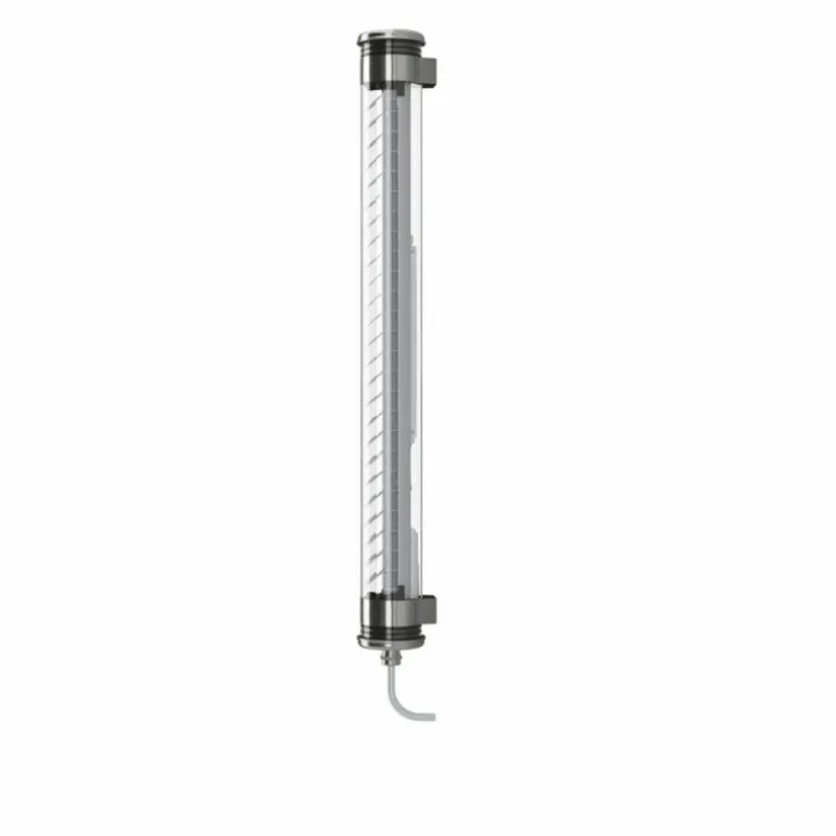 De transparante cilinder is vervaardigd uit kristalkwaliteit polycarbonaat. De behuizing, die bestaat uit eindkappen en fixeerriemen is vervaardigd uit roestvrij staal van maritieme kwaliteit. De geïntegreerde LED module straalt een warm wit licht uit (2700 K). r