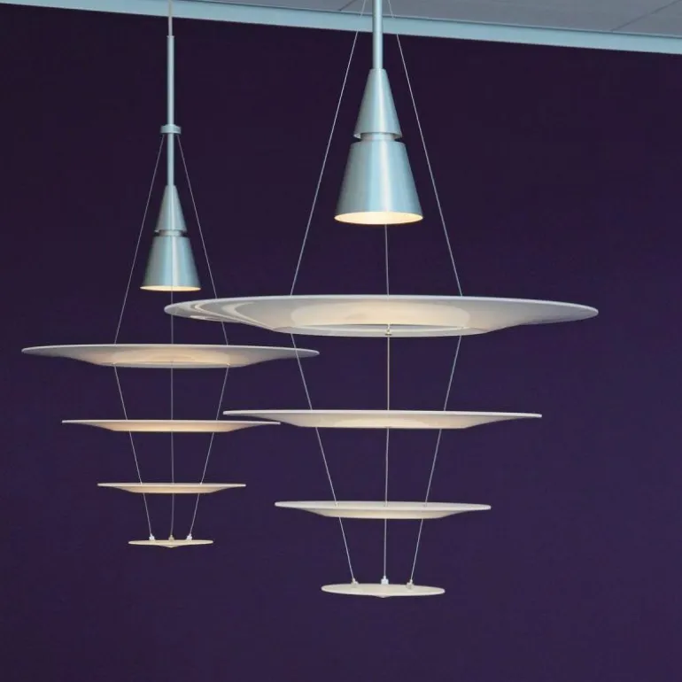 Boven de zwevende cirkels hangt een strakke kegel waarin de lichtbron wordt bevestigd. Uit deze kegel schijnt een neerwaartse lichtstraal door de verschillende lagen cirkels heen. Op het matte oppervlak aan de bovenzijde van de cirkels wordt het licht elegant verspreid, en aan de glanzende onderzijde van de cirkel wordt het licht optimaal weerkaatst. De kegel en pendelbuis zijn beide gemaakt van geborsteld en gecoat aluminium en de cirkels zijn gemaakt van acrylaat. De uitvoering in aluminium wordt geleverd met een transparante snoer en de zwarte uitvoering wordt geleverd met een zwarte snoer.r