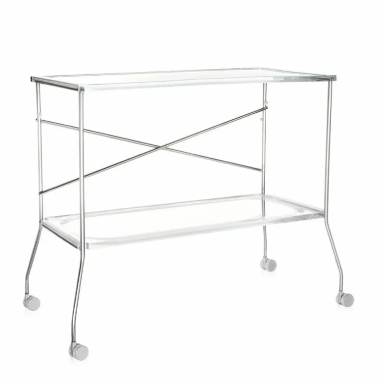 De Flip van Antonio Citterio en Toan Nguyen voor Kartell is een praktische serveerwagen. Dit door zijn opklapbare bladen.r