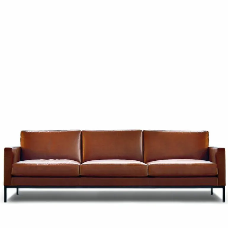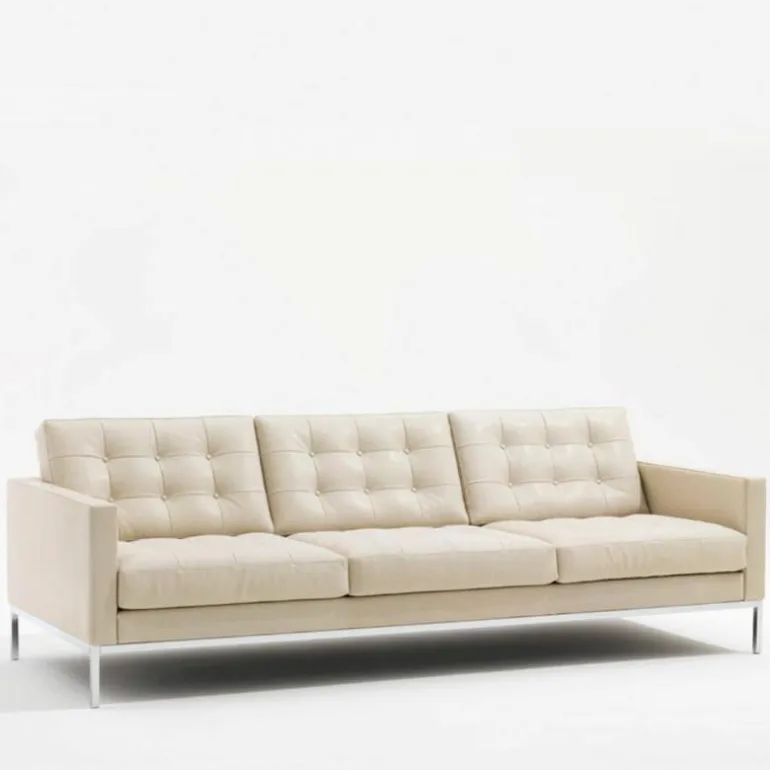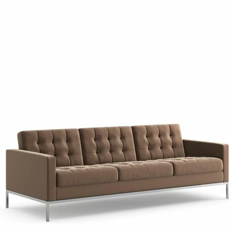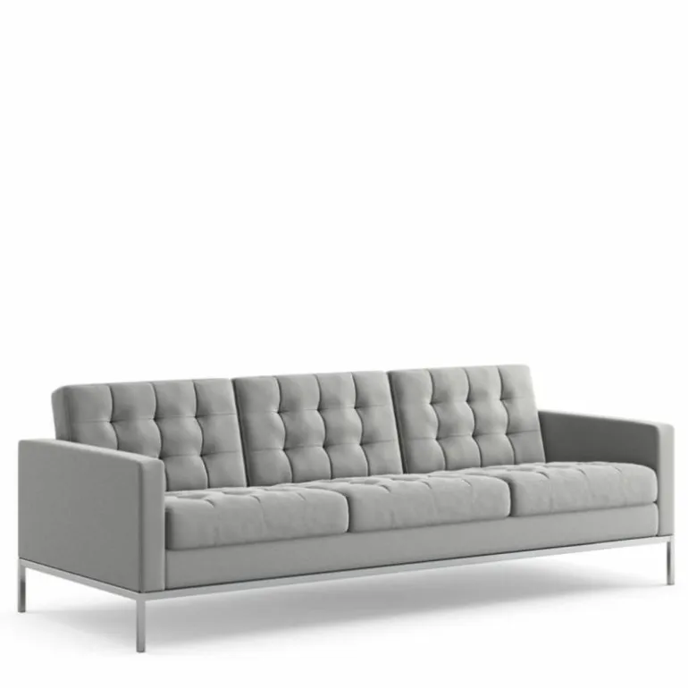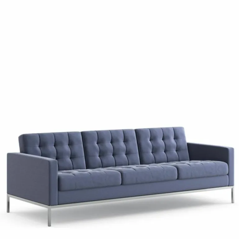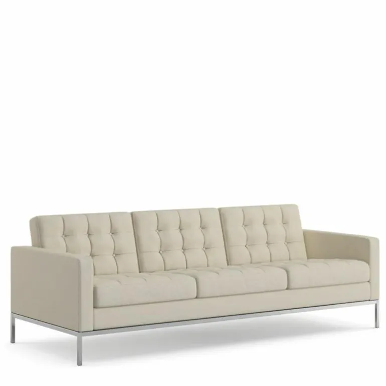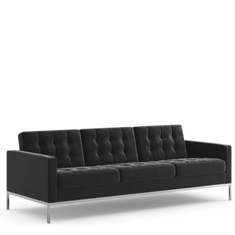 De Knoll Florence Knoll Sofa 3-zits is een ontwerp van – de naam zegt het al – Florence Knoll. Florence studeerde aan de Cranbrook Kunstacademie, waar ze les kreeg van designmeesters Gropius, Breuer en Mies. In 1941 ontmoette ze Hans Knoll in New York, die toen net bezig was zijn meubelbedrijf van de grond te tillen. De ontmoeting bleek een gouden combinatie. Samen maakten ze Knoll tot een internationaal bekend designlabel waarin de standaard voor het naoorlogse interieur in Amerika werd bepaald. De twee trouwden en na Hans zijn dood in 1955 nam Florence de leiding over. In deze tijd ontwierp ze de Florence Knoll Sofa, een welbekend ontwerp dat duidelijk geïnspireerd is op de Barcelona Chairs van een van haar mentoren, Mies van der Rohe. Op haar 100e verjaardag werd een vernieuwde – Relax – variant op de markt gebracht. Deze heeft een diepere, zachtere zit door de vulling van watten bovenop het polyurethaan schuim.r